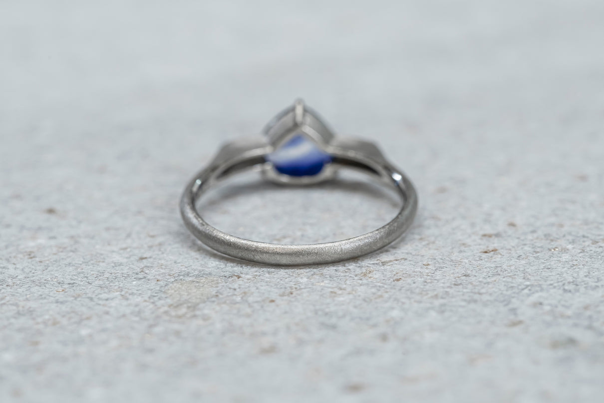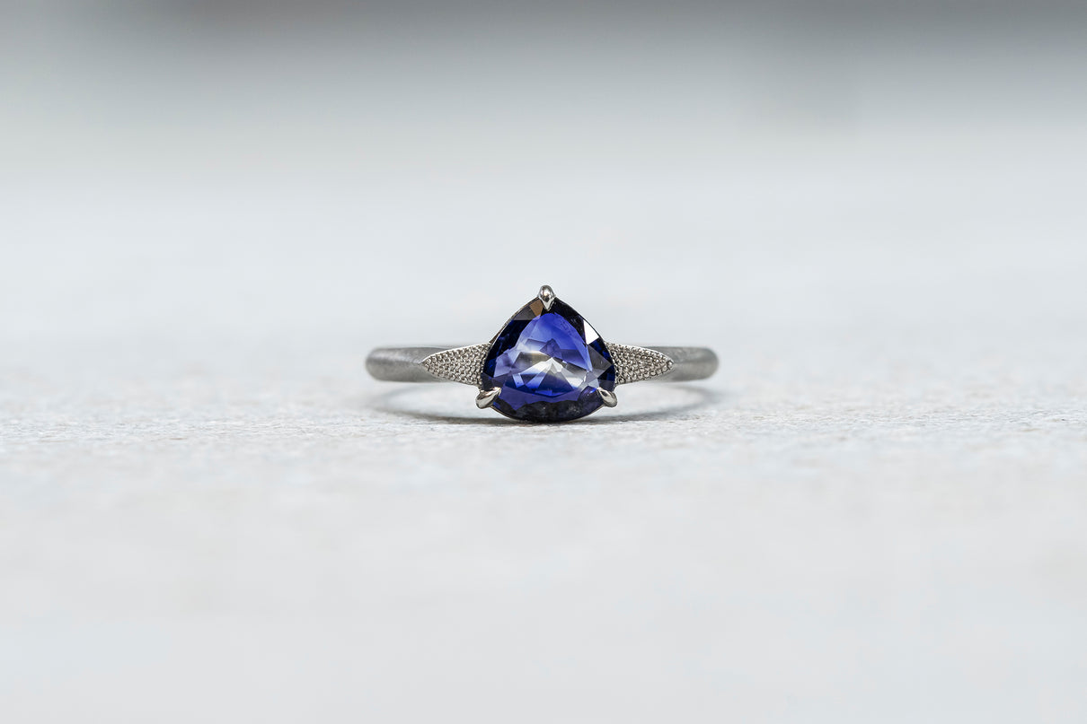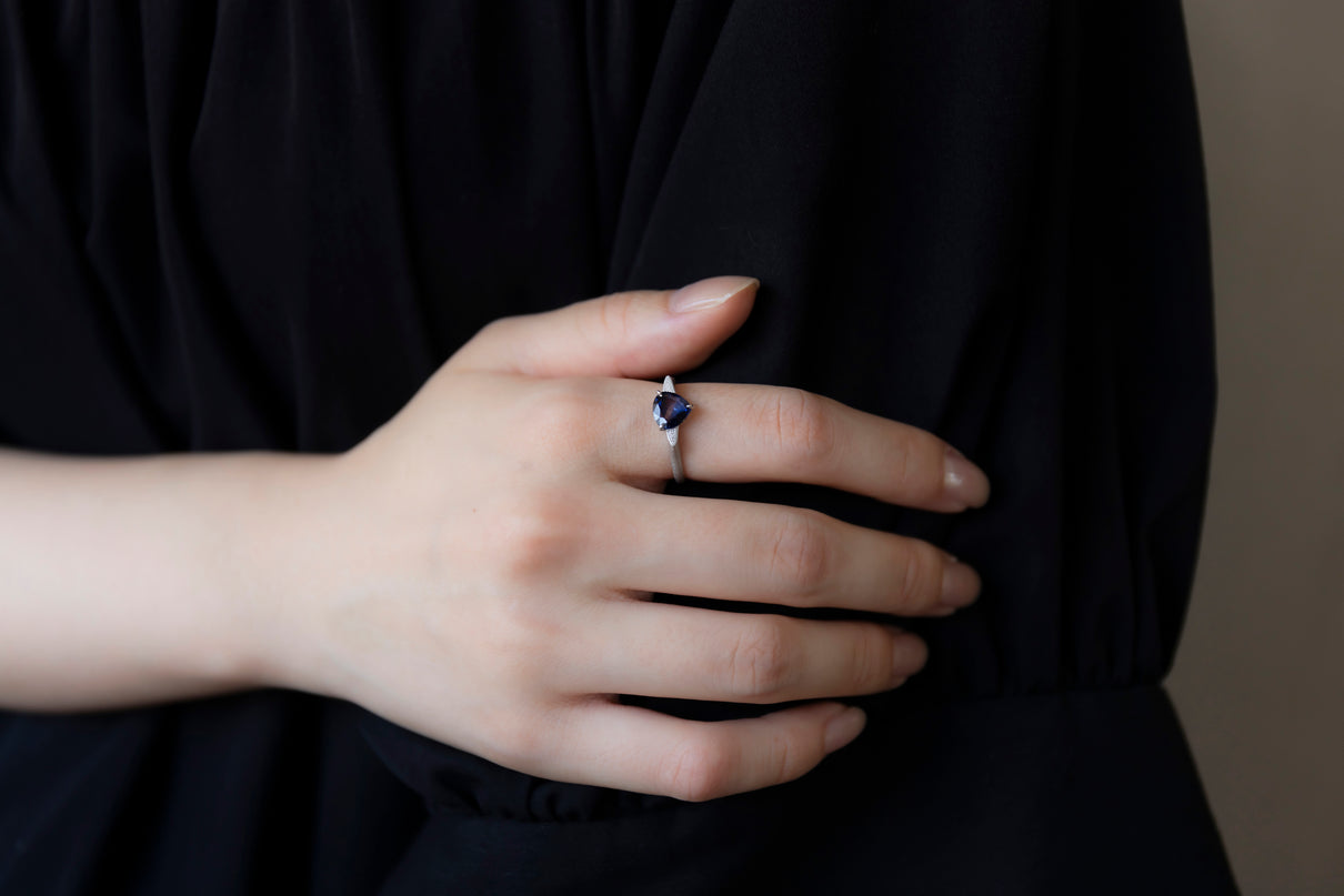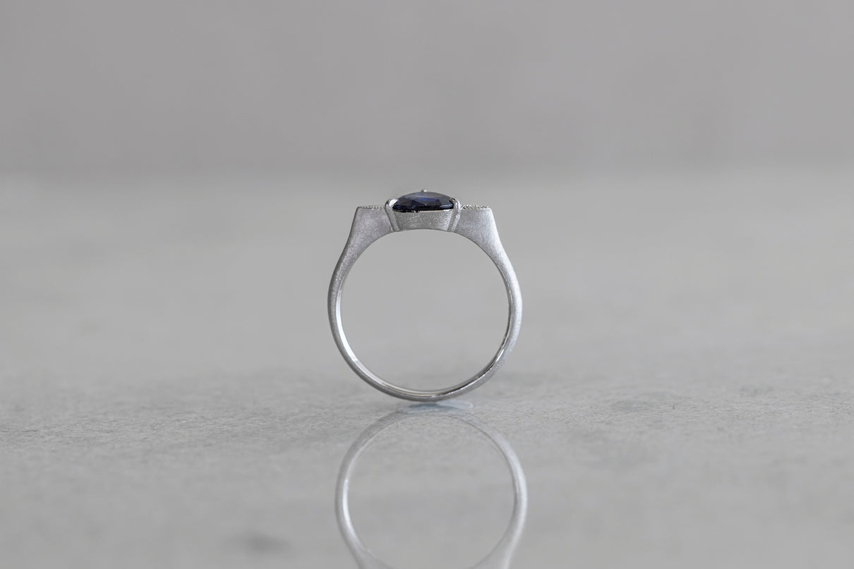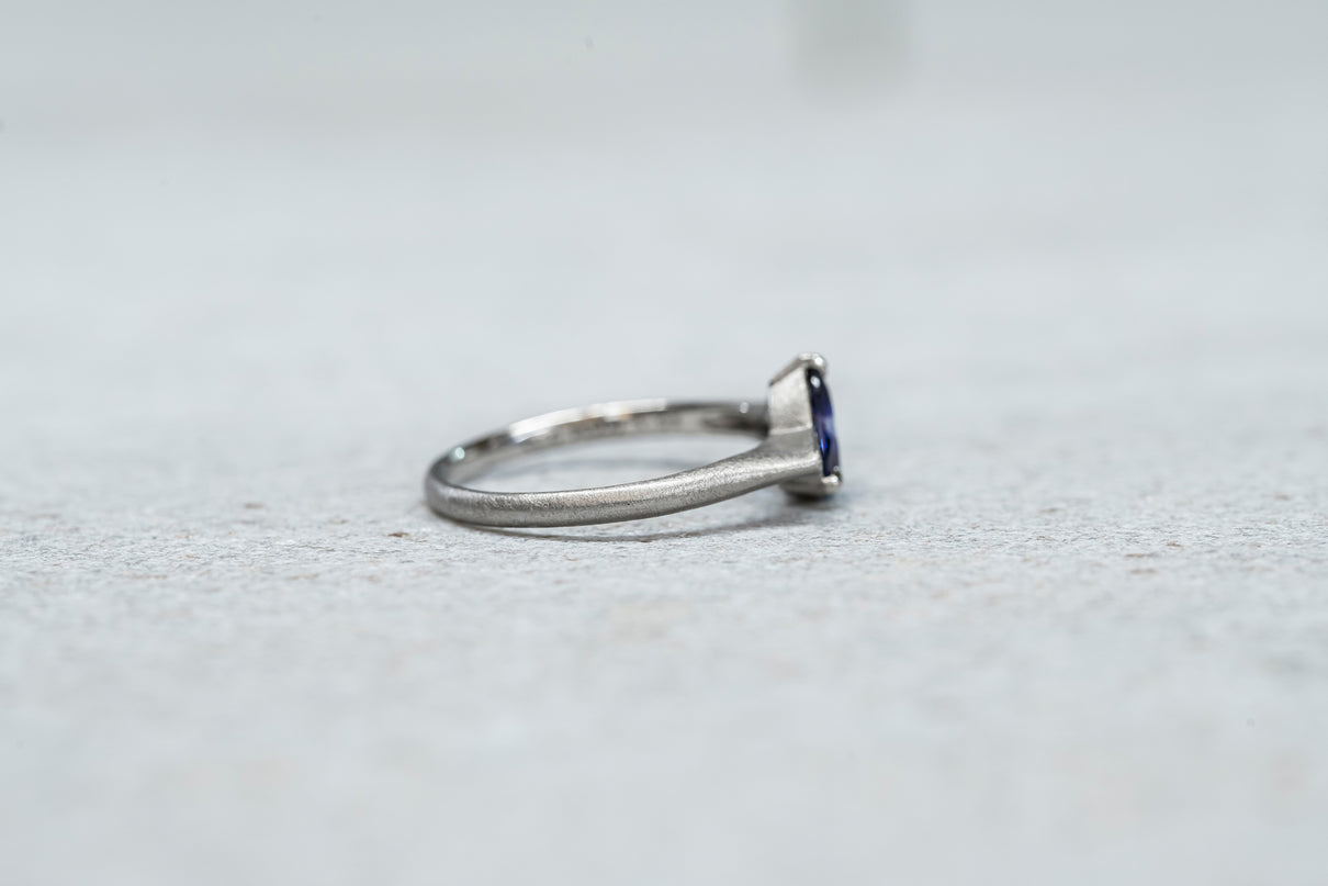中央に一筋の光が差し込むように、直線的に切り替わる色のバランスが印象的なバイカラーサファイアを留めた一点もののリング。澄み渡る高い透明度を持ち、サファイアらしい上品で神秘的な青色が目を引くドロップカットのルースを3本の爪で留めたデザインです。サファイアよりも一段低く平面に切り出した石座の両サイドには繊細なミル打ちをあしらい、小さく羽を広げるようなシルエットに仕立てました。微細なマットテクスチャーを施したプラチナのリングアームは横から見た時の構築的な姿も印象的で、様々な角度から多様な表情を楽しむことができるリング。9月の誕生石としても親しまれているサファイアは、9月生まれの方の特別なお守りとしてもお勧めです。