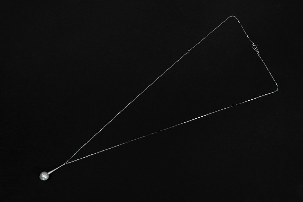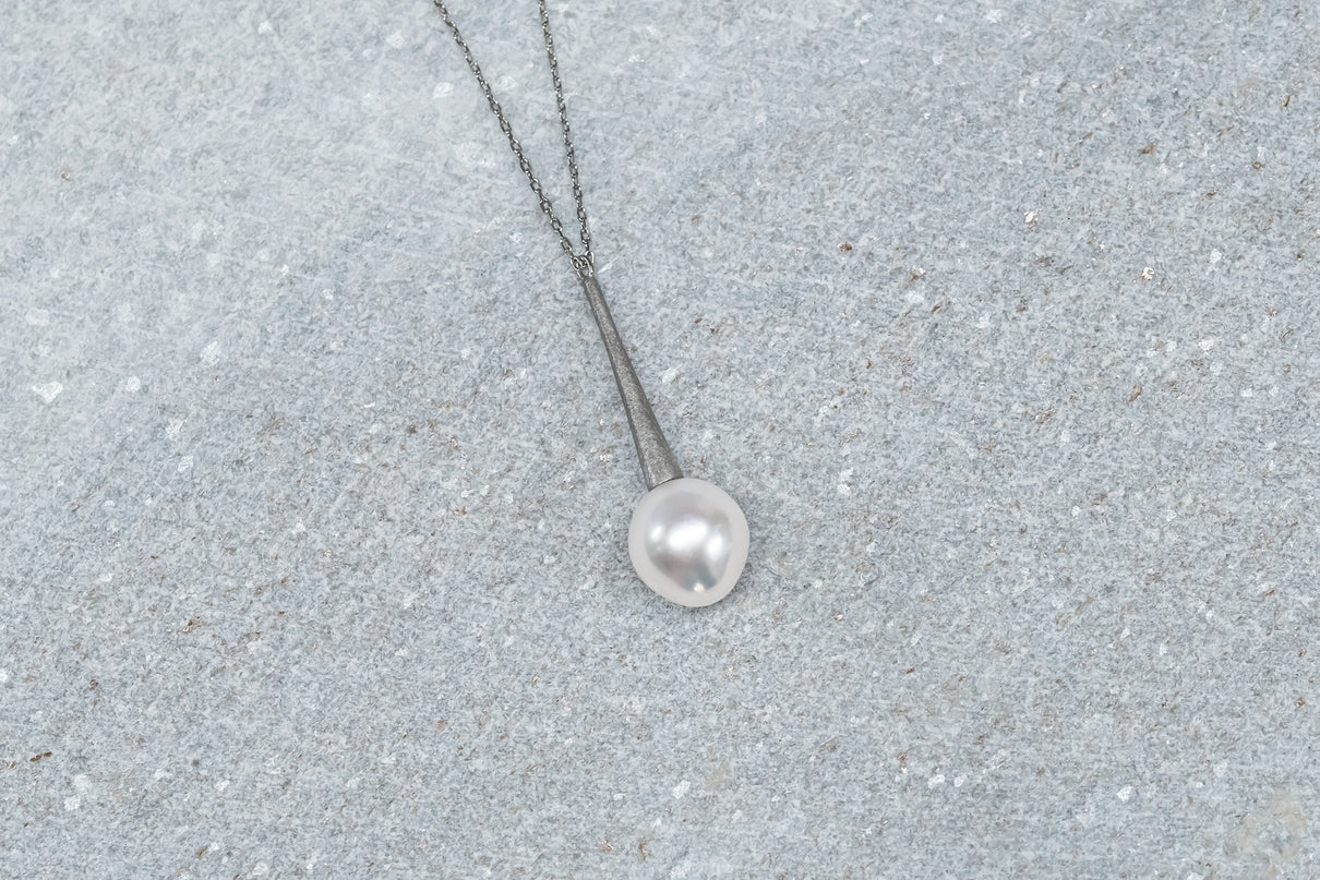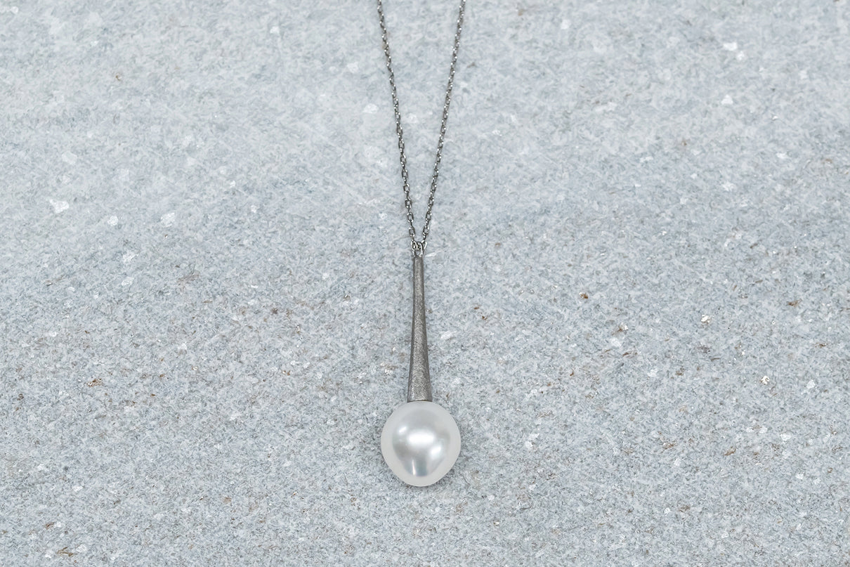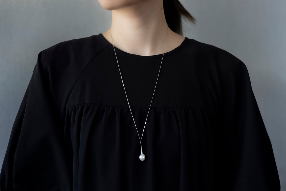 雨粒の軌跡のようなフォルムのプラチナに、上質な艶をもつ淡水パールを留めたネックレス。長い円錐型の部分にはマットなテクスチャーを施し、"雨滴"のように、凛と静かに滴るシャープなデザインにしました。縦ラインのすっきりとした雰囲気のネックレスは、胸元でコーディネートのアクセントになるように、ややロング丈に仕立てています。裾がややすぼまったようなユニークなフォルムをした淡水パールは、シンプルでありながらも個性が光るアイテムです。