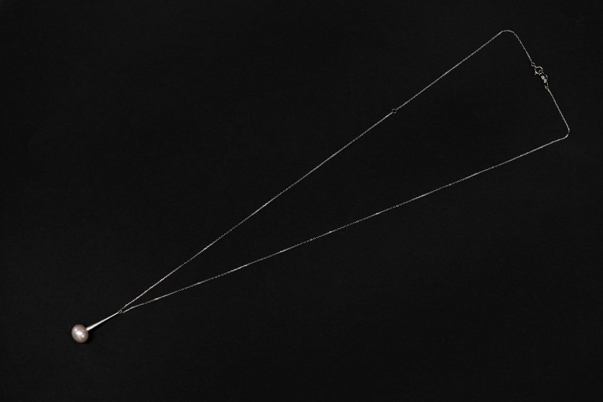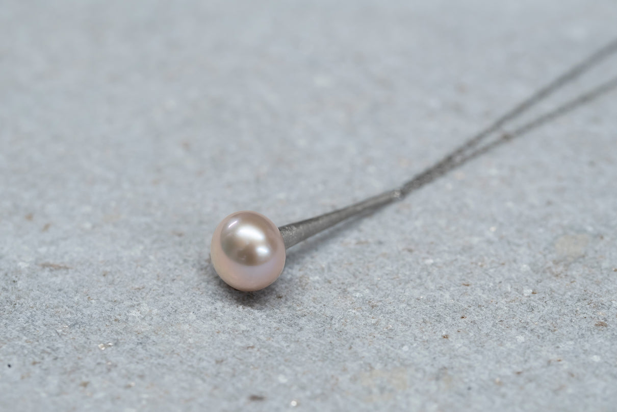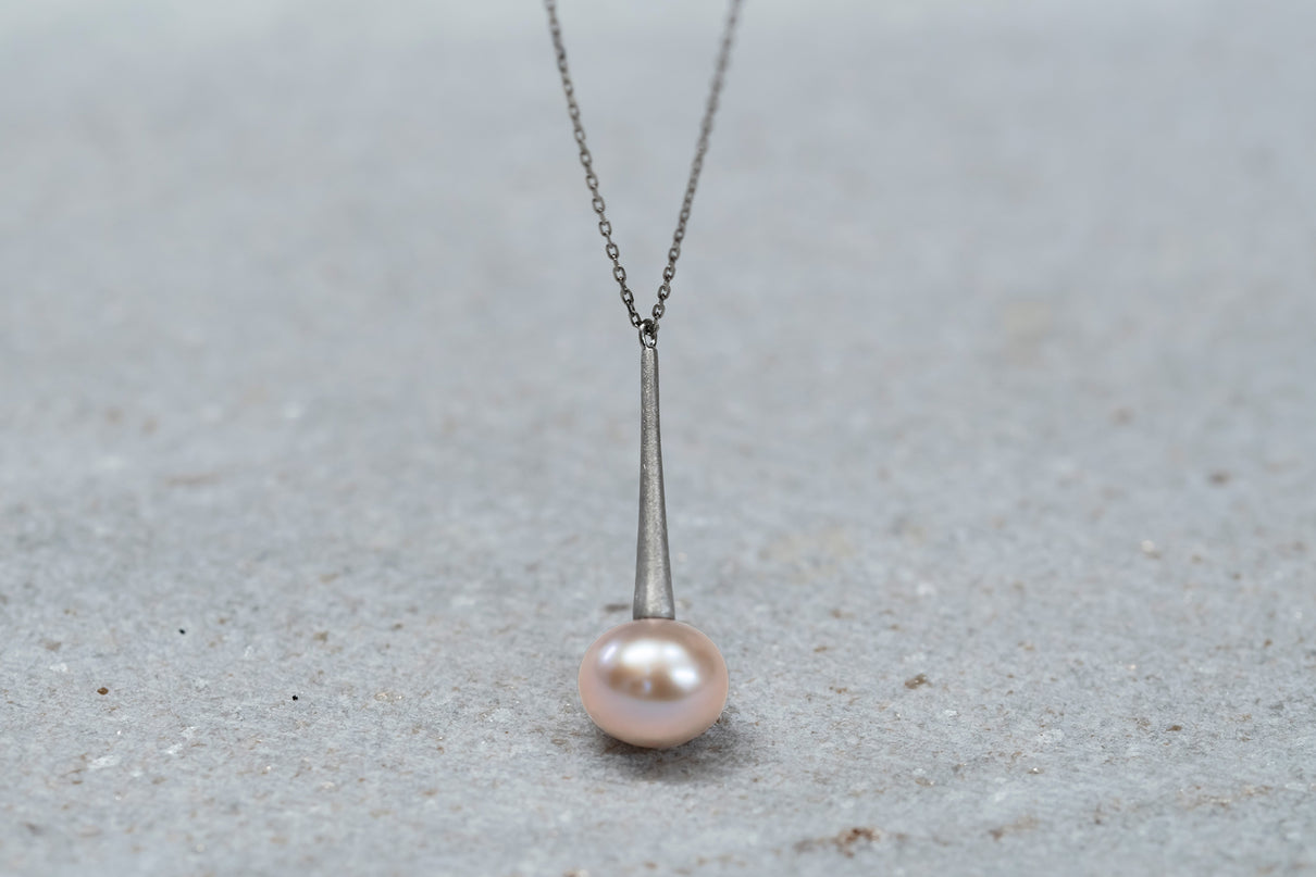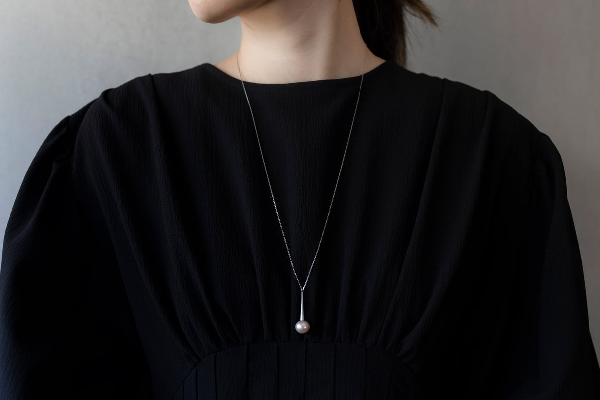 雨粒の軌跡のようなフォルムのプラチナに、落ち着いたピンク色の艶やかな淡水パールを留めたネックレス。長い円錐型の部分にはマットなテクスチャーを施し、"雨滴"のように、凛と静かに滴るシャープなデザインにしました。縦ラインのすっきりとした雰囲気のネックレスは、胸元でコーディネートのアクセントになるように、ロング丈に仕立てています。淡いピンク色の淡水パールはシンプルでありながらも、個性が光るアイテムです。