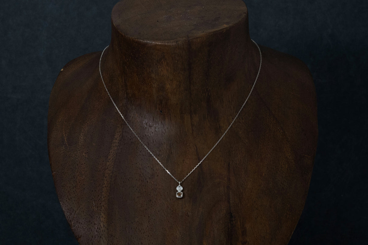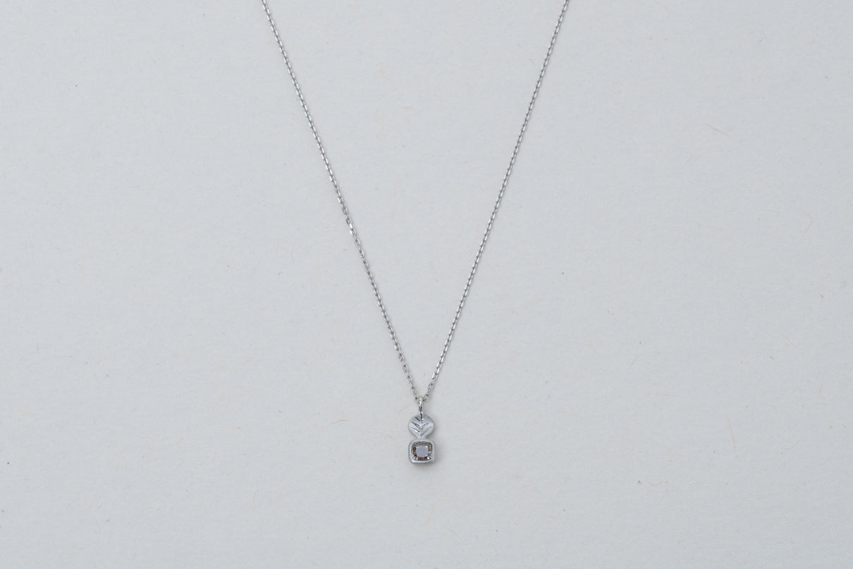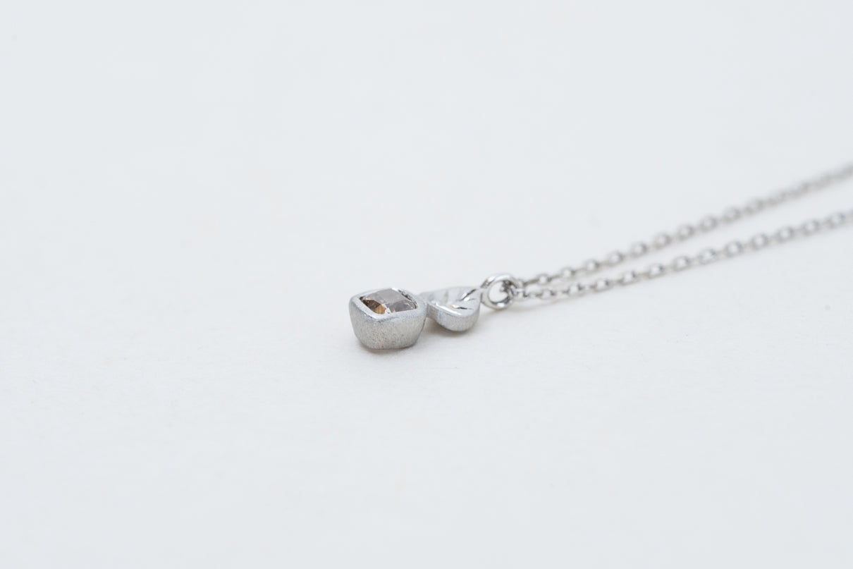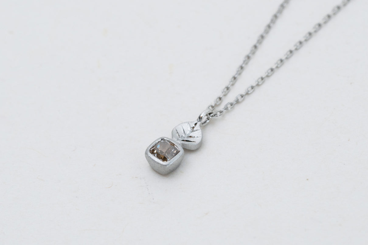 手彫りの葉脈が煌めく小さな葉っぱモチーフのプラチナパーツに、クッションのような膨らみを持つフォルムのスクエアカットのブラウンダイヤモンドを留めた " Leaf " コレクションのネックレス。小ぶりながらも高い透明度と厚みで存在感を放つダイヤモンドを、覆輪留めで優しく包み込むようにセッティングしました。小さく繊細な存在でありながら、ひと匙の個性と印象的な魅力を秘めた、日常の装いを品よく引き立てるデザインです。