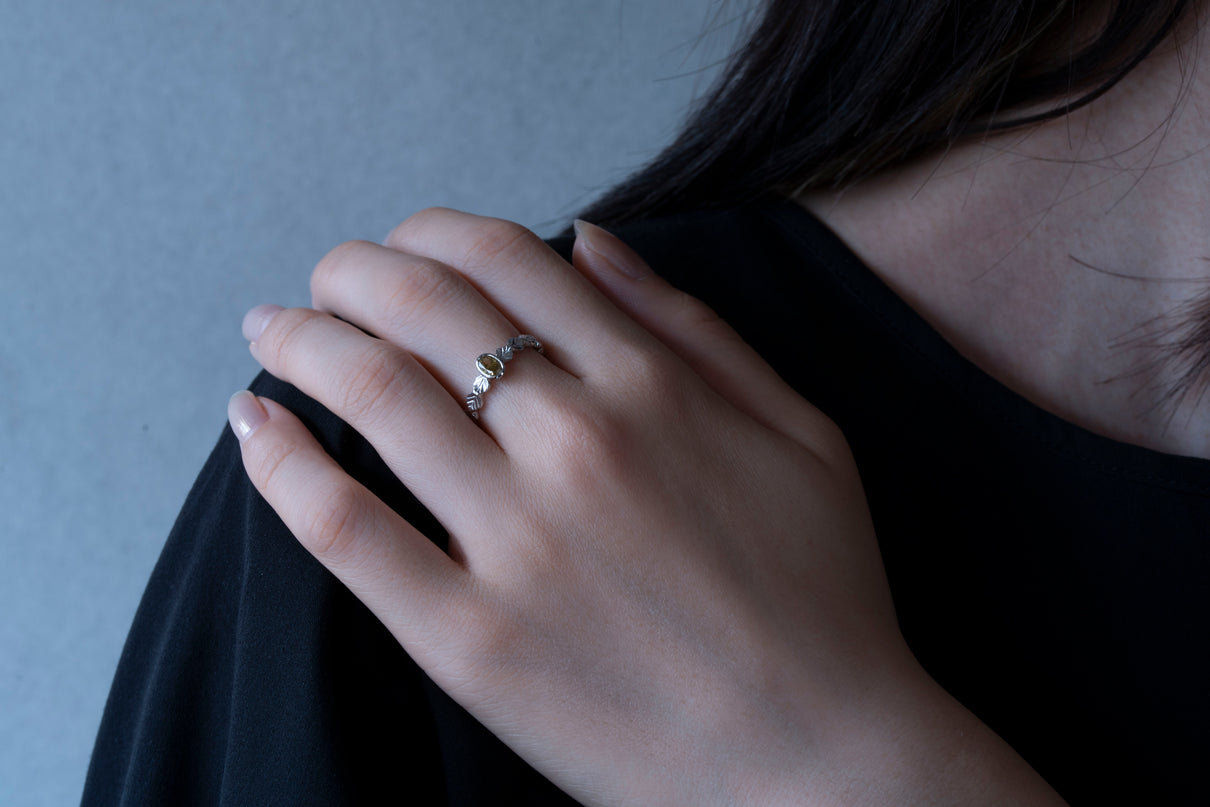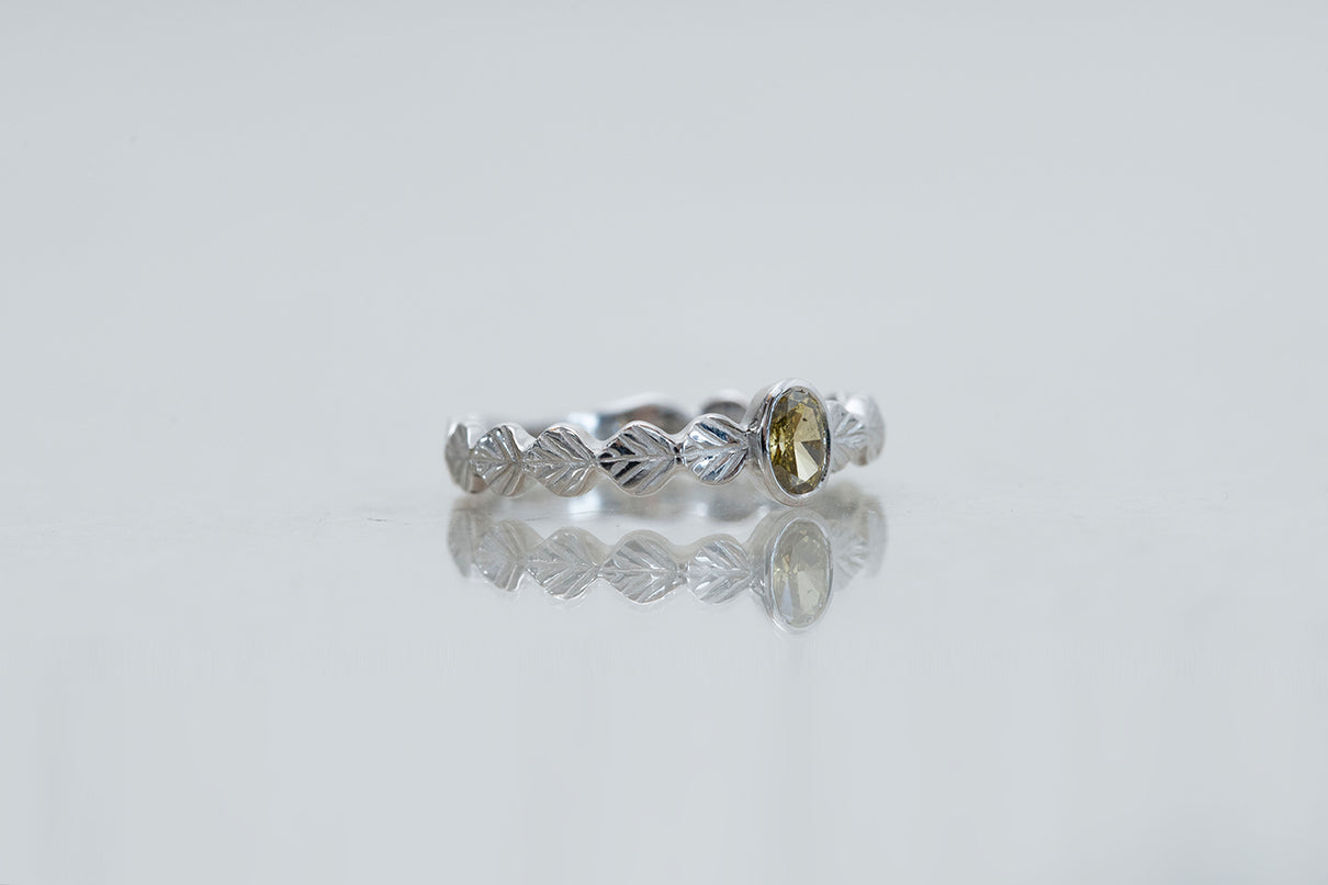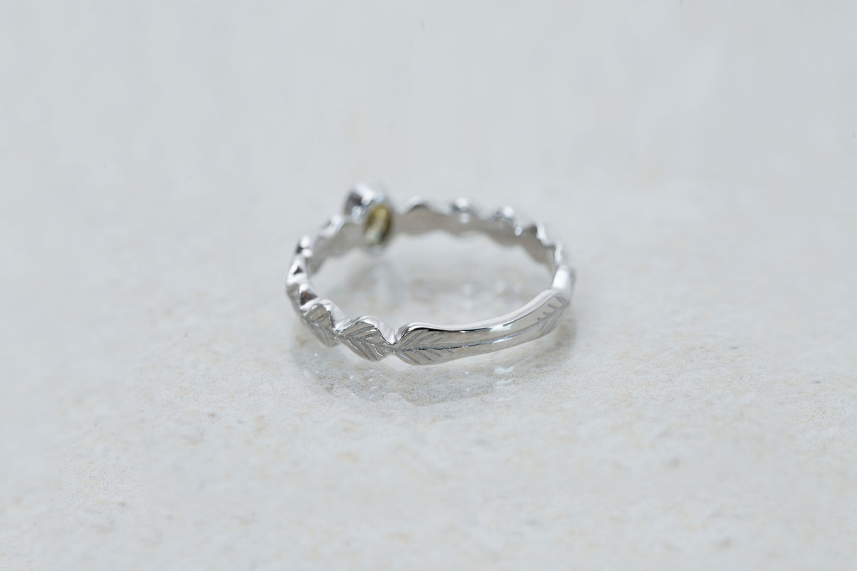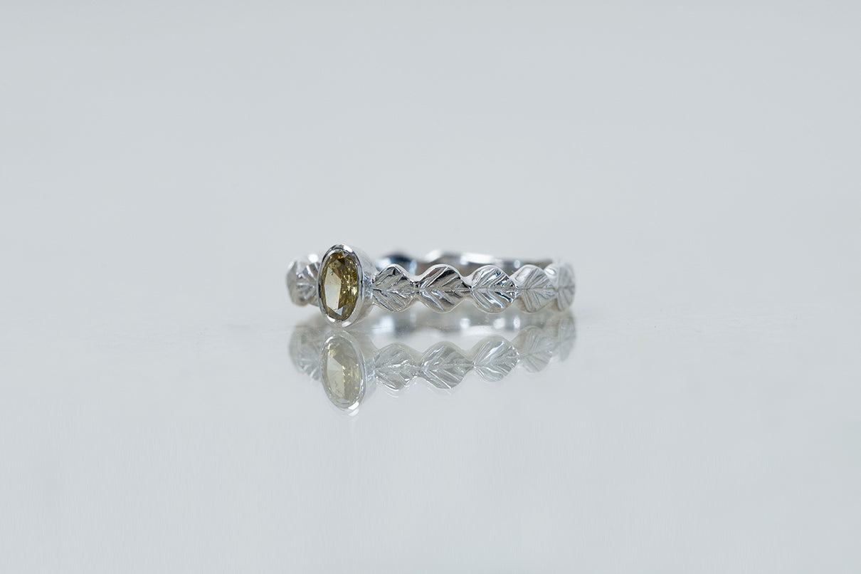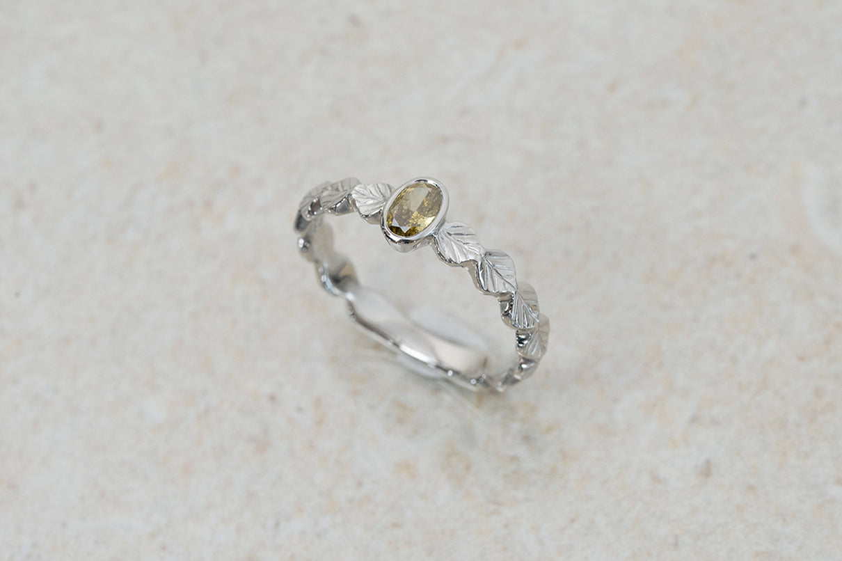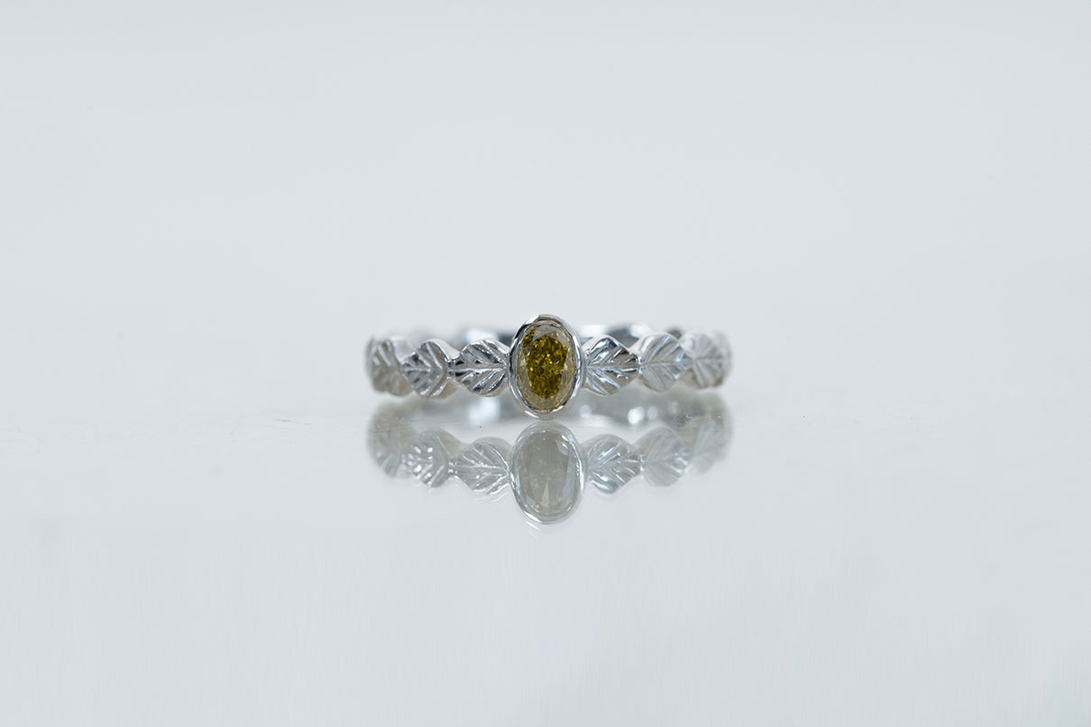 いくつも連なる葉っぱをモチーフに、1枚1枚わずかに異なる表情に遊び心を込めた"Leaf"シリーズの一点もののリングです。眩く煌めく落ち着きのあるイエローカラーのオーバルカットダイヤモンドを、ベゼルセッティングで仕立てました。艶感を持たせた仕上げのプラチナのリングアームが寄り添い、抑揚のある輝きが指元に特別な華やぎをもたらします。アームは葉のサイズが小ぶりなタイプのLeaf little ベース。日常的に身に着けていただくのはもちろん、アニバーサリージュエリーとして特別な贈りものにも最適なアイテムです。