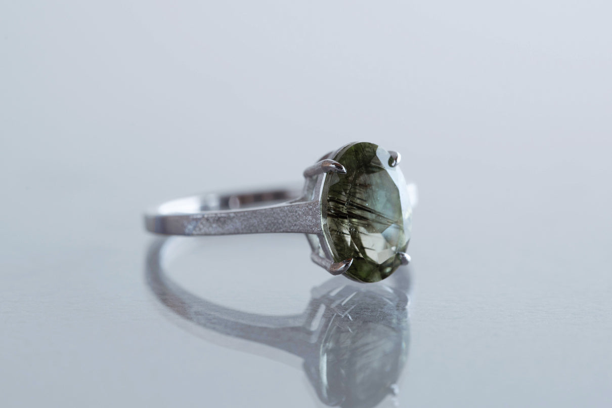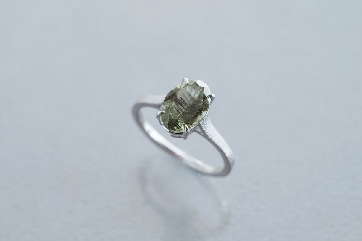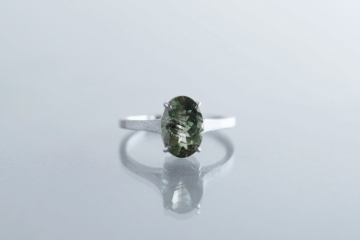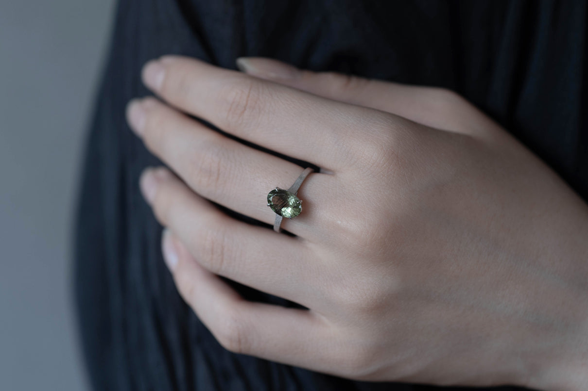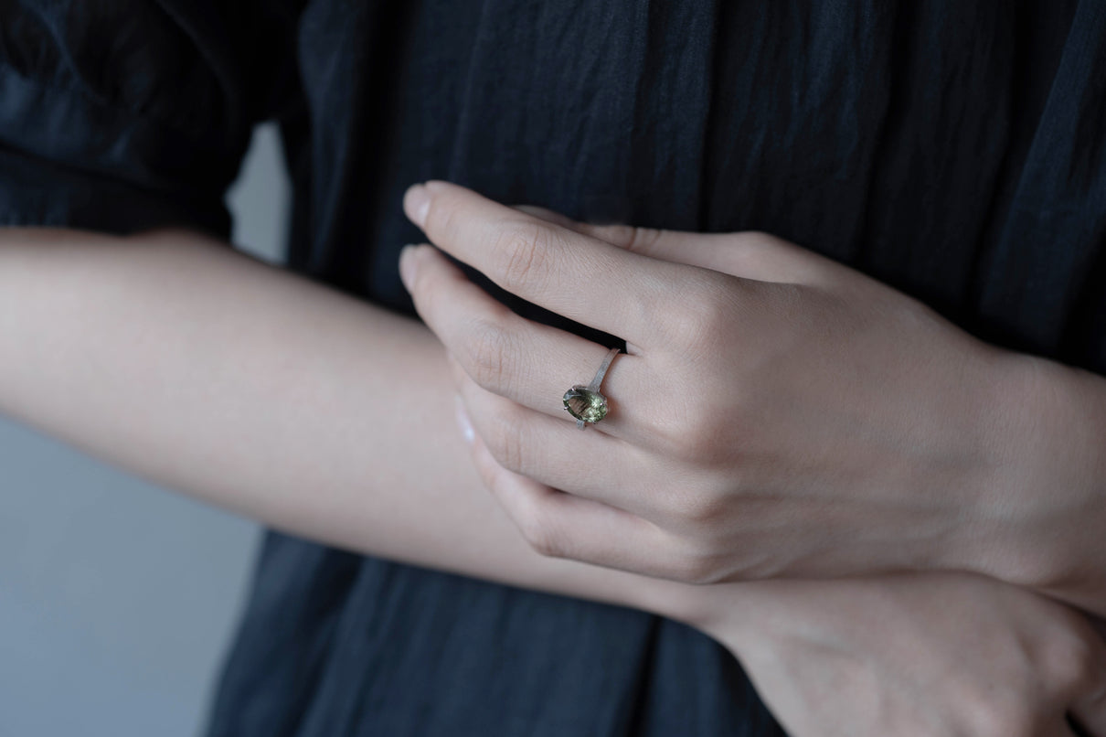 黒色の針状内包物を結晶に閉じ込めたルドヴィジャイトペリドットで仕立てた一点もののリング。この極めて特殊なペリドットは、世界で唯一、パキスタンのスワート渓谷の地だけで産出される非常に希少な宝石です。さらに採れる原石が小さいために産出量も非常に少なく、さらに品質の良いルースはひと握り。こちらはすっきりとした縦長のオーバルカットのピースです。無数の微細なインクルージョンがオリーブグリーンの色彩の中で重なりながら漂う様子は、まるで深い森の一部を切り抜いたかのような静かで幻想的な景色を紡ぎ出しています。一見シンプルに見える華奢なフォルムのリングアームには、実は表情の異なる3種類のテクスチャーを施しました。。上部からサイドにかけては荒目のマットテクスチャーから鏡面へとグラデーションで繋ぎ、側面はより柔らかく細やかなマットに仕上げることで、視点を変えると自然の森同様、様々な表情を見せています。日常の装いに落ち着きのある華やかさを添えるリング。8月の誕生石としても親しまれているペリドットは、8月生まれの方の特別なお守りとして贈りものにも最適なアイテムです。
