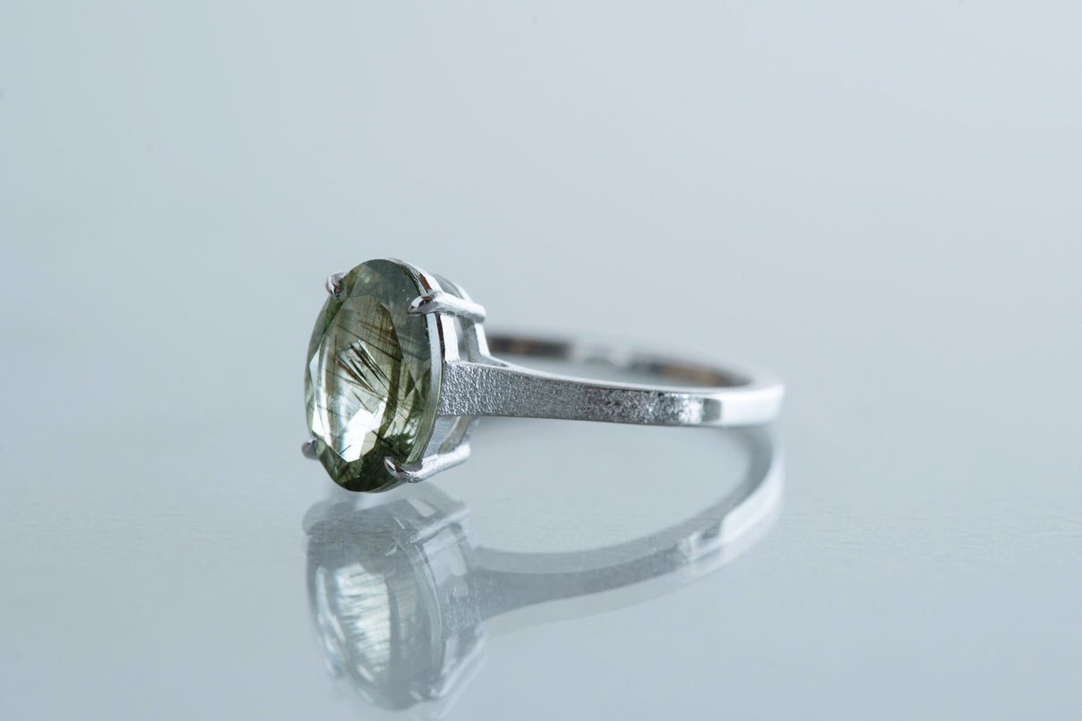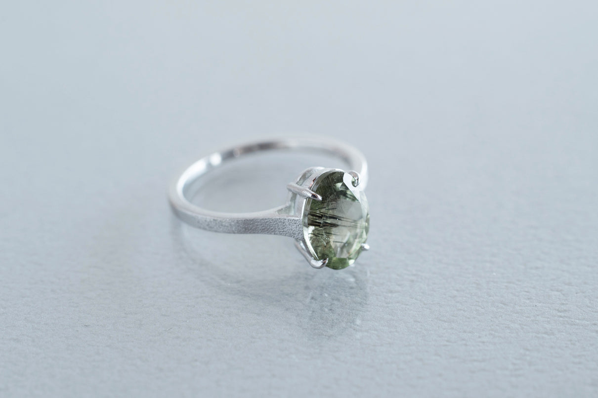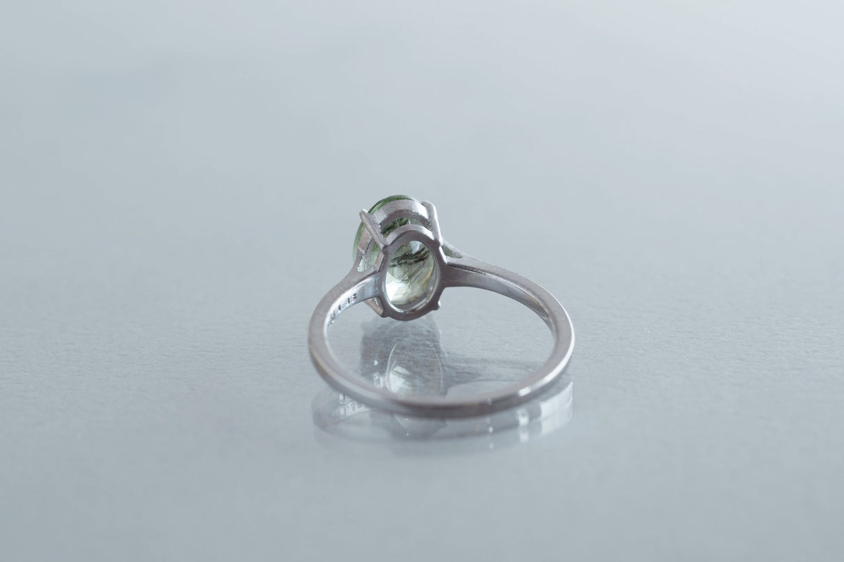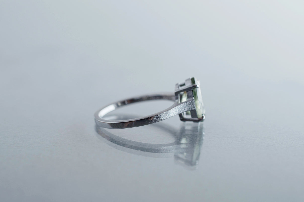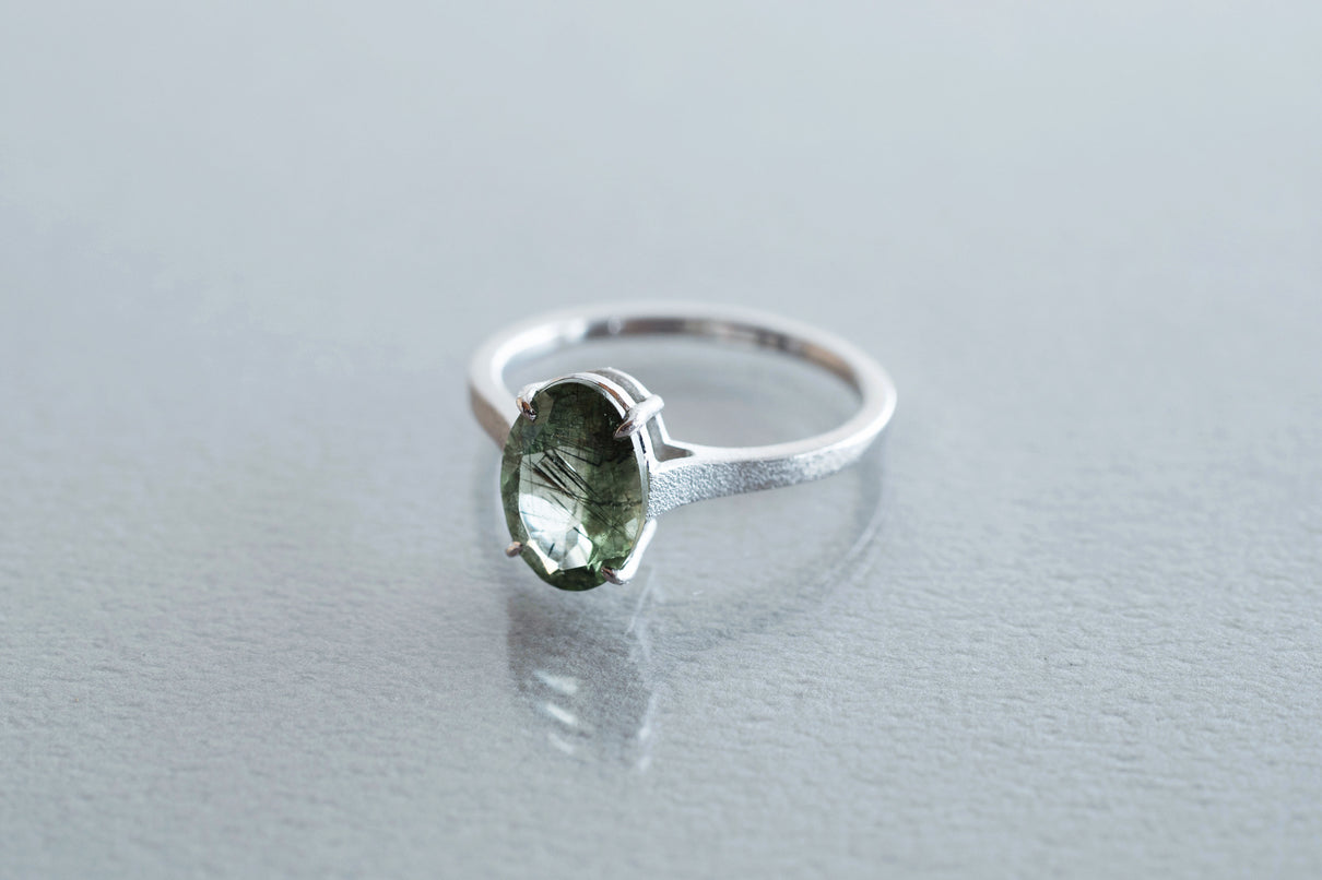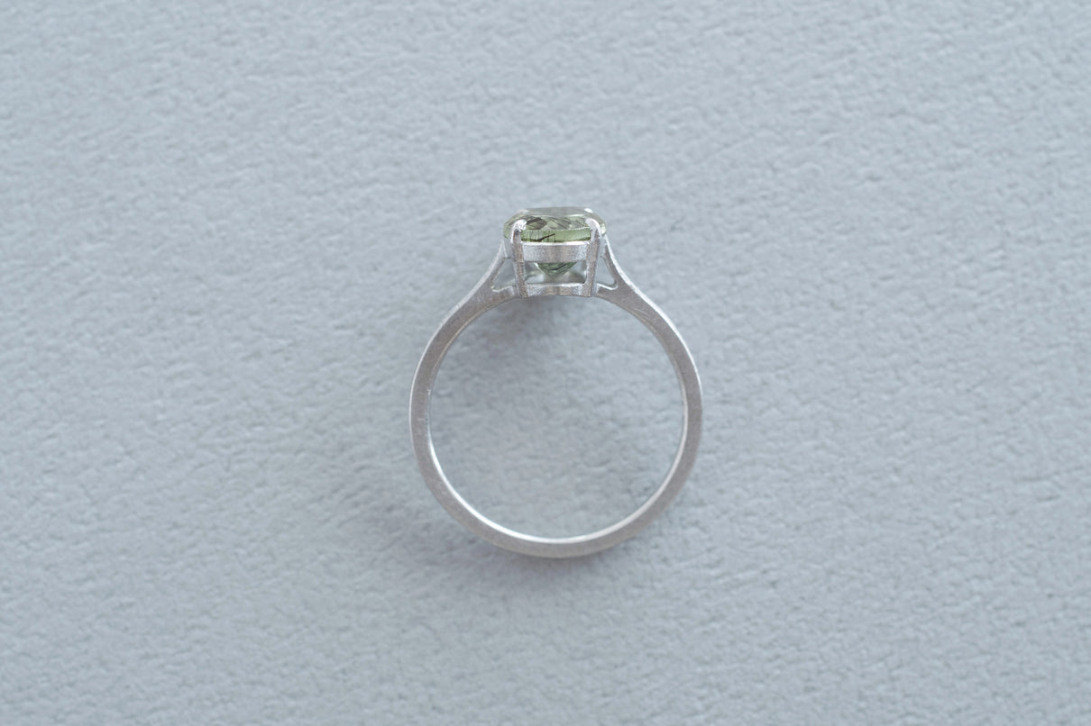 黒色の針状内包物を結晶に閉じ込めたルドヴィジャイトペリドットで仕立てた一点もののリング。この極めて特殊なペリドットは、世界で唯一、パキスタンのスワート渓谷の地だけで産出される非常に希少な宝石です。さらに採れる原石が小さいために産出量も非常に少なく、さらに品質の良いルースはひと握り。こちらはすっきりとした縦長のオーバルカットのピースです。無数の微細なインクルージョンがオリーブグリーンの色彩の中で重なりながら漂う様子は、まるで深い森の一部を切り抜いたかのような静かで幻想的な景色を紡ぎ出しています。一見シンプルに見える華奢なフォルムのリングアームには、実は表情の異なる3種類のテクスチャーを施しました。。上部からサイドにかけては荒目のマットテクスチャーから鏡面へとグラデーションで繋ぎ、側面はより柔らかく細やかなマットに仕上げることで、視点を変えると自然の森同様、様々な表情を見せています。日常の装いに落ち着きのある華やかさを添えるリング。8月の誕生石としても親しまれているペリドットは、8月生まれの方の特別なお守りとして贈りものにも最適なアイテムです。