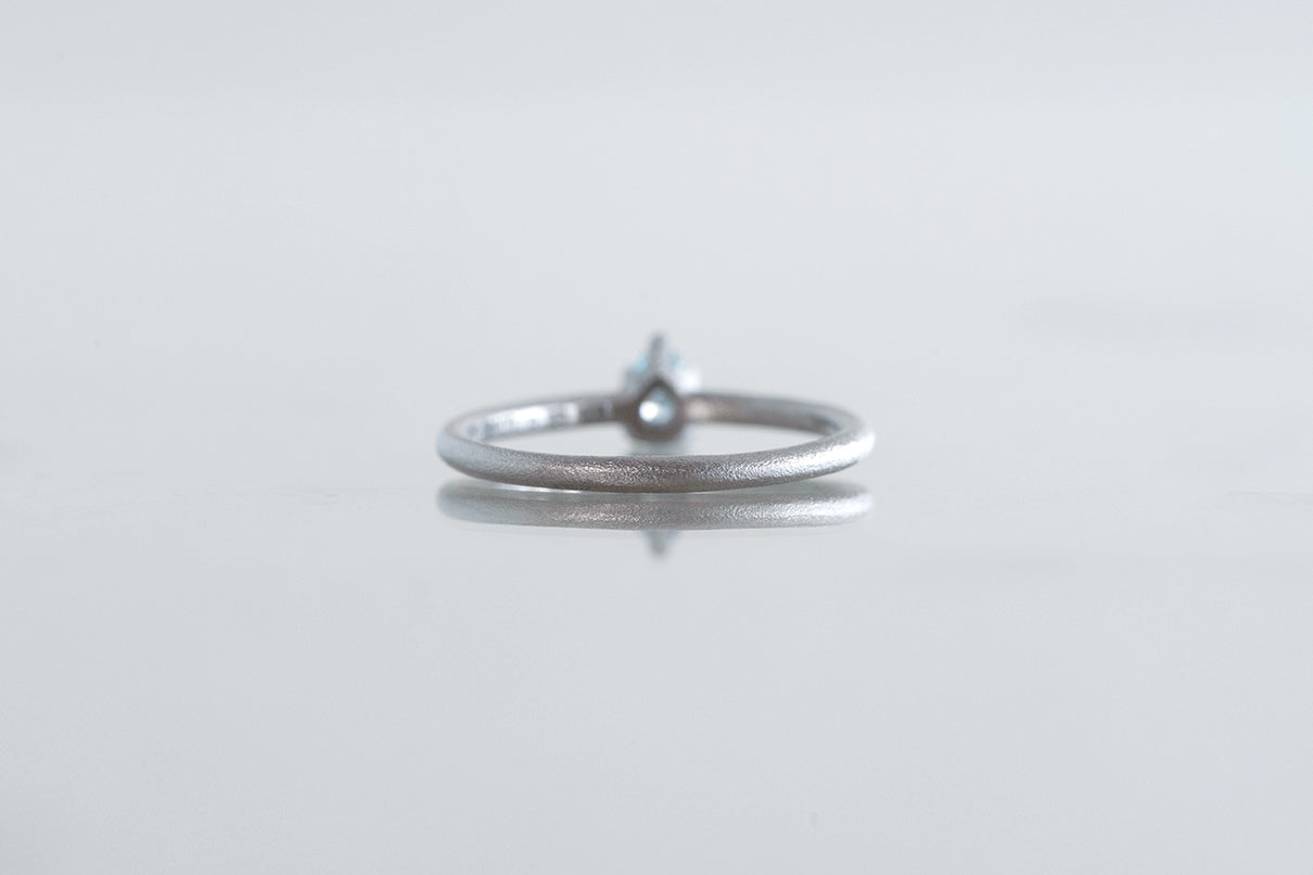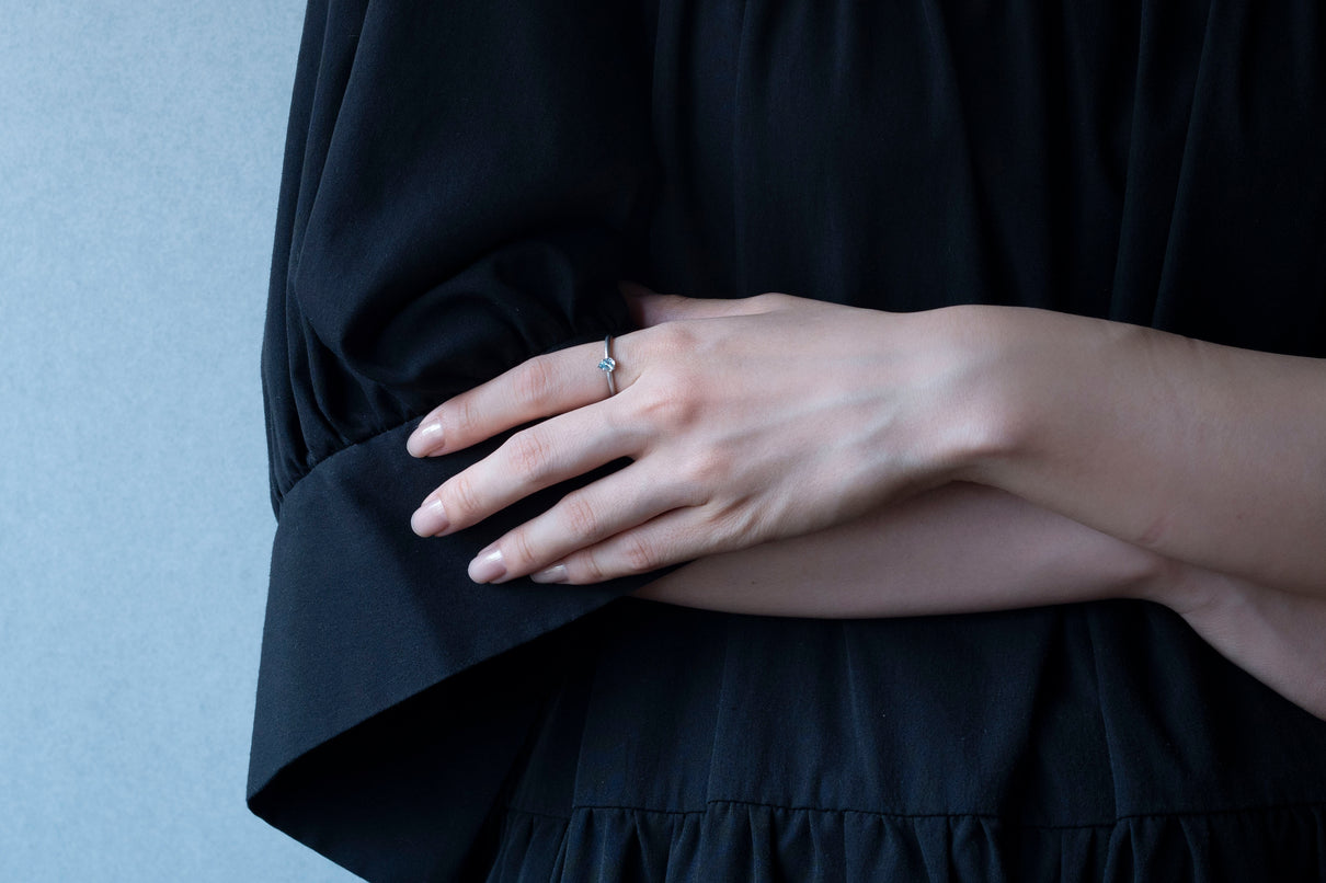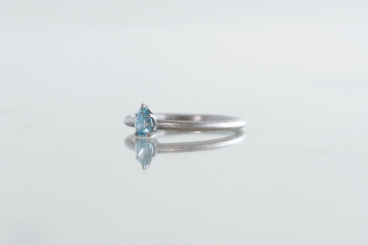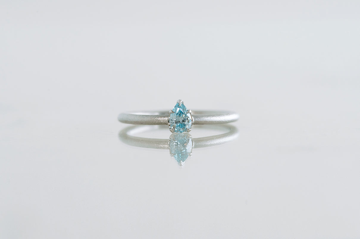 目を引く色鮮やかなアイスブルーカラーのダイヤモンドを、繊細な5本爪でセッティングした一点もののダイヤモンドリング。透明度の高い遠浅の海を映し出したかのような色彩と煌めきは、砂粒のような質感に仕立てたマットなリングアームとのコントラストが際立ち、無駄を削ぎ落としたシンプルなフォルムがダイヤモンドの魅力を一層引き立てています。小ぶりなサイズ感で手元に彩を添える日常使いのファッションリングとしては勿論、質の高い、選りすぐりのダイヤモンドならではの輝きは、エンゲージリング (婚約指輪) や記念日の特別な贈り物としてもお勧めのアイテムです。