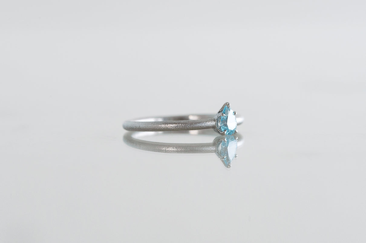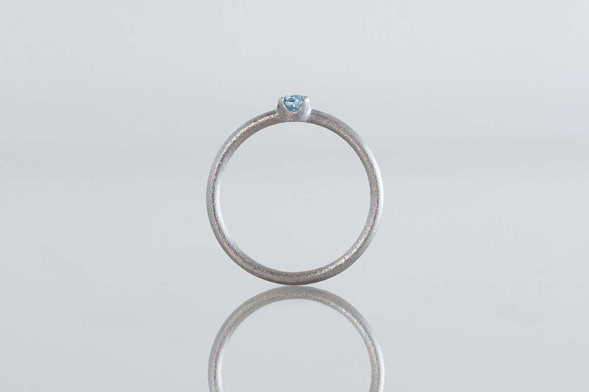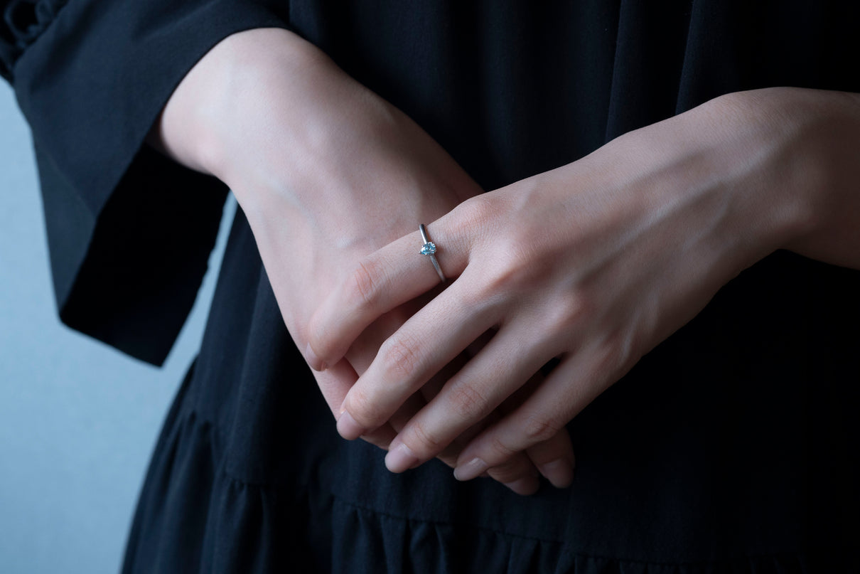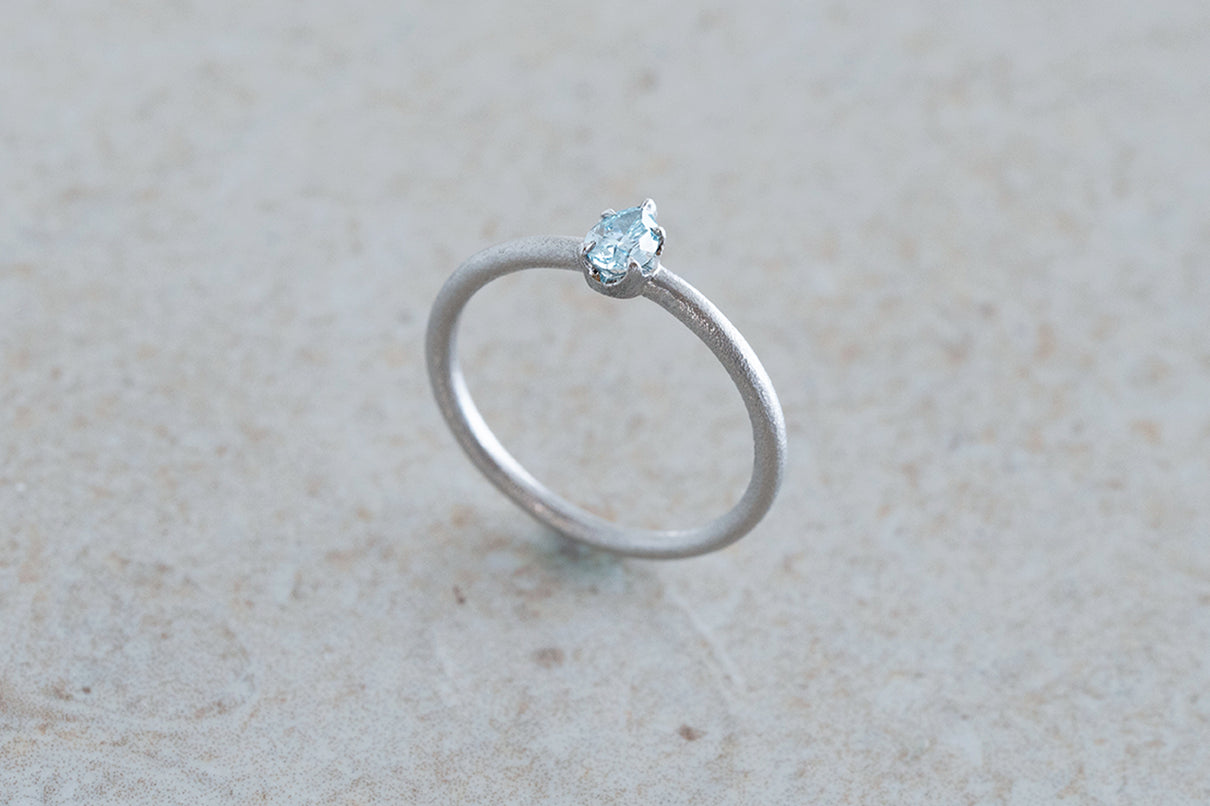 目を引く色鮮やかなアイスブルーカラーのダイヤモンドを、繊細な5本爪でセッティングした一点もののダイヤモンドリング。透明度の高い遠浅の海を映し出したかのような色彩と煌めきは、砂粒のような質感に仕立てたマットなリングアームとのコントラストが際立ち、無駄を削ぎ落としたシンプルなフォルムがダイヤモンドの魅力を一層引き立てています。小ぶりなサイズ感で手元に彩を添える日常使いのファッションリングとしては勿論、質の高い、選りすぐりのダイヤモンドならではの輝きは、エンゲージリング (婚約指輪) や記念日の特別な贈り物としてもお勧めのアイテムです。