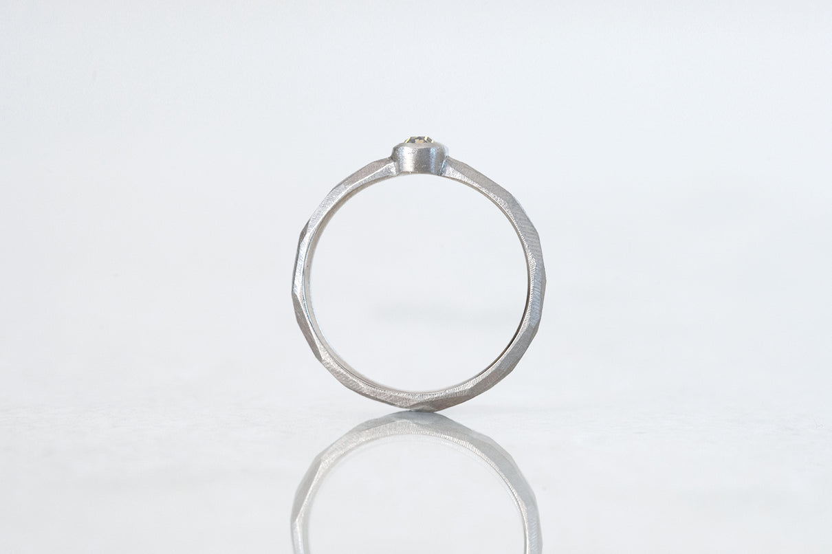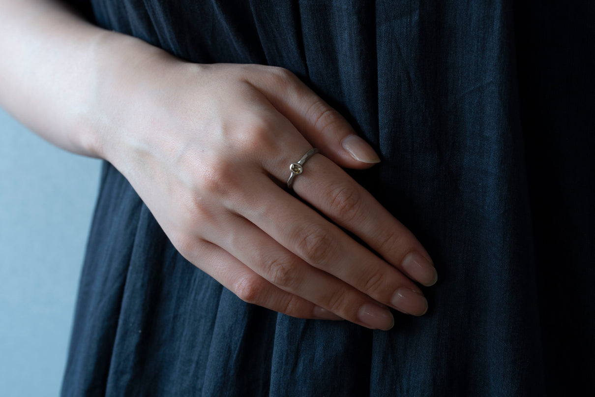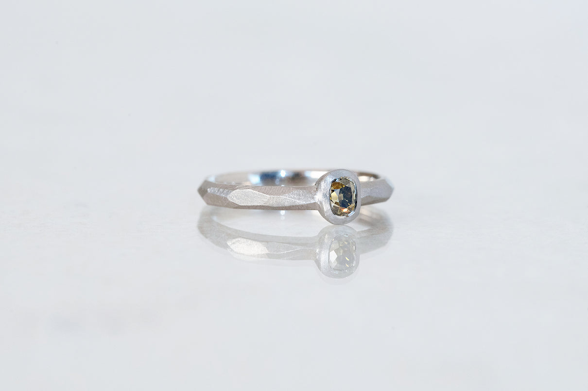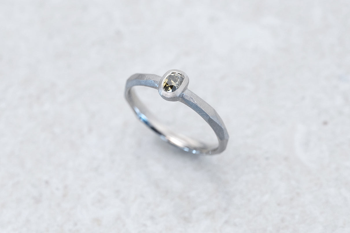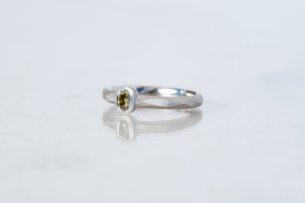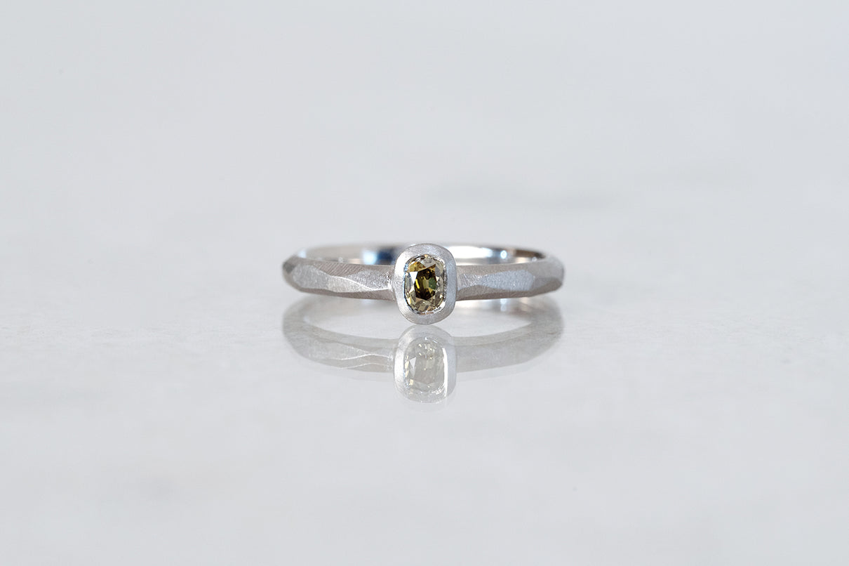 ダイヤモンドのカット方法の中でも希少価値の高いオールドカットのオリーブグリーンダイヤモンドを留めた、一点もののダイヤモンドリング。蛍光灯のなかった時代、蝋燭の炎のもとで最も美しく輝くようにと手作業にてカットされたオールドカットのダイヤモンドは、奥に歴史的背景を確かに感じられます。均整の取れた現代のブリリアントカットの輝きと比較すると、人の手によってカッティングされた僅かな不規則さが輝きの抑揚となり、柔らかで有機的な煌めきを感じる事のできる魅力的なオールドカット。塊から荒く削りだしたような幾つもの面と面が織りなすマットなホワイトゴールドの表情と、オールドカットダイヤモンドの側面をぐるりと一周取り囲むように留めた覆輪留めがアクセントとなっています。黄味がかったグリーンカラーのダイヤモンドは希少価値も高く、その他にない個性で、指元を印象的に輝かせます。質の高い、選りすぐりのダイヤモンドならではの輝きは、エンゲージリング (婚約指輪) や記念日の特別な贈り物としてもお勧めのアイテムです。