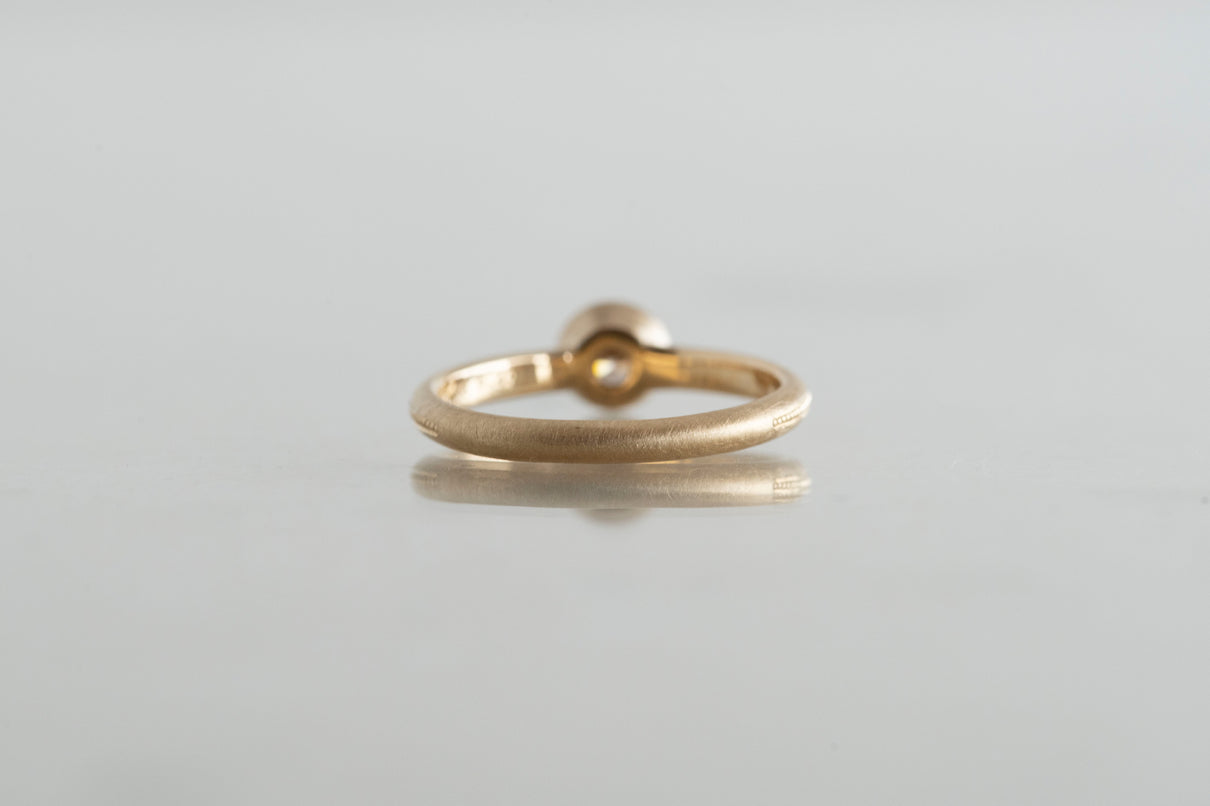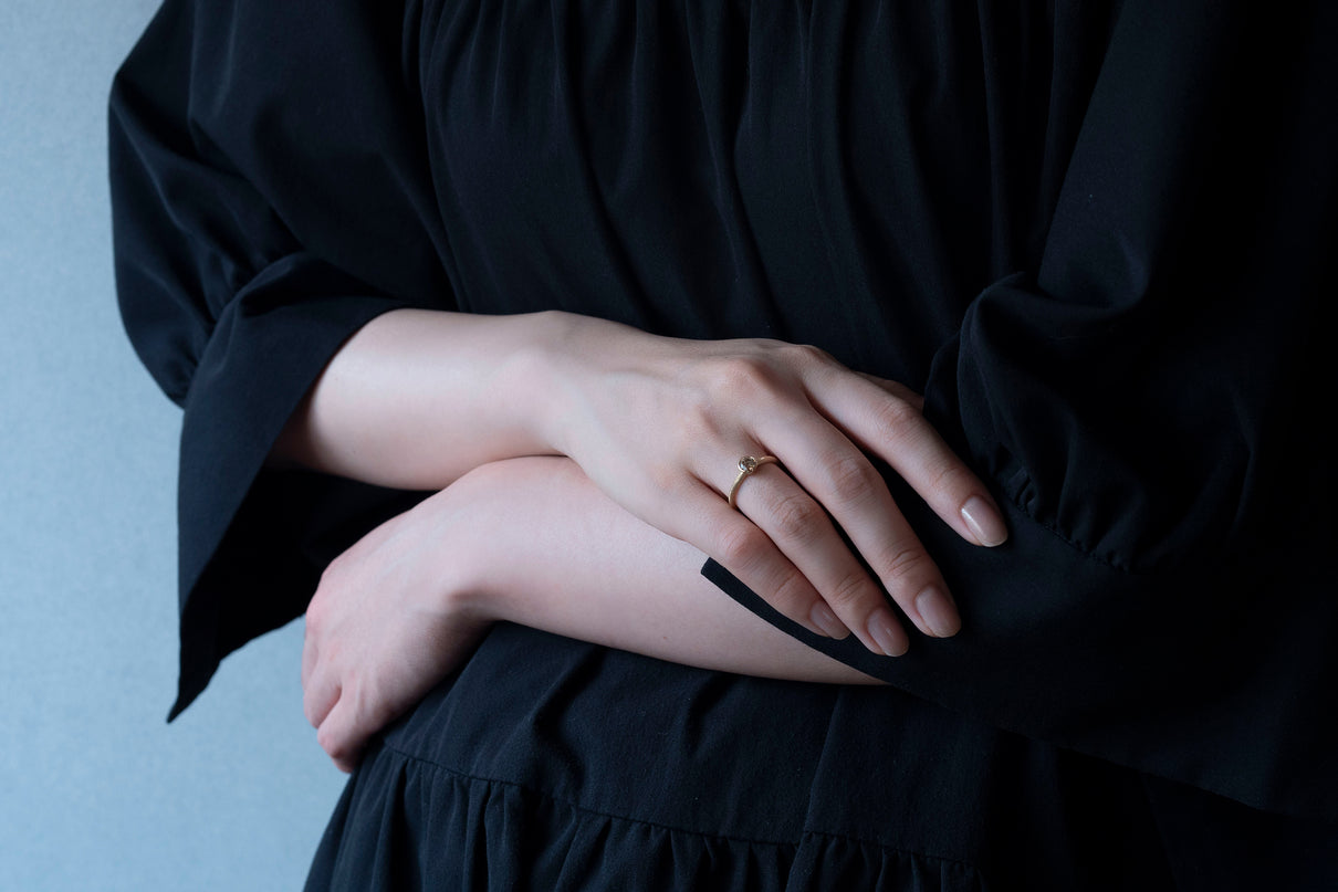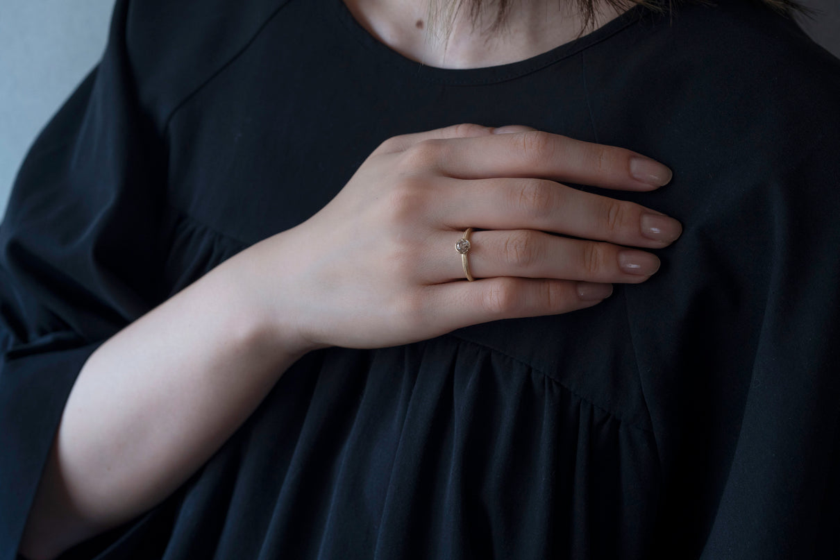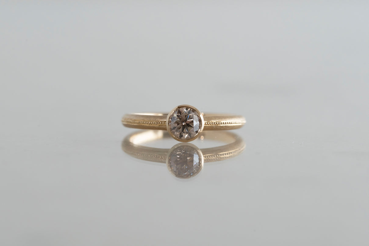 落ち着きのあるコニャックブラウンのカラーダイヤモンドを留めた一点もののリング。華やかに煌めく存在感のあるブリリアントカットダイヤモンドを、イエローゴールドのリングアーム左右半周ずつ施したミル打ちのラインの細かな手仕事がクラシカルな雰囲気で引き立てます。コニャックのように深みのあるブラウンの色味は、肌馴染み良くシックな印象を与えます。質の高い、選りすぐりのダイヤモンドならではの輝きは、エンゲージリング (婚約指輪) や記念日の特別な贈り物としてもお勧めのアイテムです。