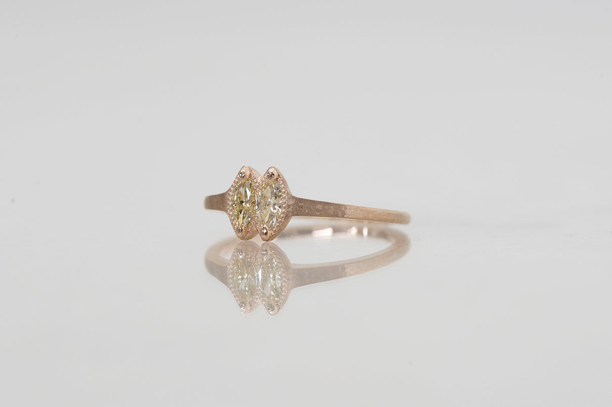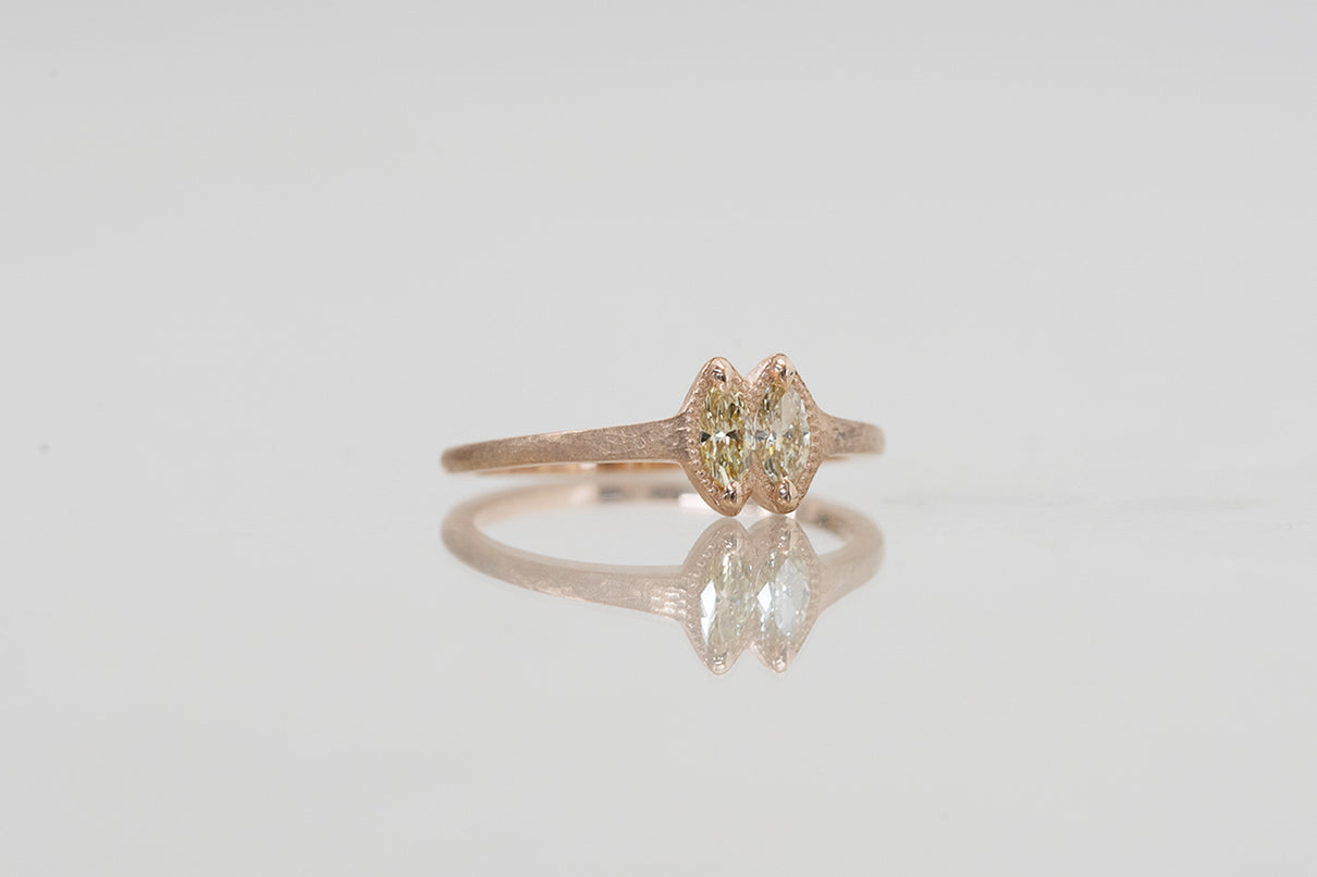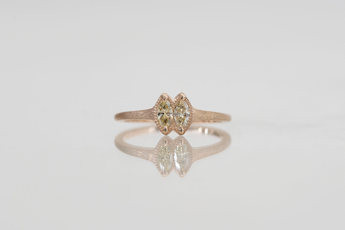 透明度の高いライトイエローのマーキスカットの2石のダイヤモンドが寄り添う、一点もののカラーダイヤモンドリングです。ダイヤモンドの周囲を緻密な手仕事によるミルグレインで取り巻くことで浮かび上がる、まるで蝶のような2枚の煌めく羽にも似た愛らしい姿。繊細なダイヤモンドの煌めきとマットテクスチャーを施したピンクゴールドのリングアームの落ち着きのある佇まいがバランス良くデザインされたアイテムです。日常に華を添えるファッションリングとしてはもちろん、良質なダイヤモンドならではの輝きは、エンゲージリング (婚約指輪) や記念日の特別な贈り物としても喜ばれる一点もののアイテムです。