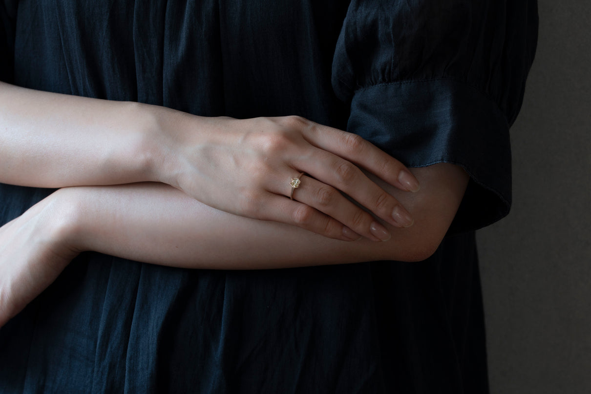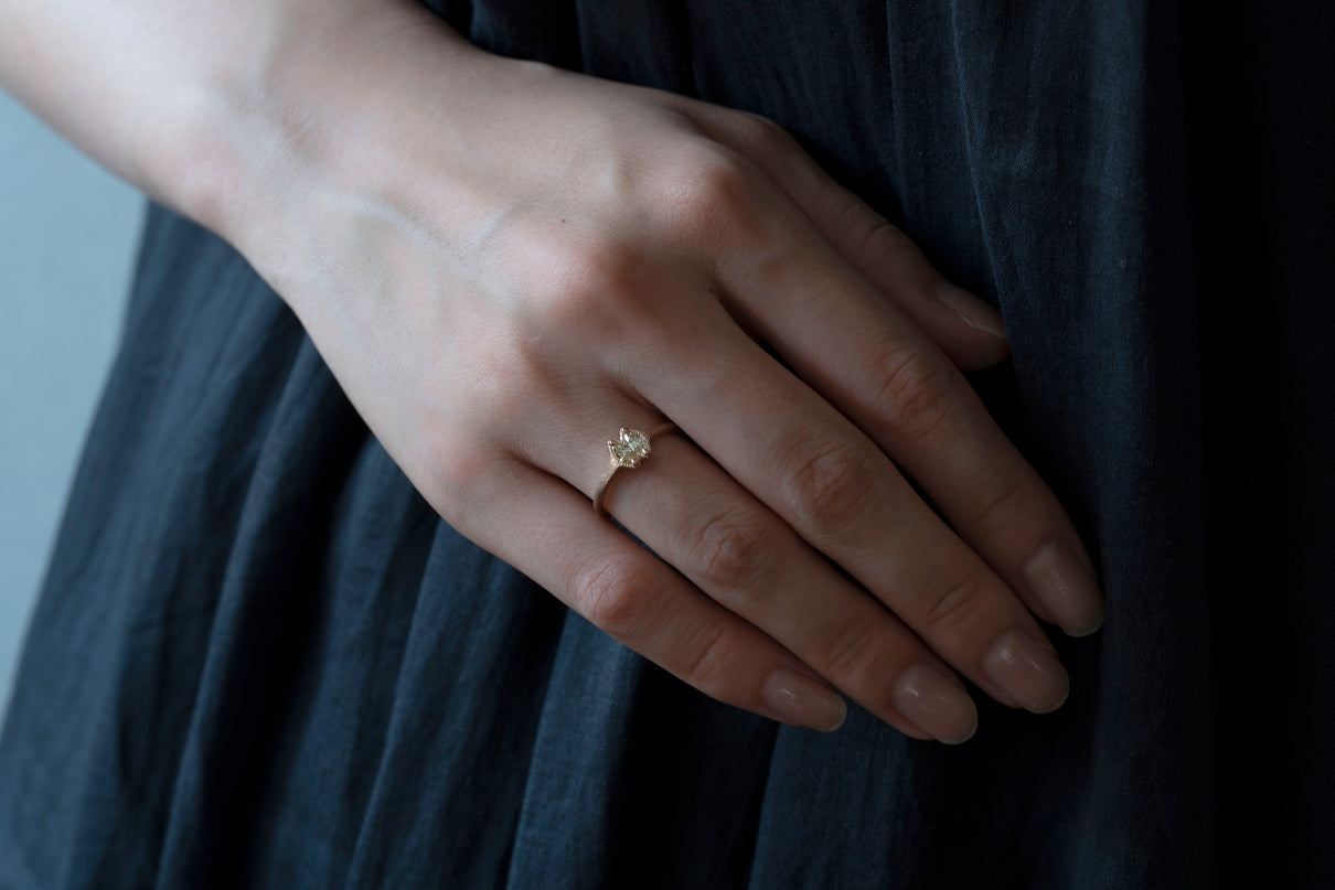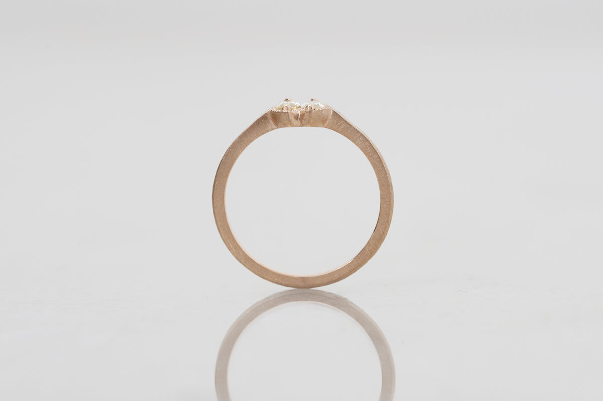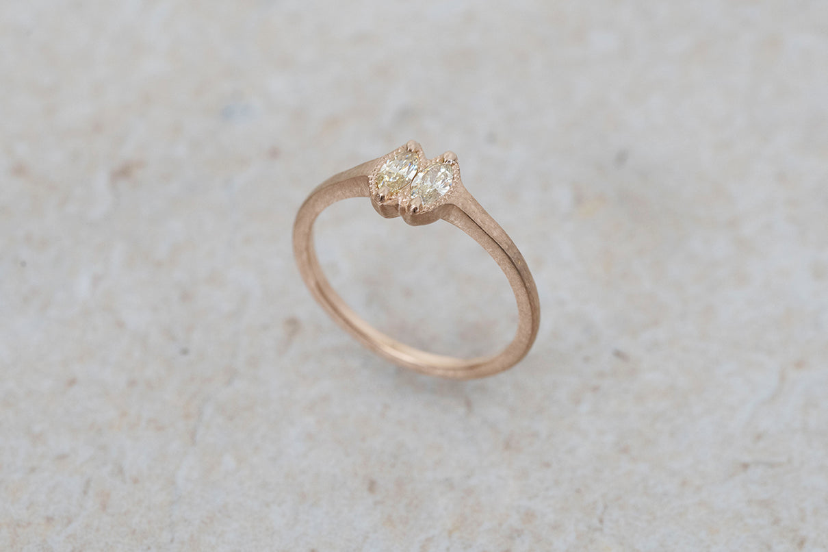 透明度の高いライトイエローのマーキスカットの2石のダイヤモンドが寄り添う、一点もののカラーダイヤモンドリングです。ダイヤモンドの周囲を緻密な手仕事によるミルグレインで取り巻くことで浮かび上がる、まるで蝶のような2枚の煌めく羽にも似た愛らしい姿。繊細なダイヤモンドの煌めきとマットテクスチャーを施したピンクゴールドのリングアームの落ち着きのある佇まいがバランス良くデザインされたアイテムです。日常に華を添えるファッションリングとしてはもちろん、良質なダイヤモンドならではの輝きは、エンゲージリング (婚約指輪) や記念日の特別な贈り物としても喜ばれる一点もののアイテムです。