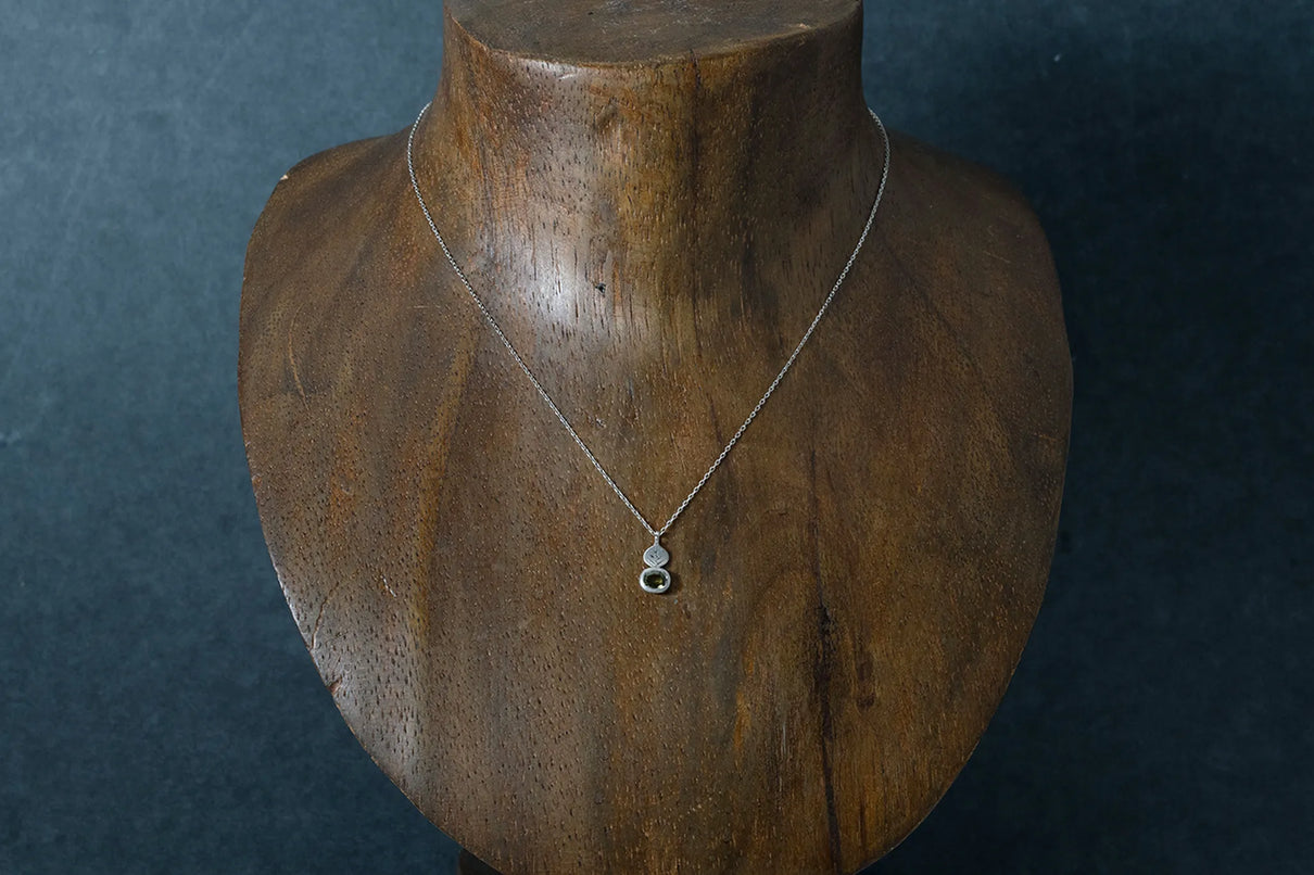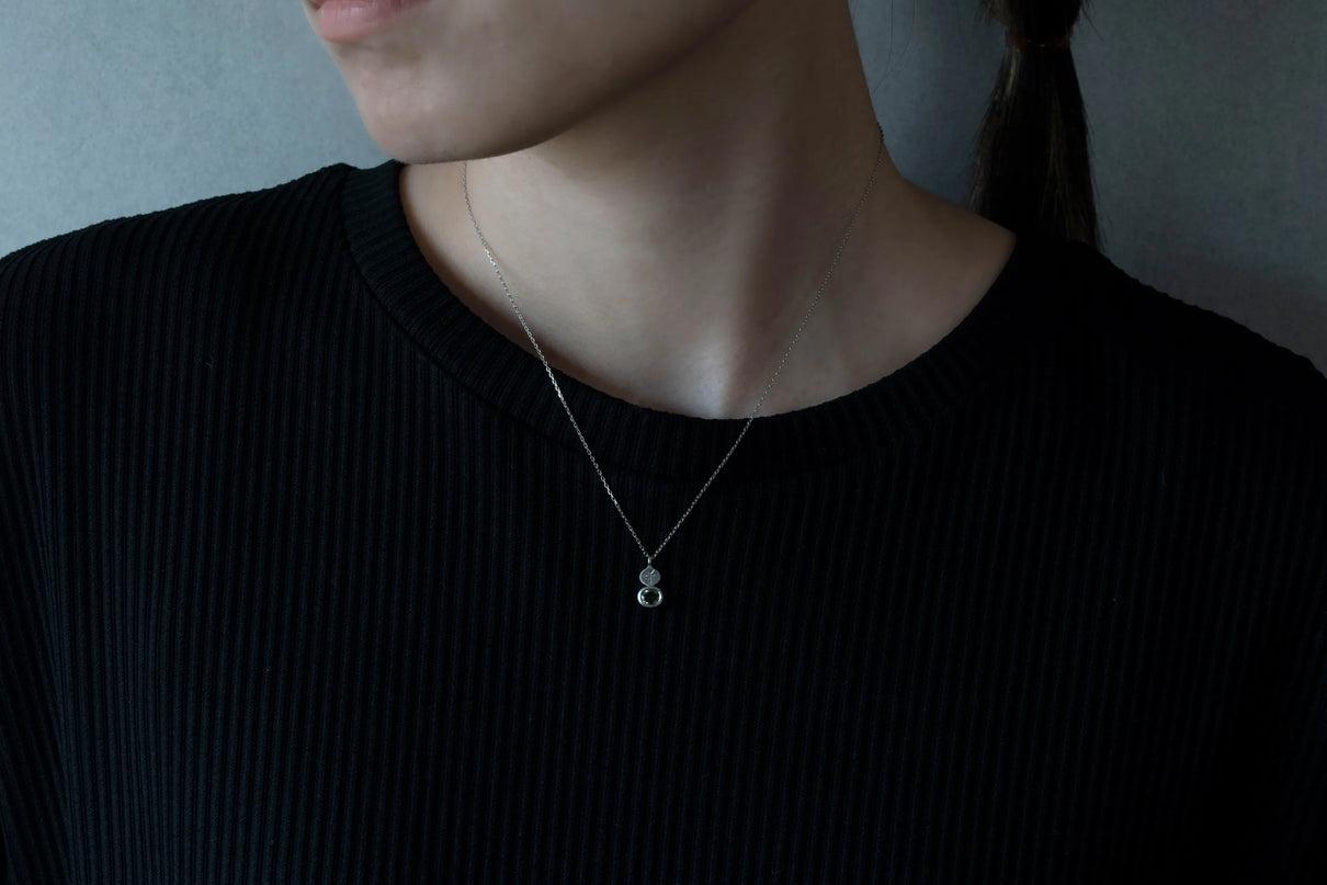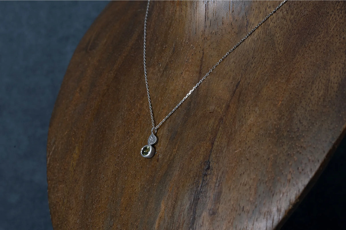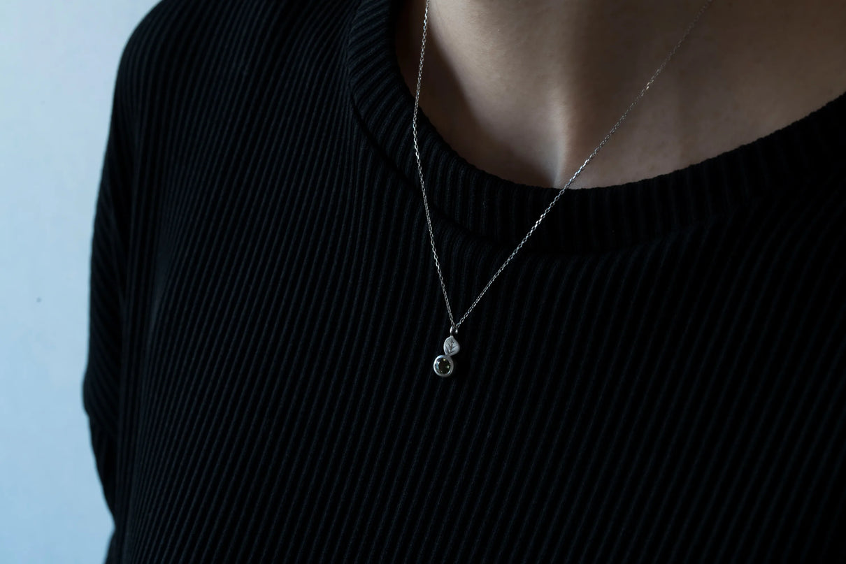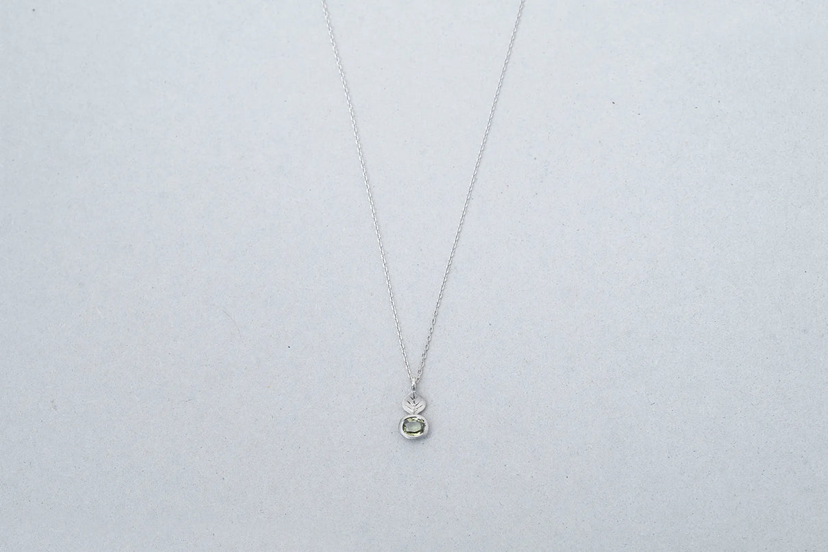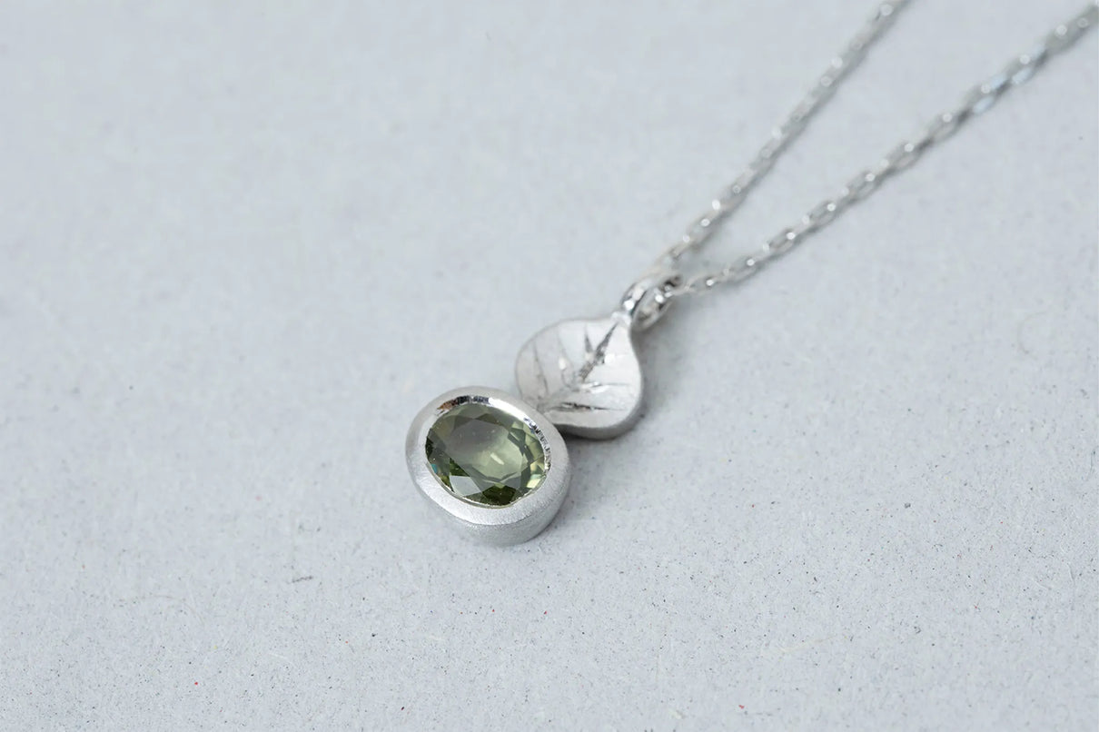 手彫りの葉脈が煌めく小さな葉っぱモチーフのプラチナパーツに、透明度の高いオーバルカットのグリーンサファイアを留めた " Leaf " コレクションの一点もののネックレス。小ぶりながらも高い透明度と厚みで存在感を放つサファイアを、覆輪留めで優しく包み込むようにセッティングしました。小さく繊細な存在でありながら、ひと匙の個性と印象的な魅力を秘めた、日常の装いを品よく引き立てるデザインです。9月の誕生石としても親しまれているサファイアは、9月生まれの方の特別なお守りとして贈りものにも最適です。