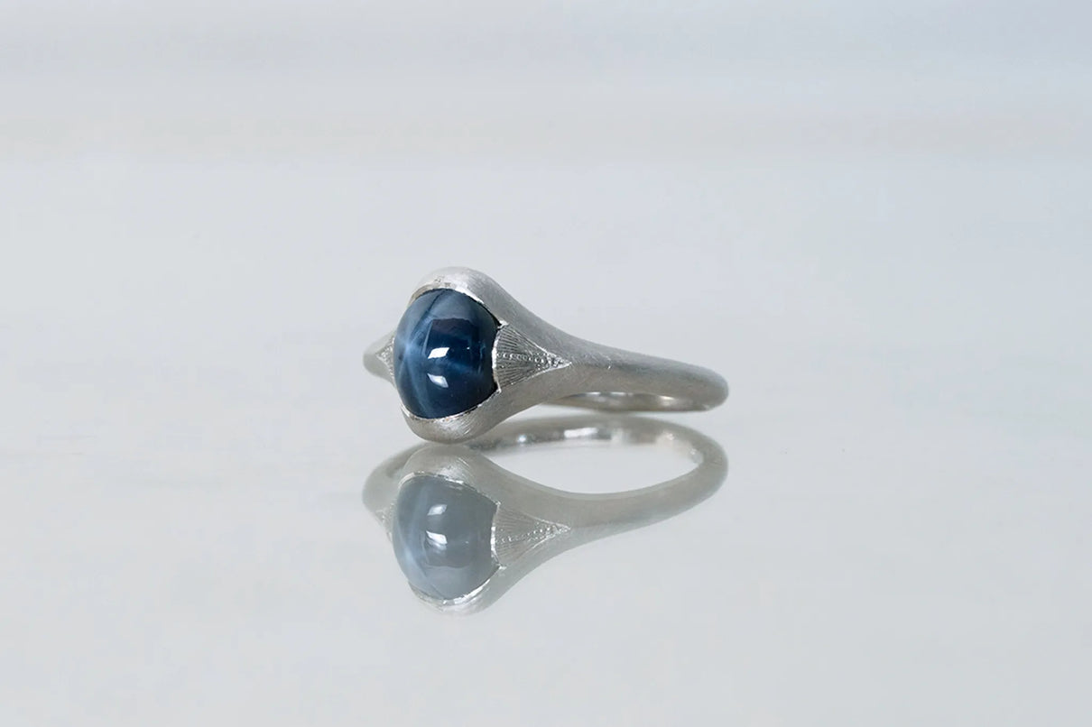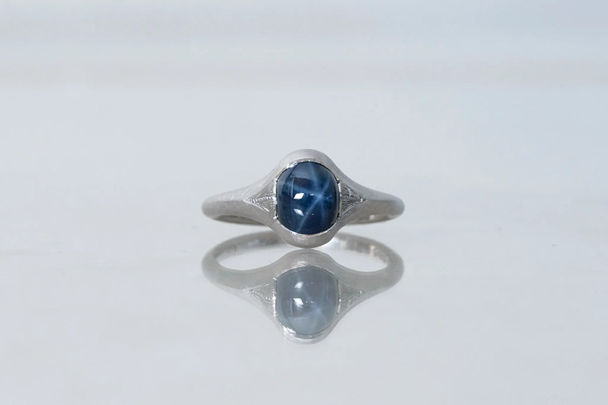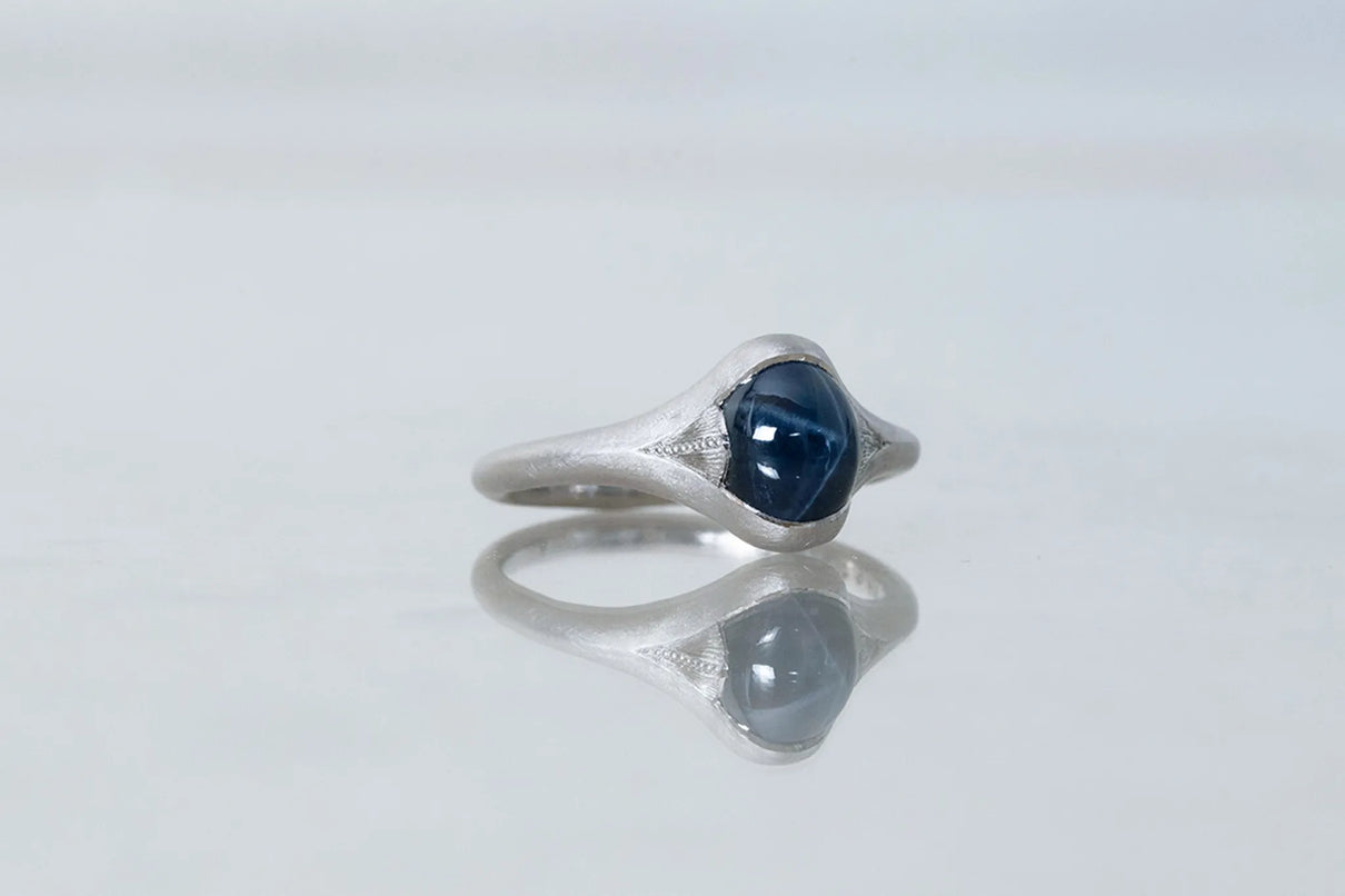 まるで星が瞬くように閃光を放つ希少なスターサファイアを留めた一点もののリング。光を受けると六条の光の線を見せるものはスターサファイアと呼ばれ、見る角度によって様変わりする姿はまさに神秘的。深い青色が印象的なカボションカットのサファイアを優しく包む石座は、まるで朝露を湛えた芍薬の膨らんだ蕾を彷彿とさせる滑らかな曲面を描きます。またプラチナの石座の左右に切り込んだ谷間には、細やかに刻んだ幾多の光の筋と、極小のミルグレインの繊細な手仕事を施しました。日常的に身に着けていただくのはもちろん、9月の誕生石としても親しまれているサファイアは、9月生まれの方の特別なお守りとして贈りものにも最適です。