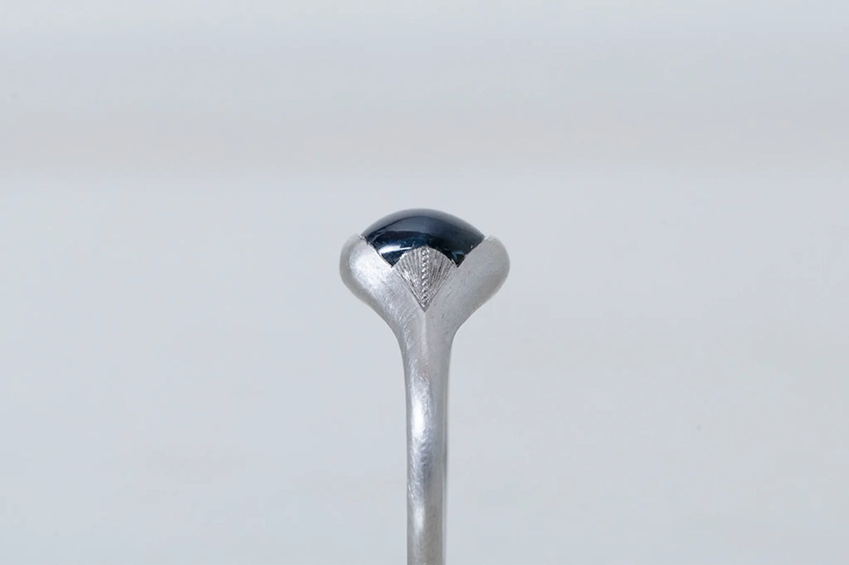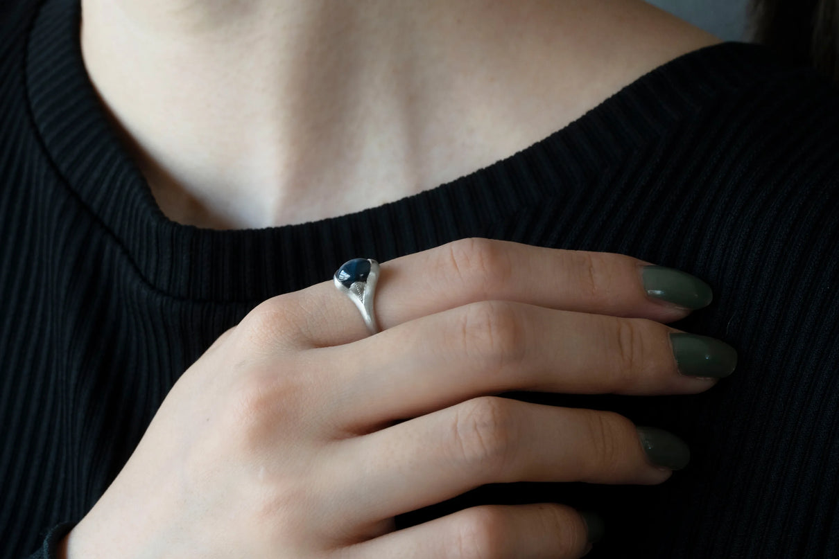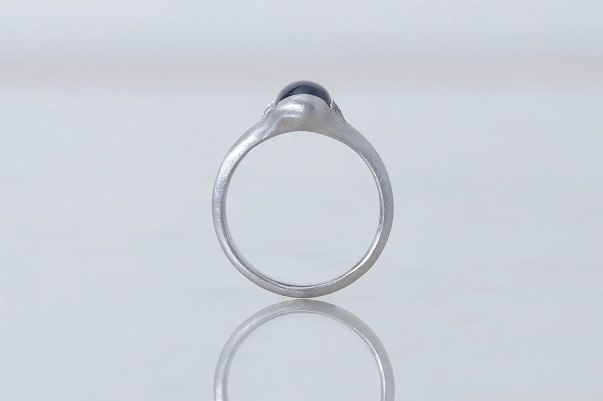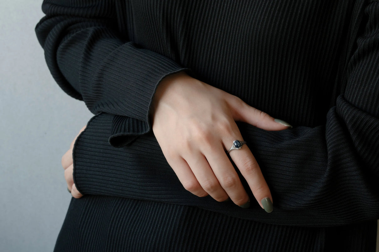 まるで星が瞬くように閃光を放つ希少なスターサファイアを留めた一点もののリング。光を受けると六条の光の線を見せるものはスターサファイアと呼ばれ、見る角度によって様変わりする姿はまさに神秘的。深い青色が印象的なカボションカットのサファイアを優しく包む石座は、まるで朝露を湛えた芍薬の膨らんだ蕾を彷彿とさせる滑らかな曲面を描きます。またプラチナの石座の左右に切り込んだ谷間には、細やかに刻んだ幾多の光の筋と、極小のミルグレインの繊細な手仕事を施しました。日常的に身に着けていただくのはもちろん、9月の誕生石としても親しまれているサファイアは、9月生まれの方の特別なお守りとして贈りものにも最適です。