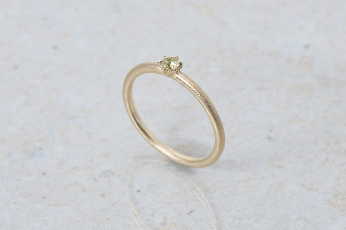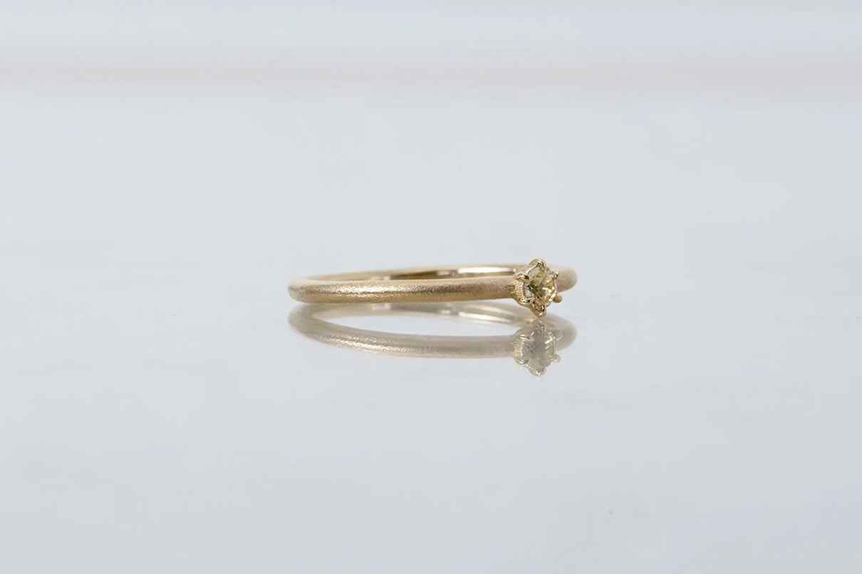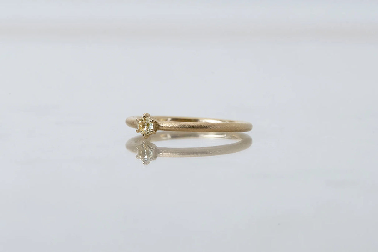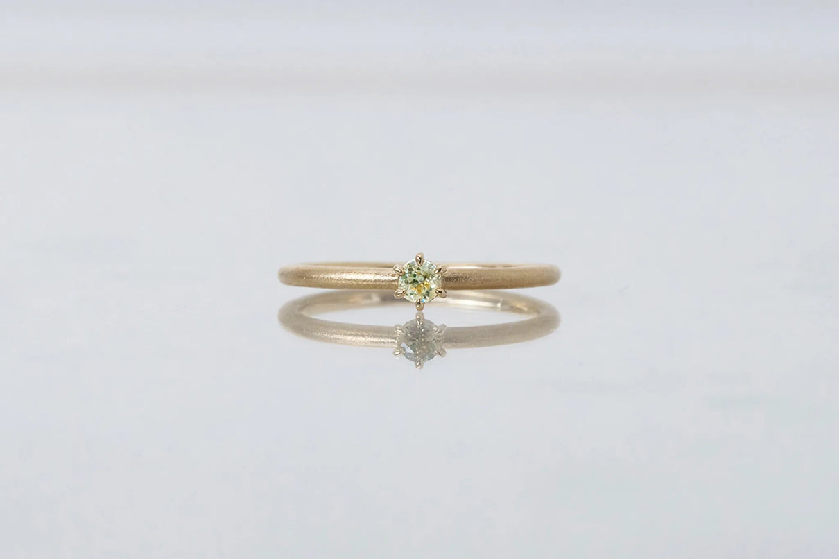 角度によってグリーンの色味も見えるイエローサファイアを、繊細な6本爪でセッティングした一点もののリング。0.12ctの小さなサファイアの中に秘めた神秘的な2色の色彩は、その大きさ以上の存在感と魅力を有しています。砂粒のような質感に仕立てたマットなリングアームとのコントラストが際立ち、無駄を削ぎ落としたシンプルなフォルムがサファイアの魅力を一層引き立てています。小ぶりなサイズ感で手元に彩を添える日常使いとしては勿論、9月の誕生石としても親しまれているサファイアは、9月生まれの方の特別なお守りとして贈りものにも最適です。