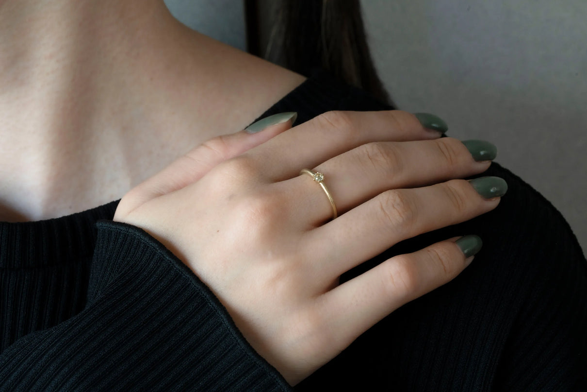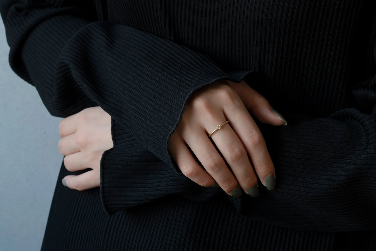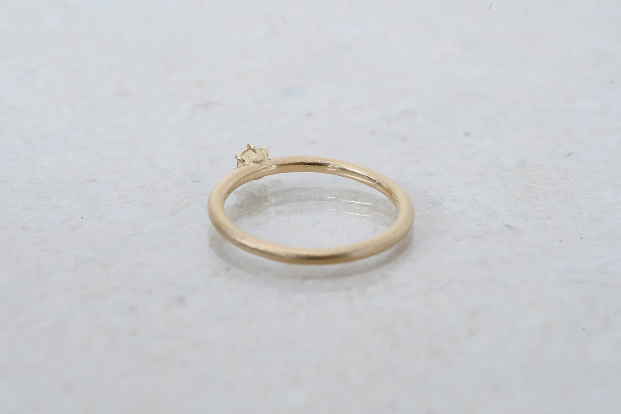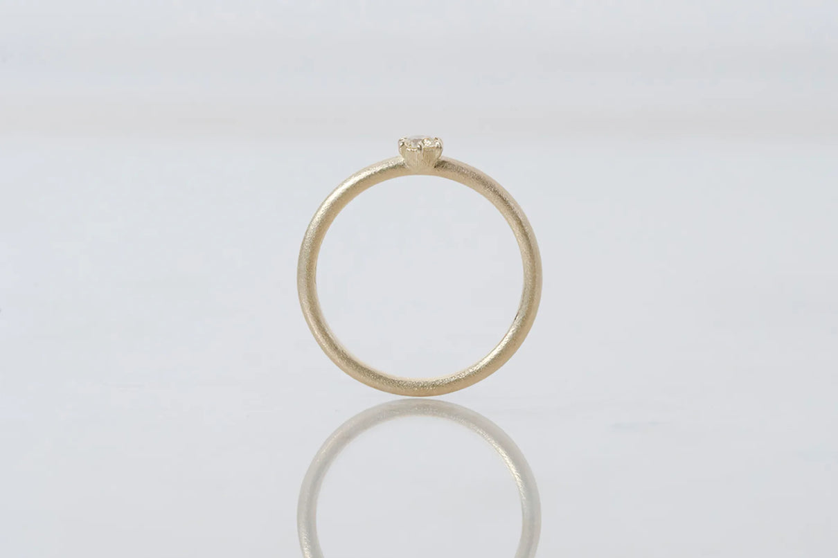 角度によってグリーンの色味も見えるイエローサファイアを、繊細な6本爪でセッティングした一点もののリング。0.12ctの小さなサファイアの中に秘めた神秘的な2色の色彩は、その大きさ以上の存在感と魅力を有しています。砂粒のような質感に仕立てたマットなリングアームとのコントラストが際立ち、無駄を削ぎ落としたシンプルなフォルムがサファイアの魅力を一層引き立てています。小ぶりなサイズ感で手元に彩を添える日常使いとしては勿論、9月の誕生石としても親しまれているサファイアは、9月生まれの方の特別なお守りとして贈りものにも最適です。