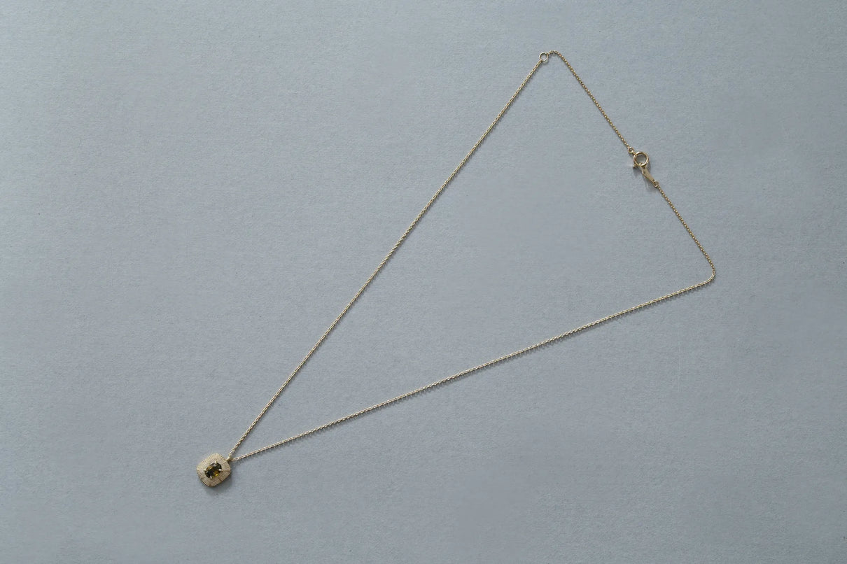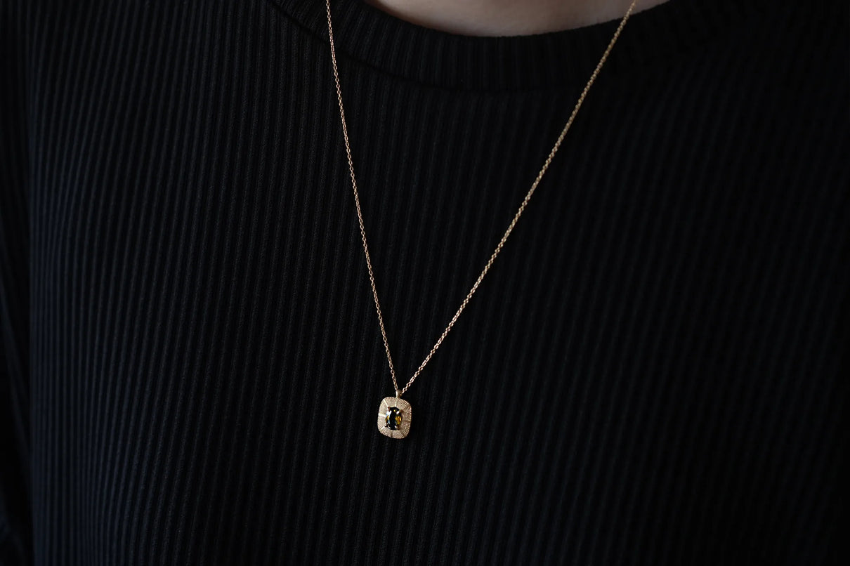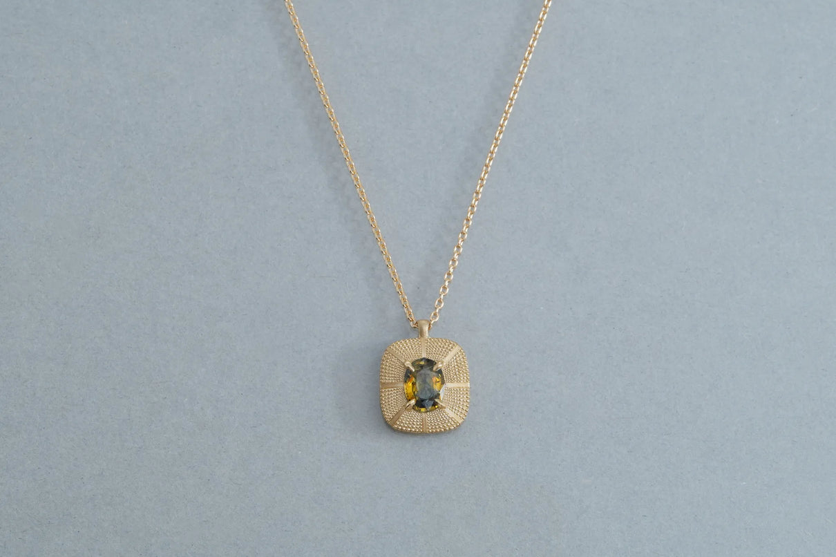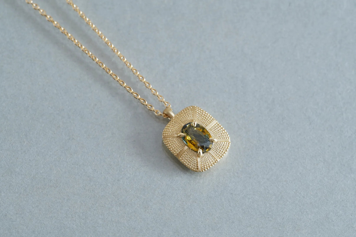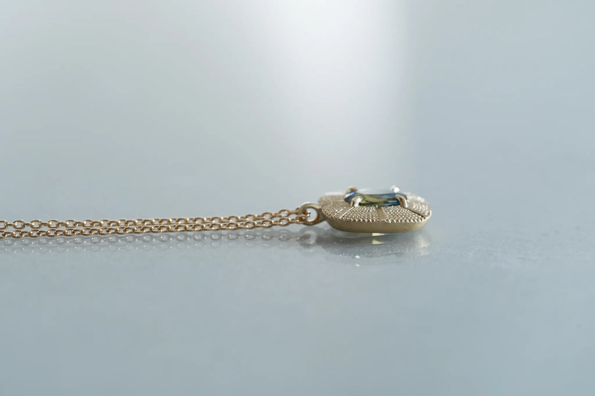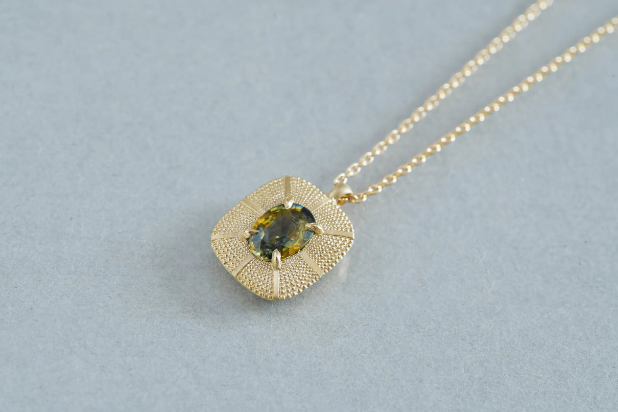 バイカラーサファイアを留めた一点もののネックレス。鮮やかに発色する "ブルーサファイア" を思い浮かべることの多いサファイアですが、実は驚くほど幅広い色のバリエーションが存在します。こちらのバイカラーサファイアは、カナリヤの羽を思わせる明るいイエローの中に濃いブルーが複雑に混ざり合う特別なピース。職人の真摯な手仕事により多くの繊細な工程を経て、緻密に計算され刻まれた密度の高いミルグレインのグラデーションが、サファイアを引き立てるように取り巻きます。チェーンの長さは50cmとやや長く、確かな存在感で胸元に上品な彩りを添えるネックレスとなりました。日常的に身に着けていただくのはもちろん、9月の誕生石としても親しまれているサファイアは、9月生まれの方の特別なお守りとして贈りものにも最適です。