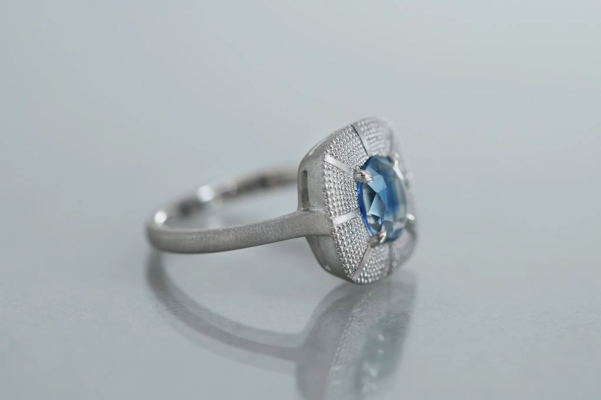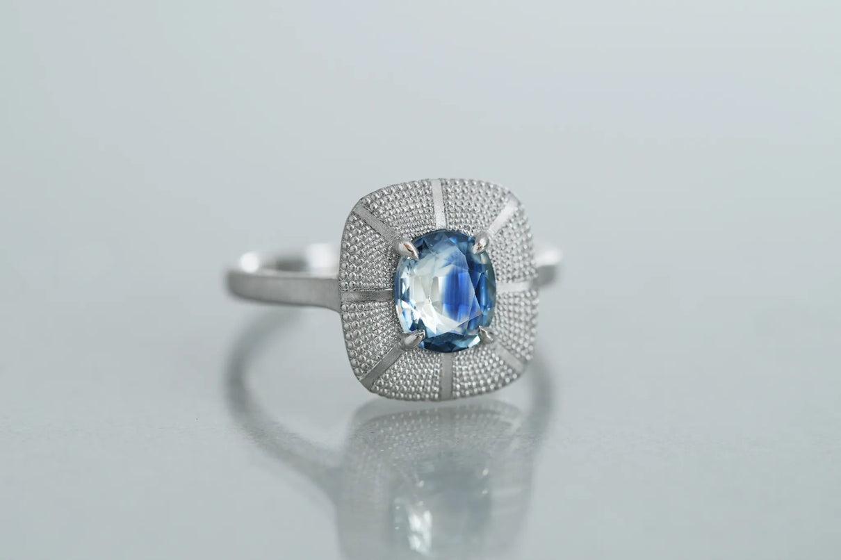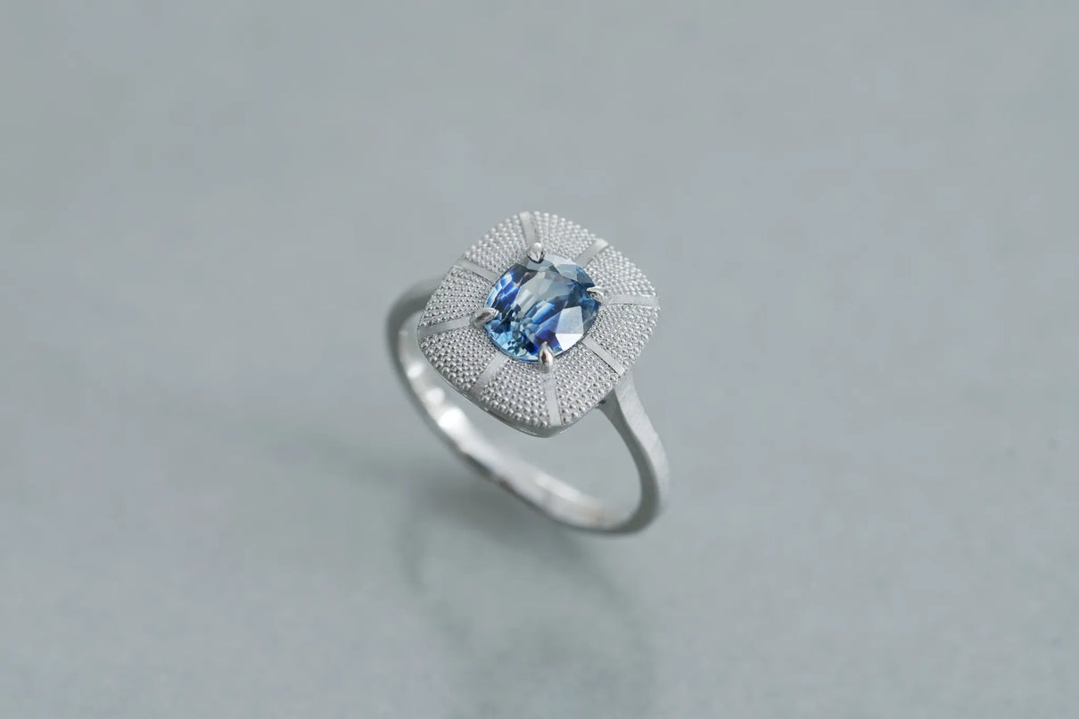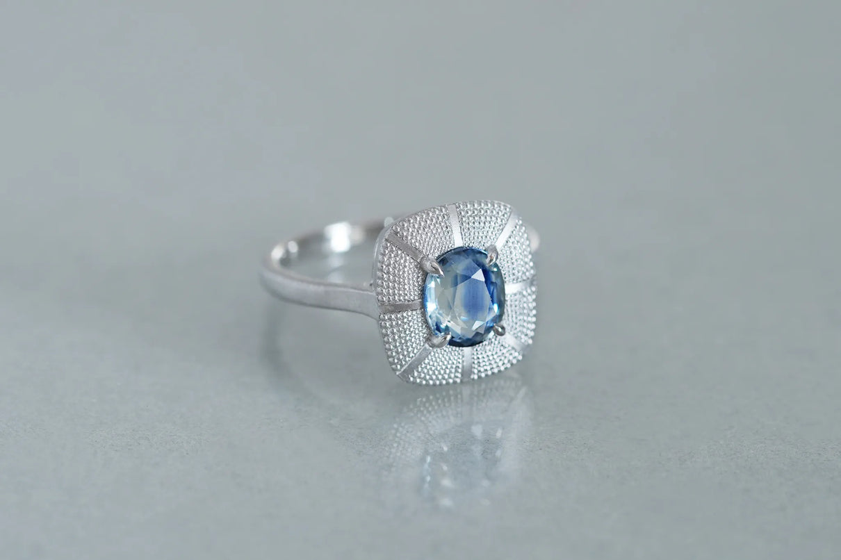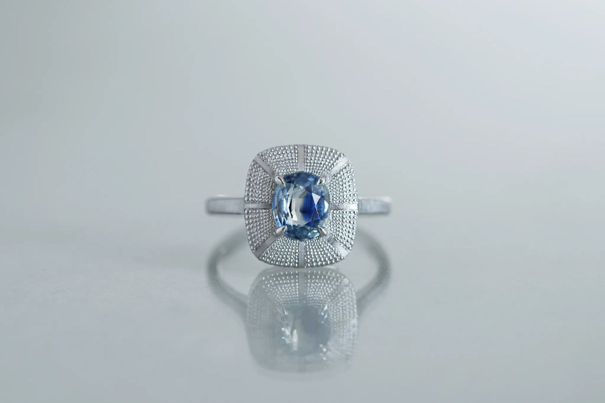 バイカラーサファイアを留めた一点もののリング。鮮やかに発色する "ブルーサファイア" を思い浮かべることの多いサファイアですが、実は驚くほど幅広い色のバリエーションが存在します。こちらのバイカラーサファイアは、透き通るようなクリアカラーの中に一滴の青インクを静かに落として閉じ込めたような、特別な個性を放つピース。職人の真摯な手仕事により多くの繊細な工程を経て、緻密に計算され刻まれた密度の高いミルグレインのグラデーションが、サファイアを引き立てるように取り巻きます。日常的に身に着けていただくのはもちろん、9月の誕生石としても親しまれているサファイアは、9月生まれの方の特別なお守りとして贈りものにも最適です。