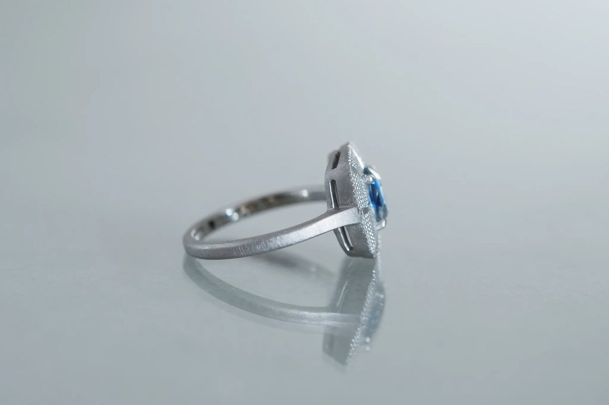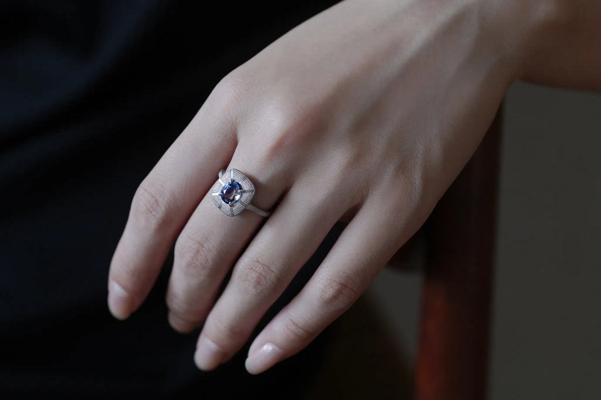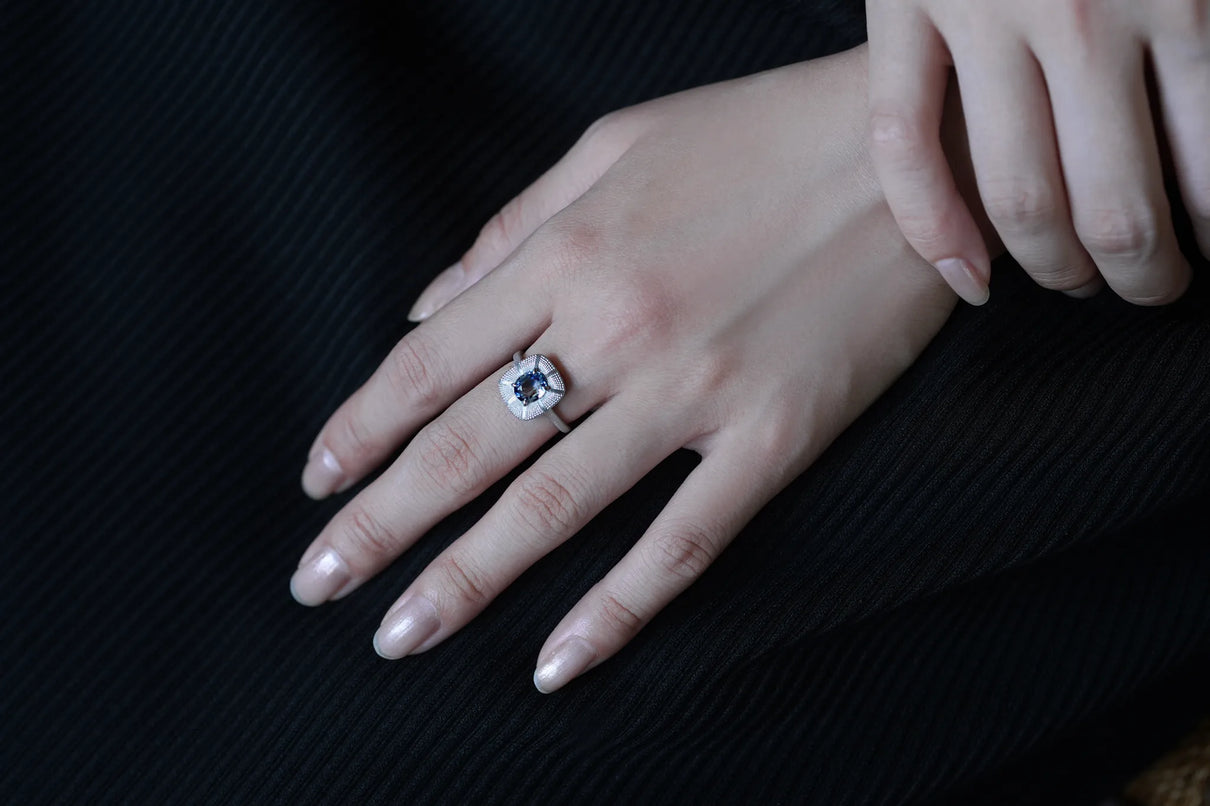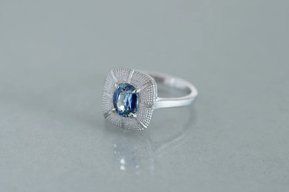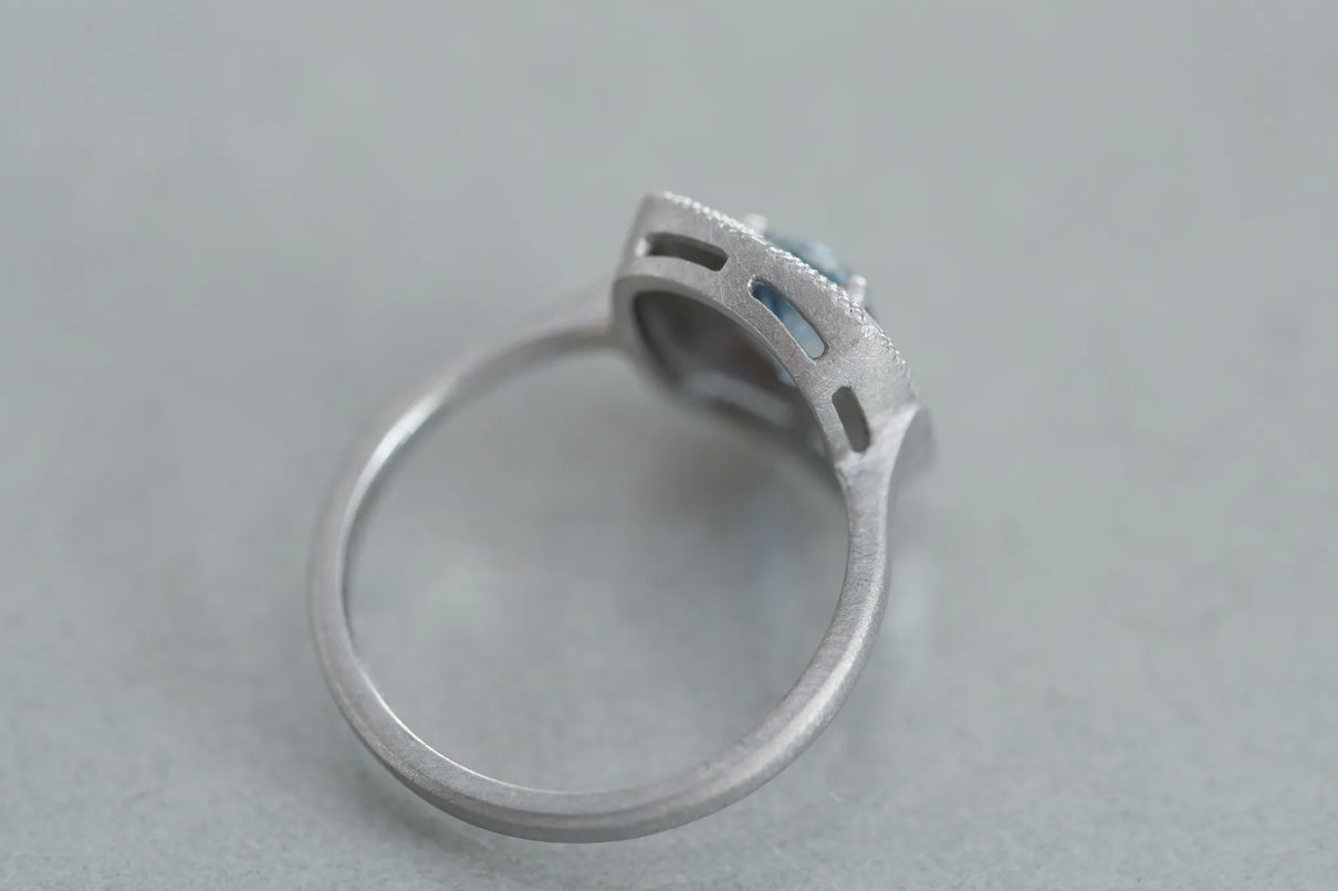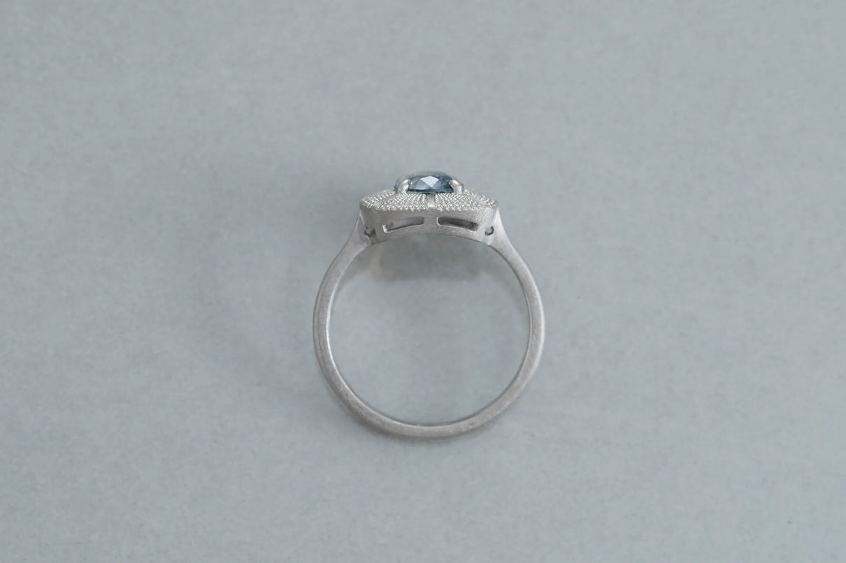 バイカラーサファイアを留めた一点もののリング。鮮やかに発色する "ブルーサファイア" を思い浮かべることの多いサファイアですが、実は驚くほど幅広い色のバリエーションが存在します。こちらのバイカラーサファイアは、透き通るようなクリアカラーの中に一滴の青インクを静かに落として閉じ込めたような、特別な個性を放つピース。職人の真摯な手仕事により多くの繊細な工程を経て、緻密に計算され刻まれた密度の高いミルグレインのグラデーションが、サファイアを引き立てるように取り巻きます。日常的に身に着けていただくのはもちろん、9月の誕生石としても親しまれているサファイアは、9月生まれの方の特別なお守りとして贈りものにも最適です。