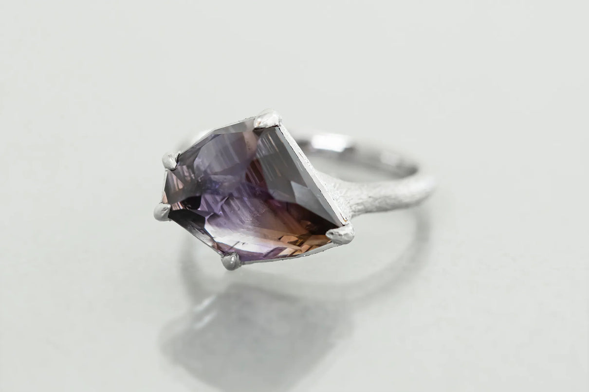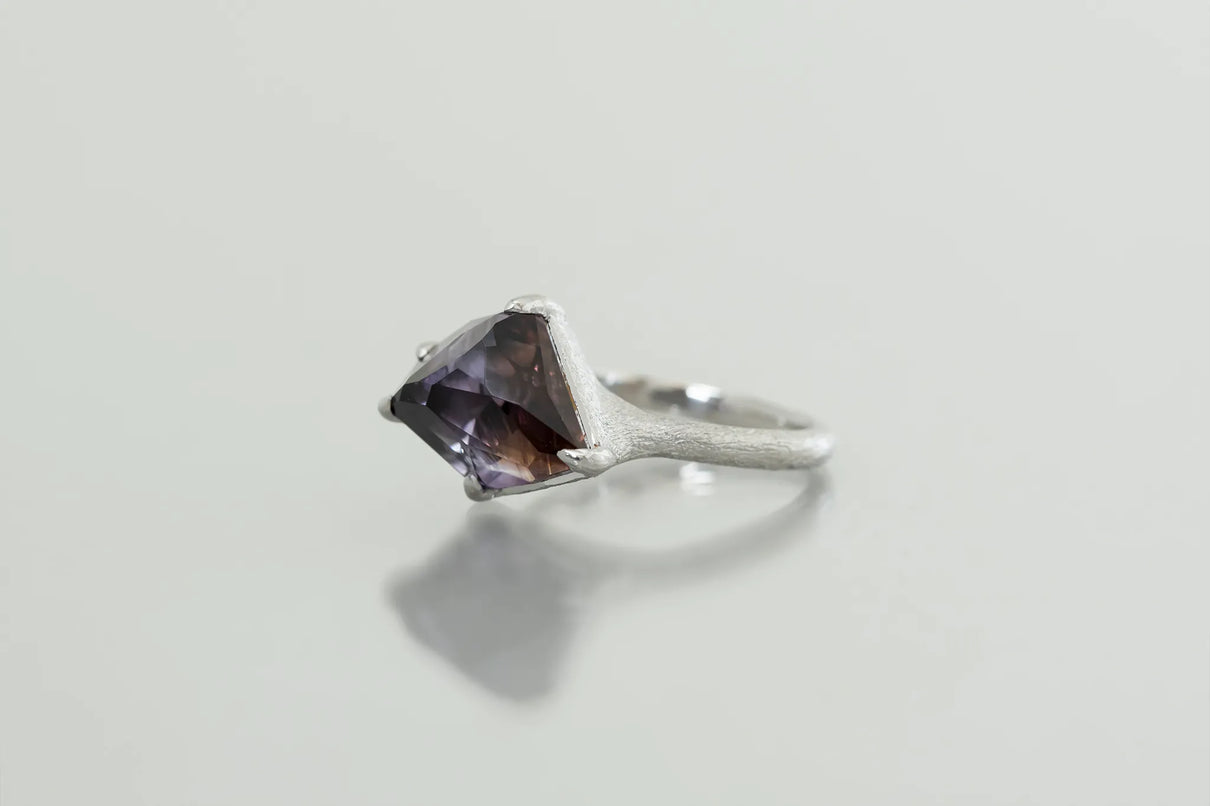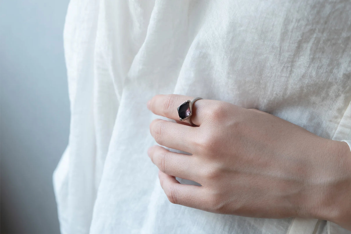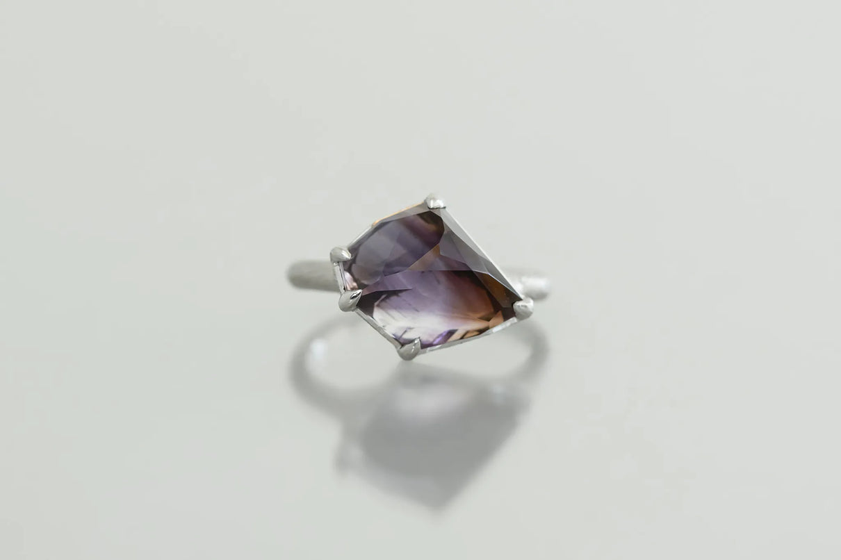 宝石研磨士・大城かん奈氏の手磨り技法による、自由で伸びやかなカッティングが施されたコニャックアメジストの一点もののリング。その名の通り、深紫の奥にひと匙のブランデーを滲ませたかのようなコニャックブラウンが魅力的な、希少な色彩のアメジスト。正面から取り込んだ光がハンドカットで屈折し、ルースの裏側にあえて残した原石肌が奥底で朧げに広がるようにたゆたう姿はまさに神秘的です。原石感を真正面から感じとることのできる立体的なランダムカットは手磨りならでは。全方位に意匠をめぐらしたルースのフォルムを拾いながらそっと包み込むように仕立てた石座と、滑らかな毛並みのようなあしらいを刻んだリングアームが有機的なリズムを生み、コニャックアメジストと一体化したような姿で手元を華やかに彩ります。宝物を指元に宿したような、揺るぎない存在感を放つ唯一無二のリングです。