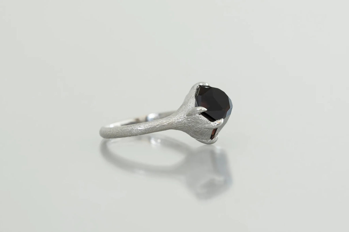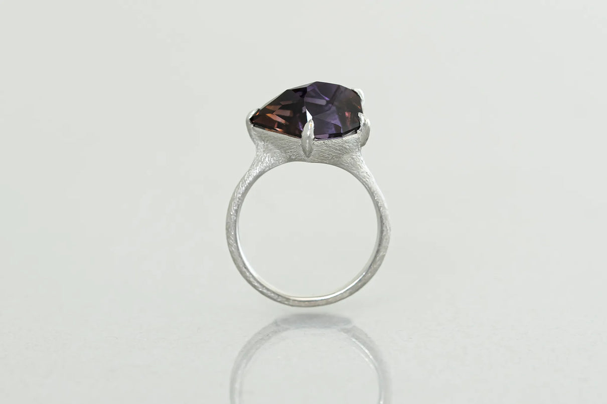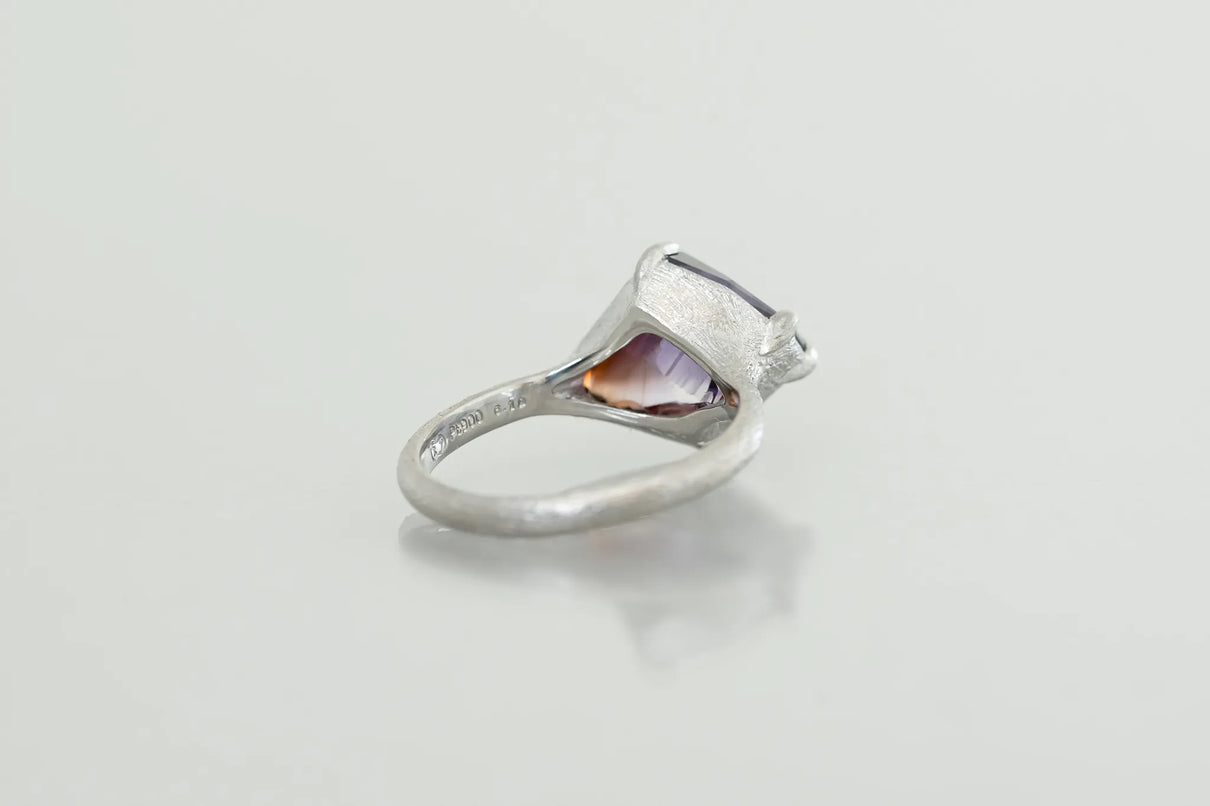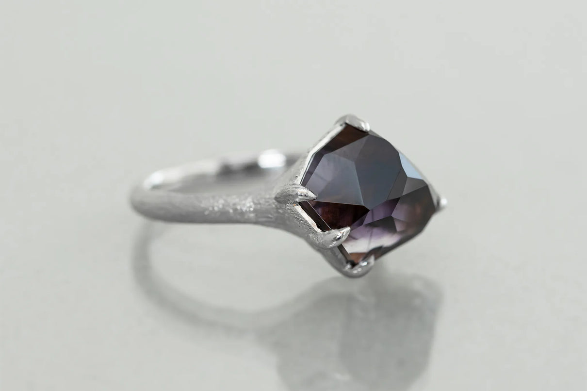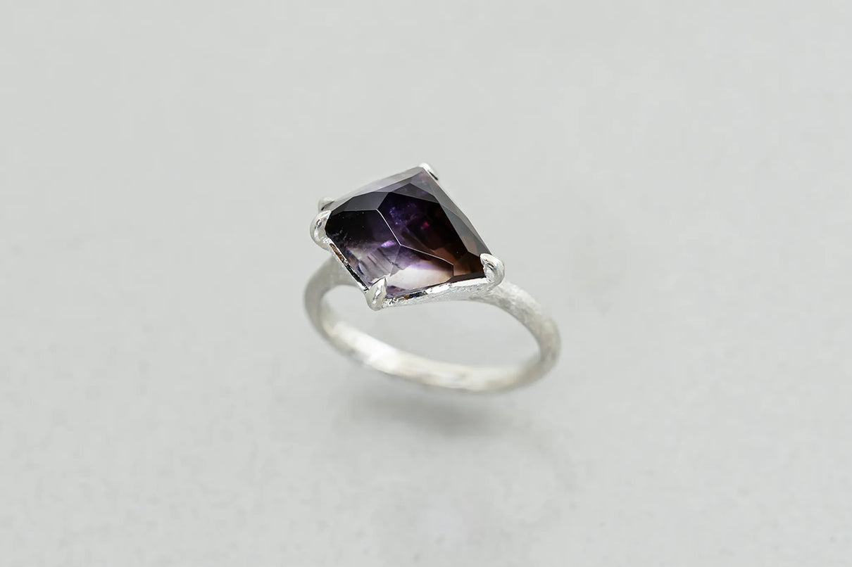 宝石研磨士・大城かん奈氏の手磨り技法による、自由で伸びやかなカッティングが施されたコニャックアメジストの一点もののリング。その名の通り、深紫の奥にひと匙のブランデーを滲ませたかのようなコニャックブラウンが魅力的な、希少な色彩のアメジスト。正面から取り込んだ光がハンドカットで屈折し、ルースの裏側にあえて残した原石肌が奥底で朧げに広がるようにたゆたう姿はまさに神秘的です。原石感を真正面から感じとることのできる立体的なランダムカットは手磨りならでは。全方位に意匠をめぐらしたルースのフォルムを拾いながらそっと包み込むように仕立てた石座と、滑らかな毛並みのようなあしらいを刻んだリングアームが有機的なリズムを生み、コニャックアメジストと一体化したような姿で手元を華やかに彩ります。宝物を指元に宿したような、揺るぎない存在感を放つ唯一無二のリングです。