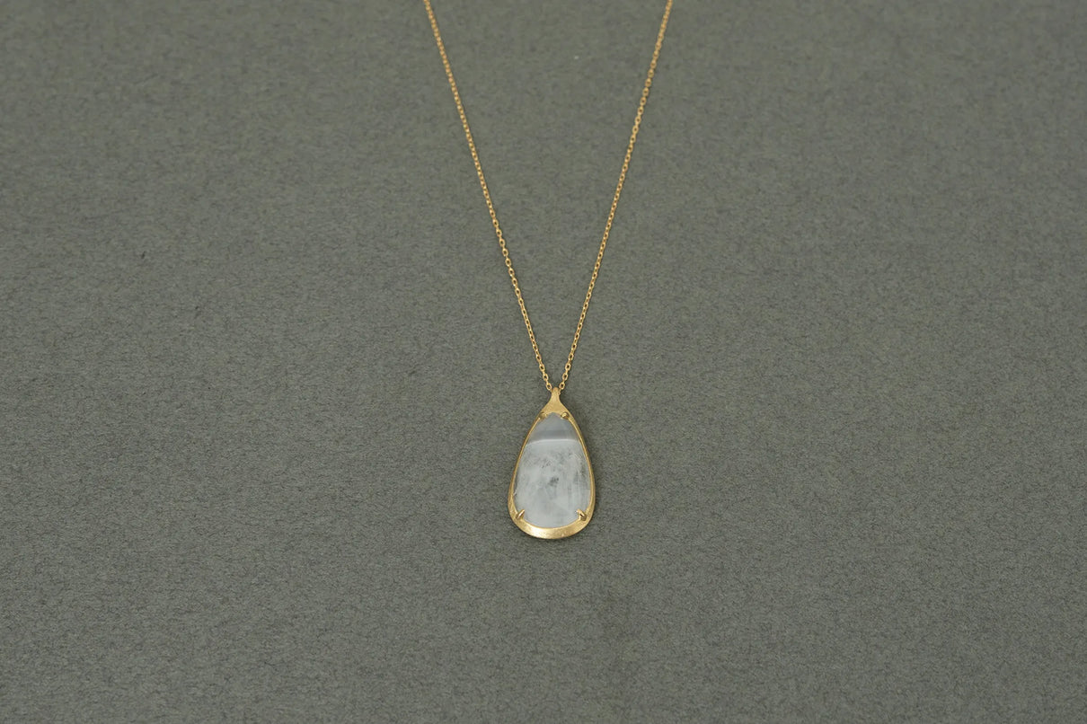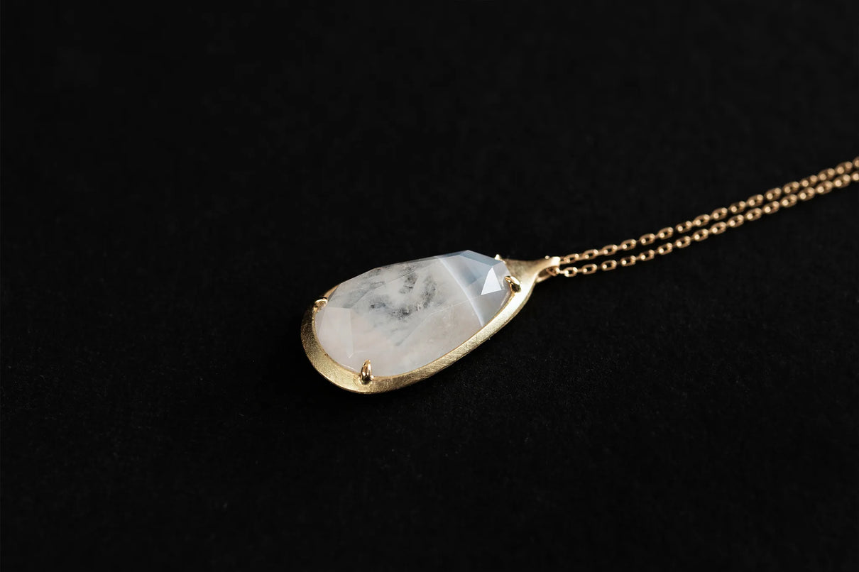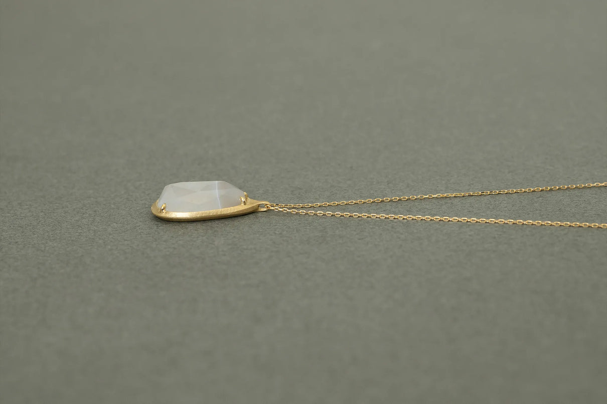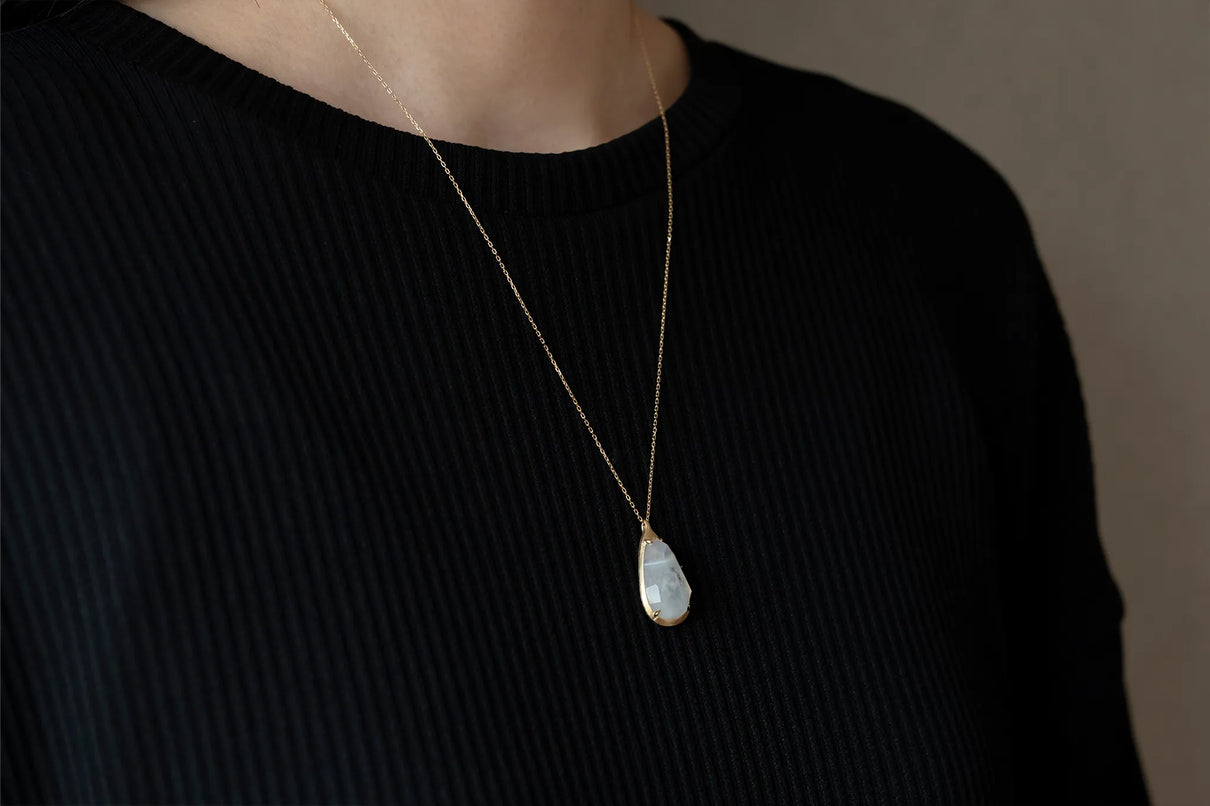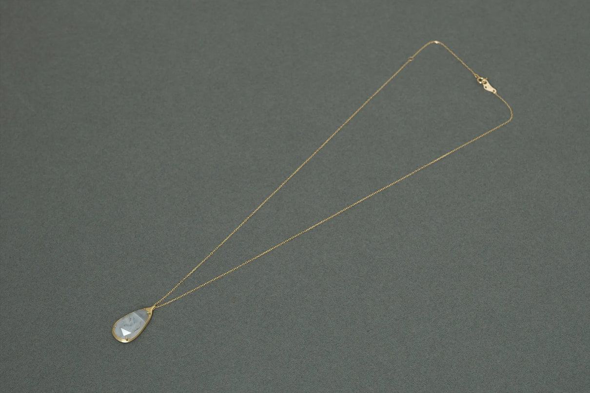 宝石研磨士・大城かん奈氏の手磨り技法による、自由で伸びやかなカッティングが施されたグレーアゲートの一点もののネックレス。雫型の上部に見える色の変わり目を帽子に見立て、上下の配色バランスを不均等に切り出し、また変わり目が水平ではなく自然な傾斜がつくようにこだわったという大城氏。冬の装いに合うようにと大きくランダムに切り出された、まるで氷のような質感と温度を感じさせるユニークなドロップカットは、「できる限りカットの手数を少なくした方が、手磨りによる光の反射を躍動的に堪能できる」という狙いのもと施されました。ルースのおおらかな印象に合わせて、優しいフォルムのフレームを仕立てました。使い勝手の良い50cmチェーンのネックレスで、日常の装いを品よく華やかに引き立ててくれることでしょう。