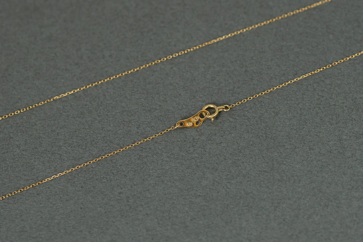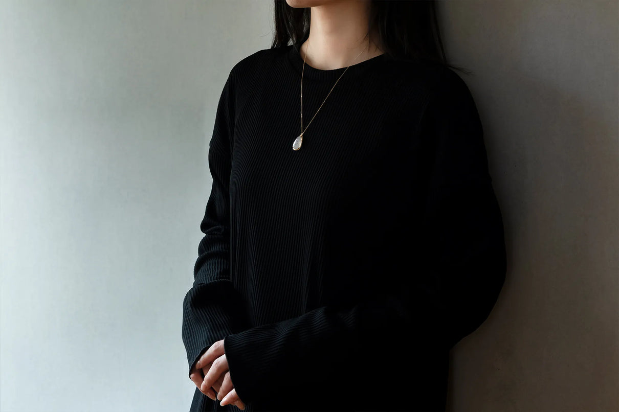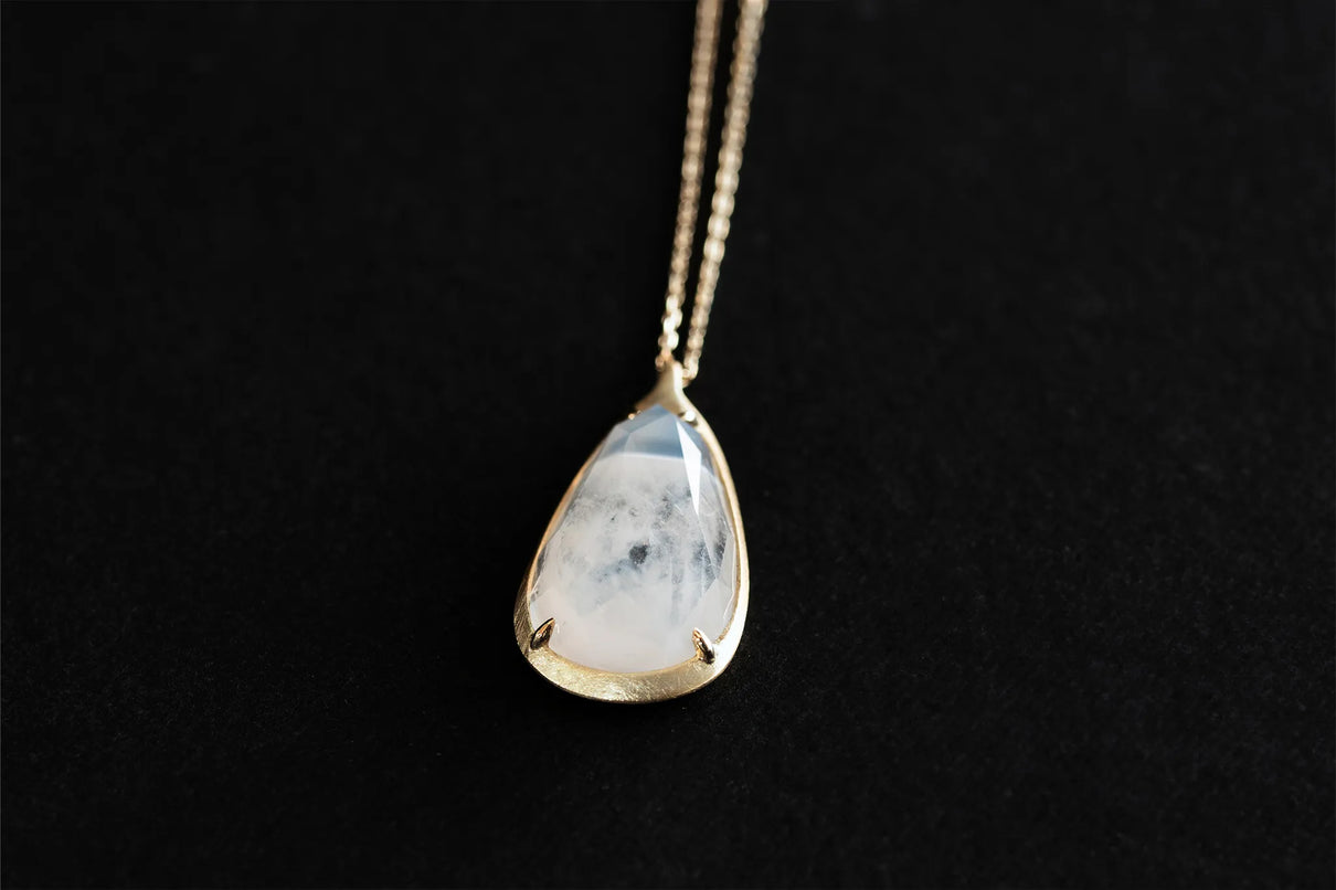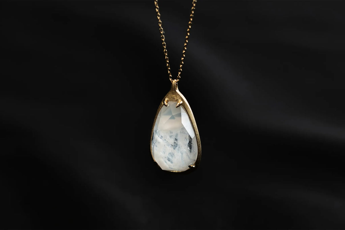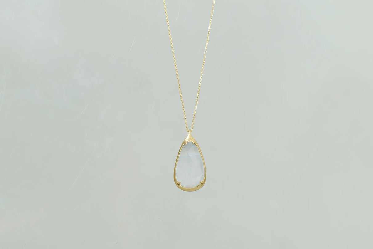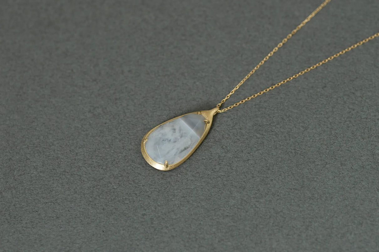 宝石研磨士・大城かん奈氏の手磨り技法による、自由で伸びやかなカッティングが施されたグレーアゲートの一点もののネックレス。雫型の上部に見える色の変わり目を帽子に見立て、上下の配色バランスを不均等に切り出し、また変わり目が水平ではなく自然な傾斜がつくようにこだわったという大城氏。冬の装いに合うようにと大きくランダムに切り出された、まるで氷のような質感と温度を感じさせるユニークなドロップカットは、「できる限りカットの手数を少なくした方が、手磨りによる光の反射を躍動的に堪能できる」という狙いのもと施されました。ルースのおおらかな印象に合わせて、優しいフォルムのフレームを仕立てました。使い勝手の良い50cmチェーンのネックレスで、日常の装いを品よく華やかに引き立ててくれることでしょう。