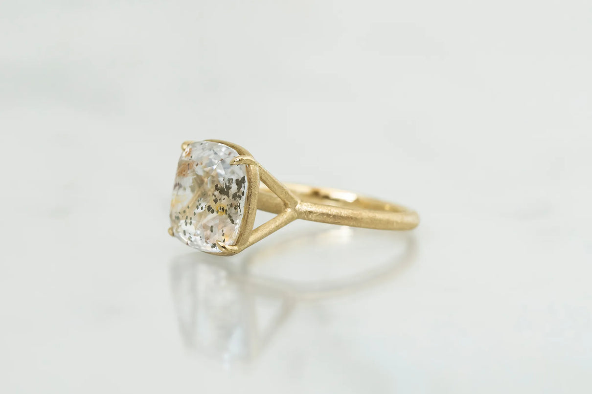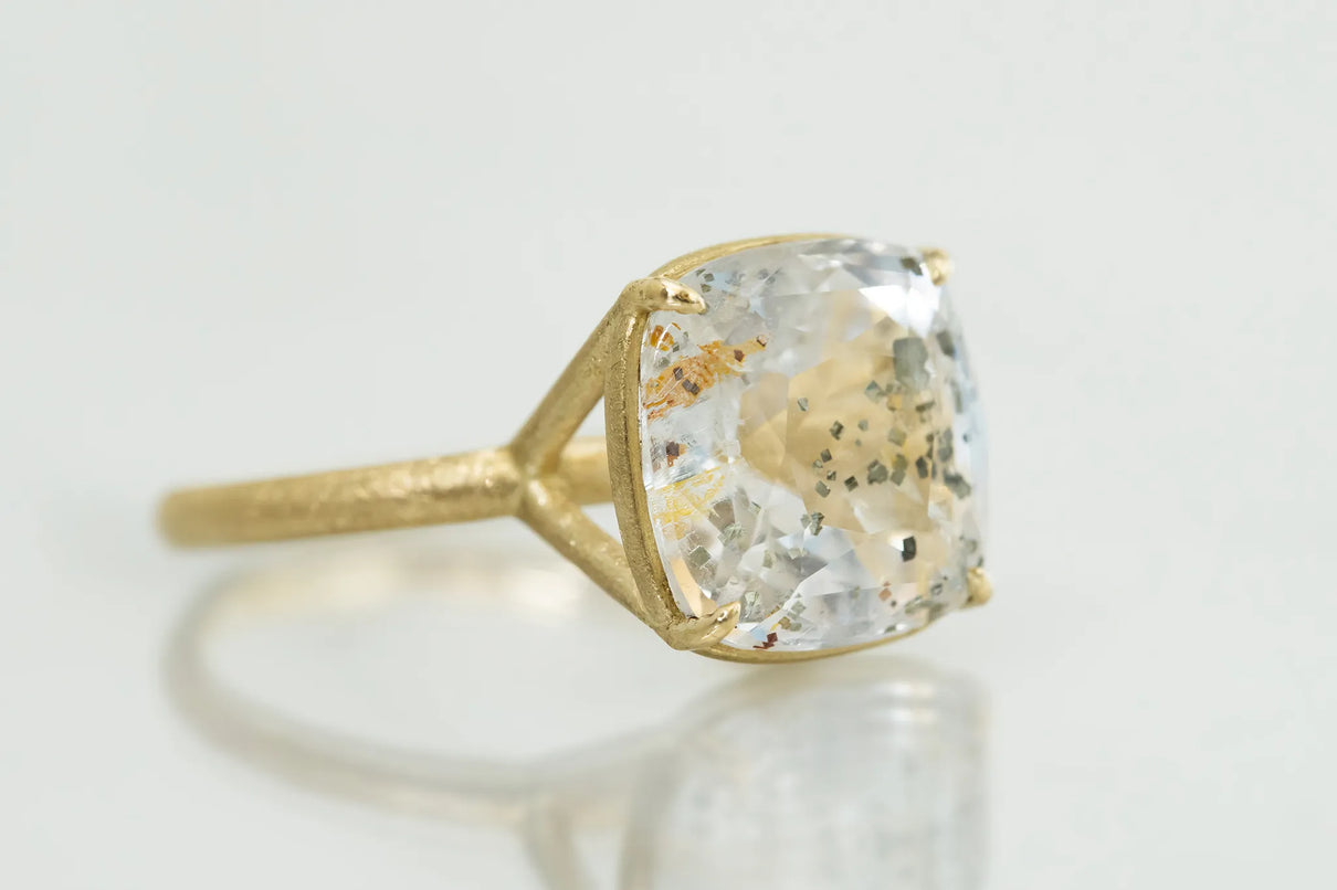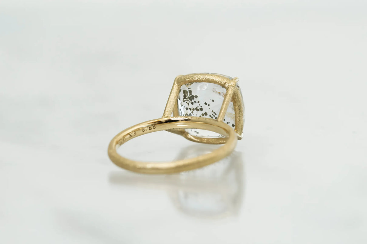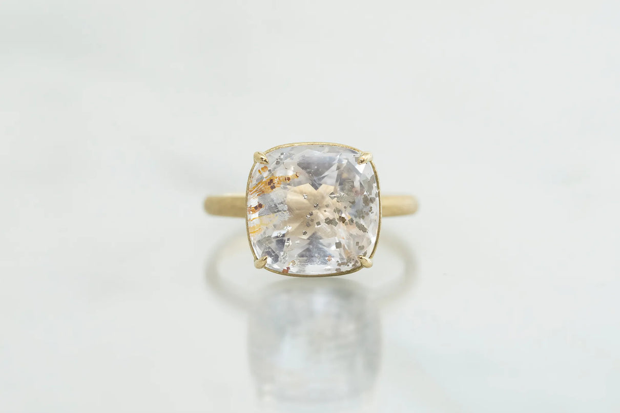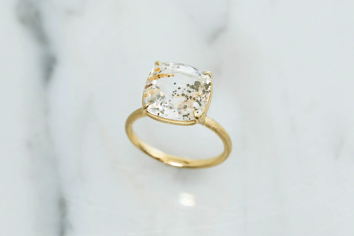 澄みわたる水晶の中に、繊細な金属の鱗が散りばめられたような姿が幻想的なマーカサイトイン クォーツで仕立てた一点もののリング。金泊のような奥ゆかしい煌めきのマーカサイトは、硫黄と鉄鉱が結びつくことで生まれた結晶。その結晶が、水晶がゆっくりと育つ過程で閉じ込められ、幾重もの偶然が重なり合って出来た美しいインクルージョンクォーツです。周りにさりげなく入るライモナイトの赤や黄色も相まって、抽象画のような印象を感じさせます。まるでルースが浮遊しているかのような構造の石座により、あらゆる角度からも美しい宝石の表情をお楽しみいただけるミニマムで建築的なデザインへ。同時に光を最大限に取り込むことができるため、手元で確かな存在感を放ち、装いに華やかさを添えてくれるアイテムです。