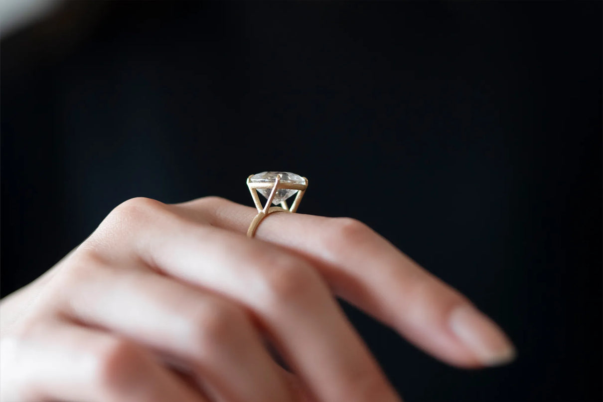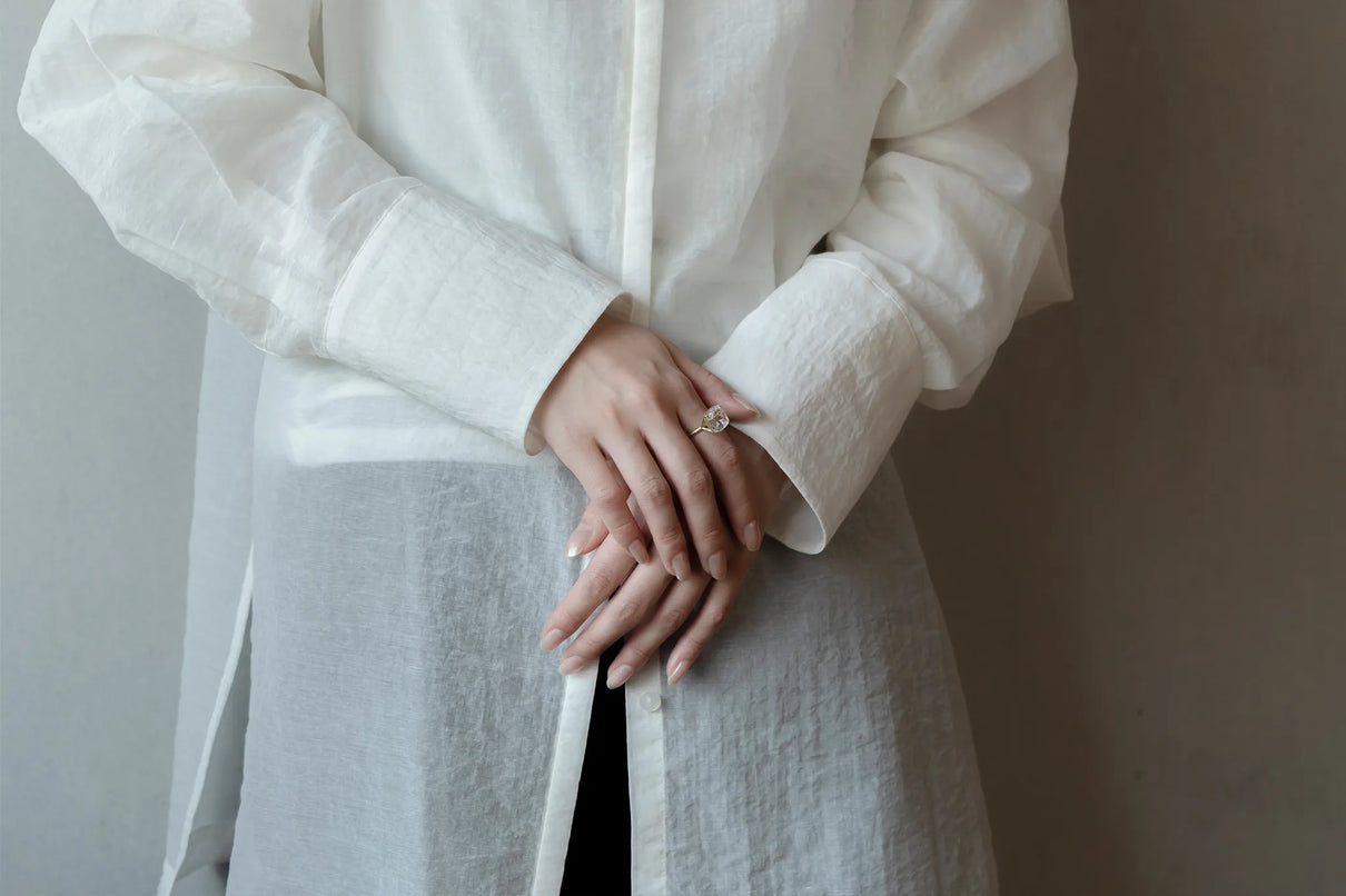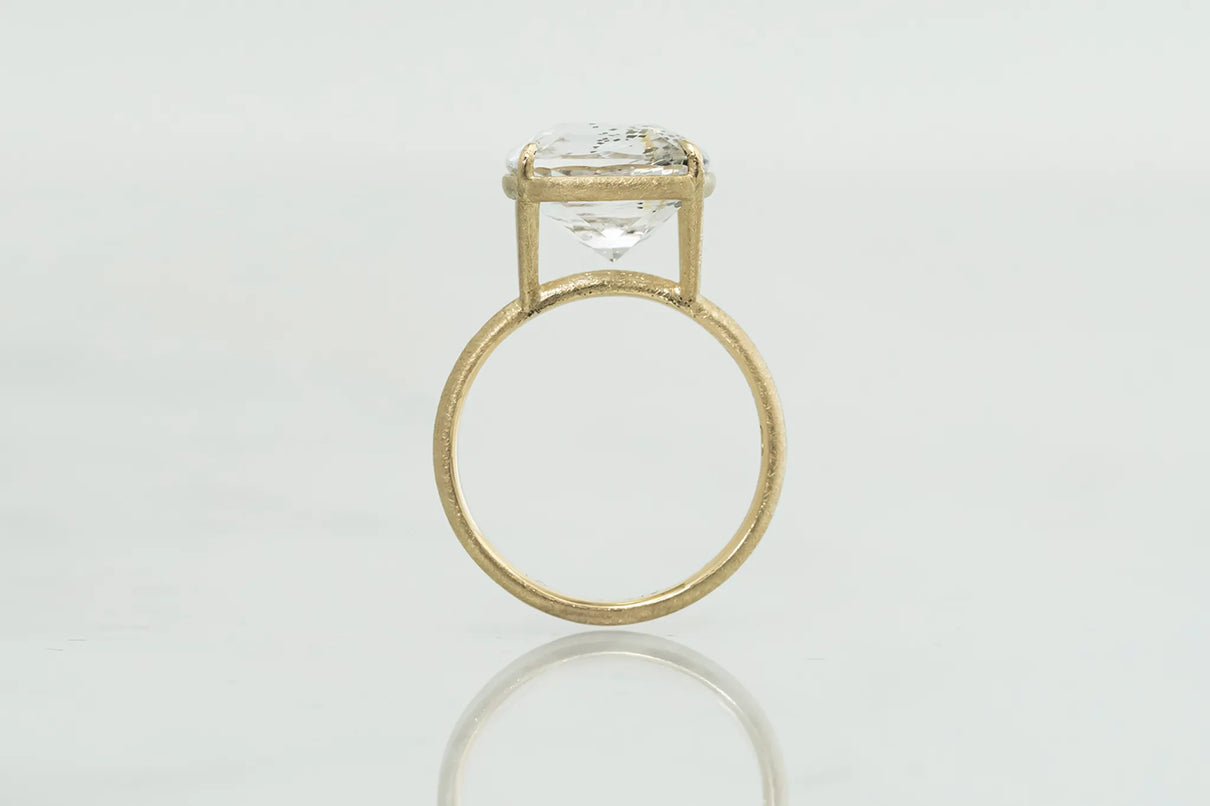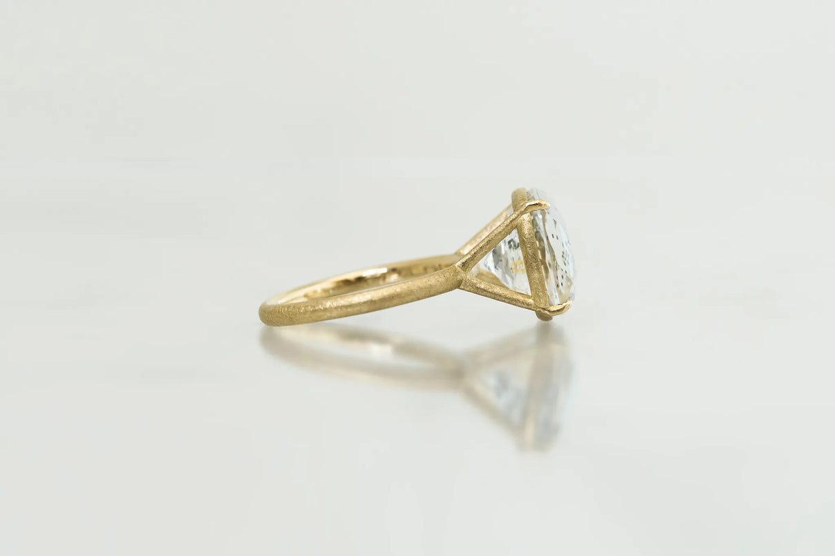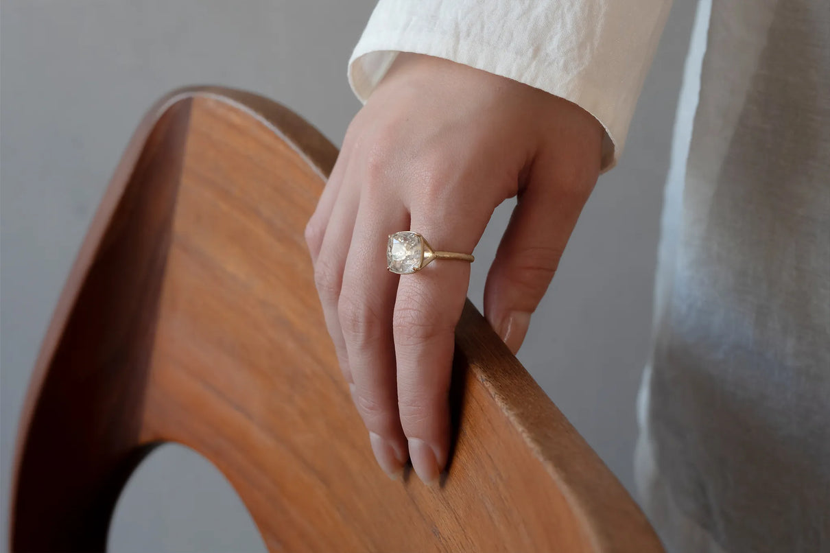 澄みわたる水晶の中に、繊細な金属の鱗が散りばめられたような姿が幻想的なマーカサイトイン クォーツで仕立てた一点もののリング。金泊のような奥ゆかしい煌めきのマーカサイトは、硫黄と鉄鉱が結びつくことで生まれた結晶。その結晶が、水晶がゆっくりと育つ過程で閉じ込められ、幾重もの偶然が重なり合って出来た美しいインクルージョンクォーツです。周りにさりげなく入るライモナイトの赤や黄色も相まって、抽象画のような印象を感じさせます。まるでルースが浮遊しているかのような構造の石座により、あらゆる角度からも美しい宝石の表情をお楽しみいただけるミニマムで建築的なデザインへ。同時に光を最大限に取り込むことができるため、手元で確かな存在感を放ち、装いに華やかさを添えてくれるアイテムです。