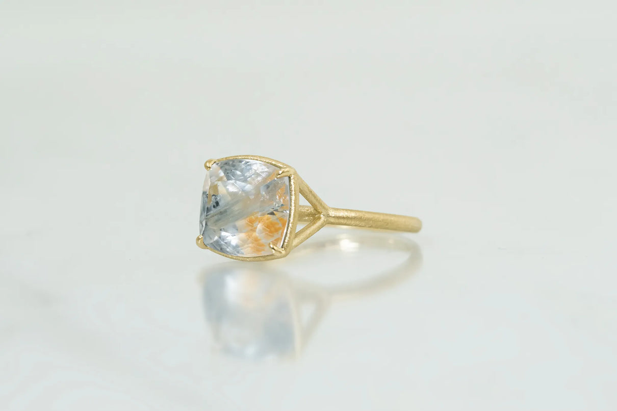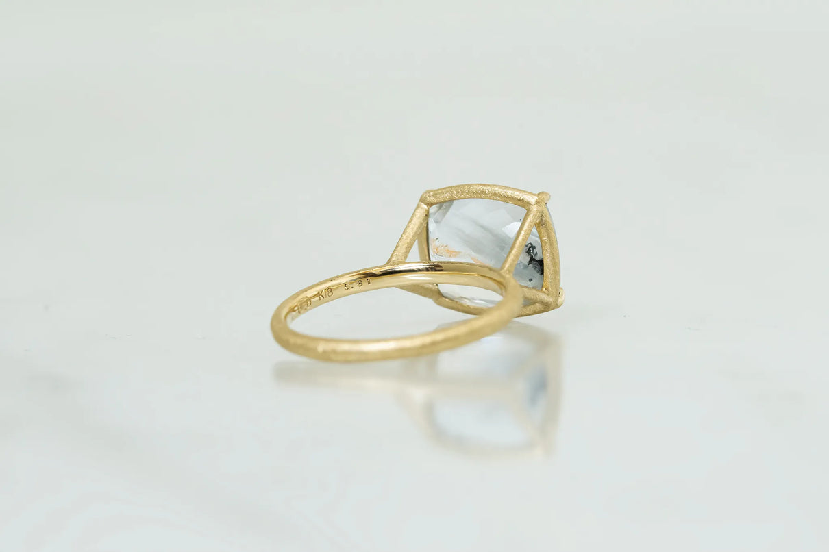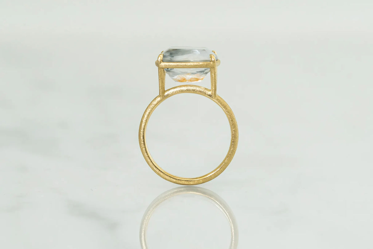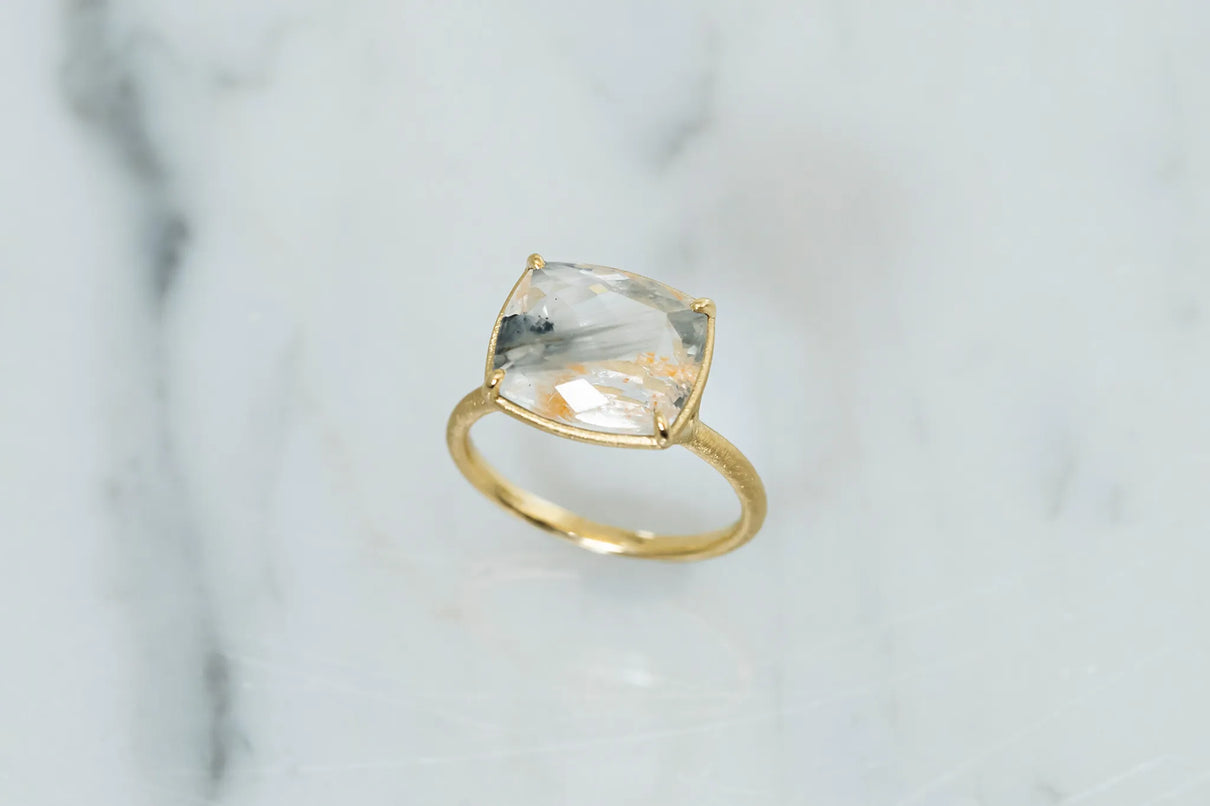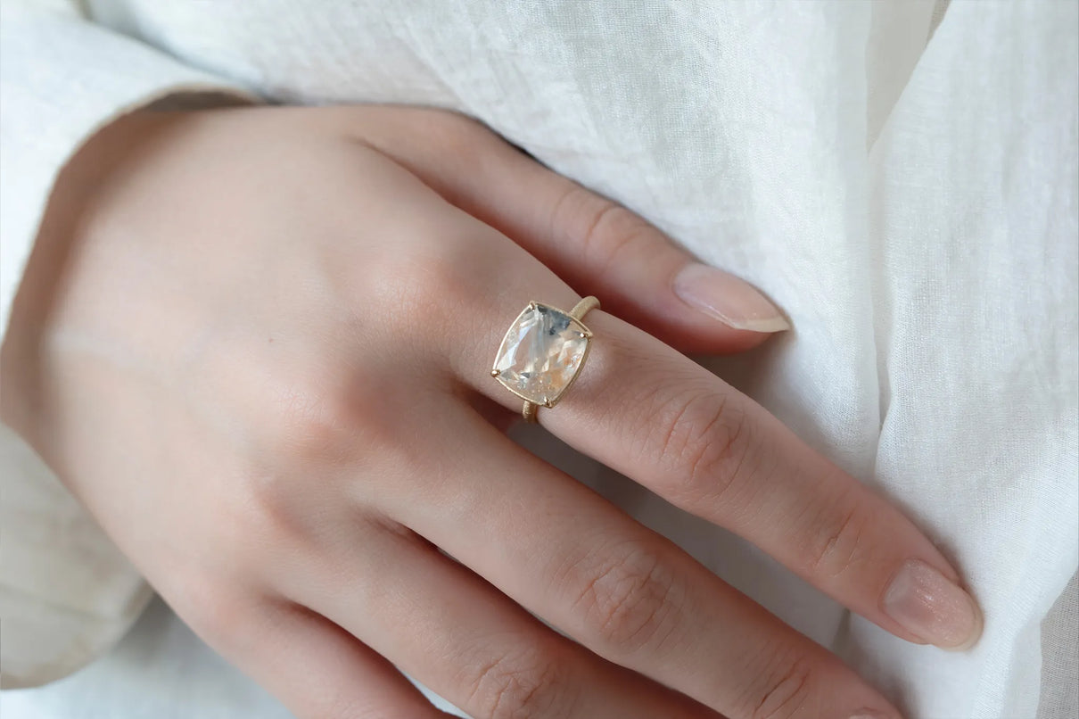 アンフィボール&ライモナイトインクォーツで仕立てた一点もののリング。ブルーグレーの繊維状の内包物であるアンフィボールと、結晶の奥に潜む淡い炎のような薄づきのライモナイト、二つの異なるインクルージョンを内に宿した、大変ユニークなクォーツです。結晶内を密度高く漂うこれらの内包物は、カット面を通して受けた光をやわらかく反射し、眺める角度によって表情を大きく変え楽しませてくれます。まるでルースが浮遊しているかのような構造の石座により、あらゆる角度からも美しい宝石の表情をお楽しみいただけるミニマムで建築的なデザインへ。日常使いはもちろん、特別な贈り物にも最適なリングです。