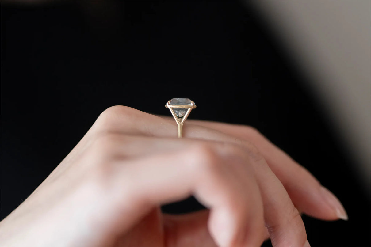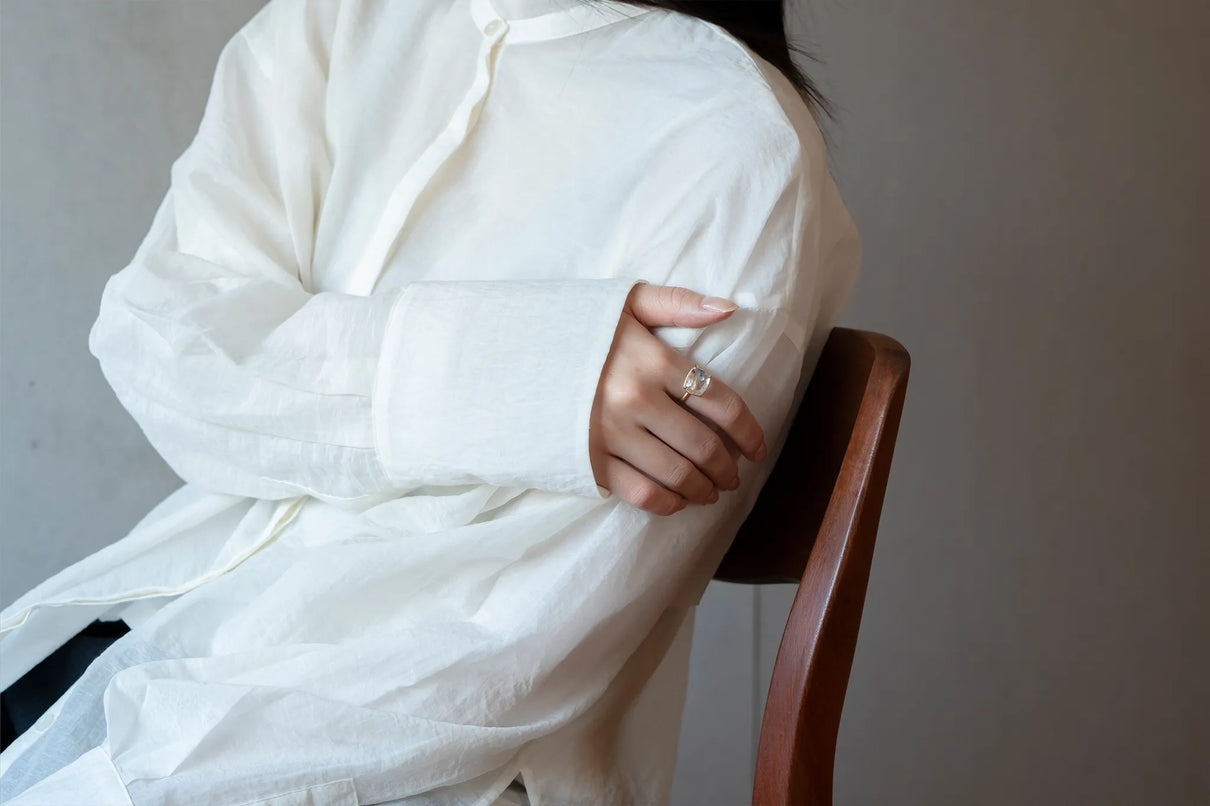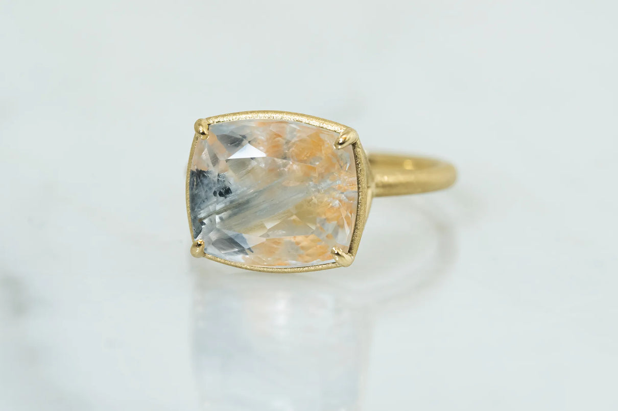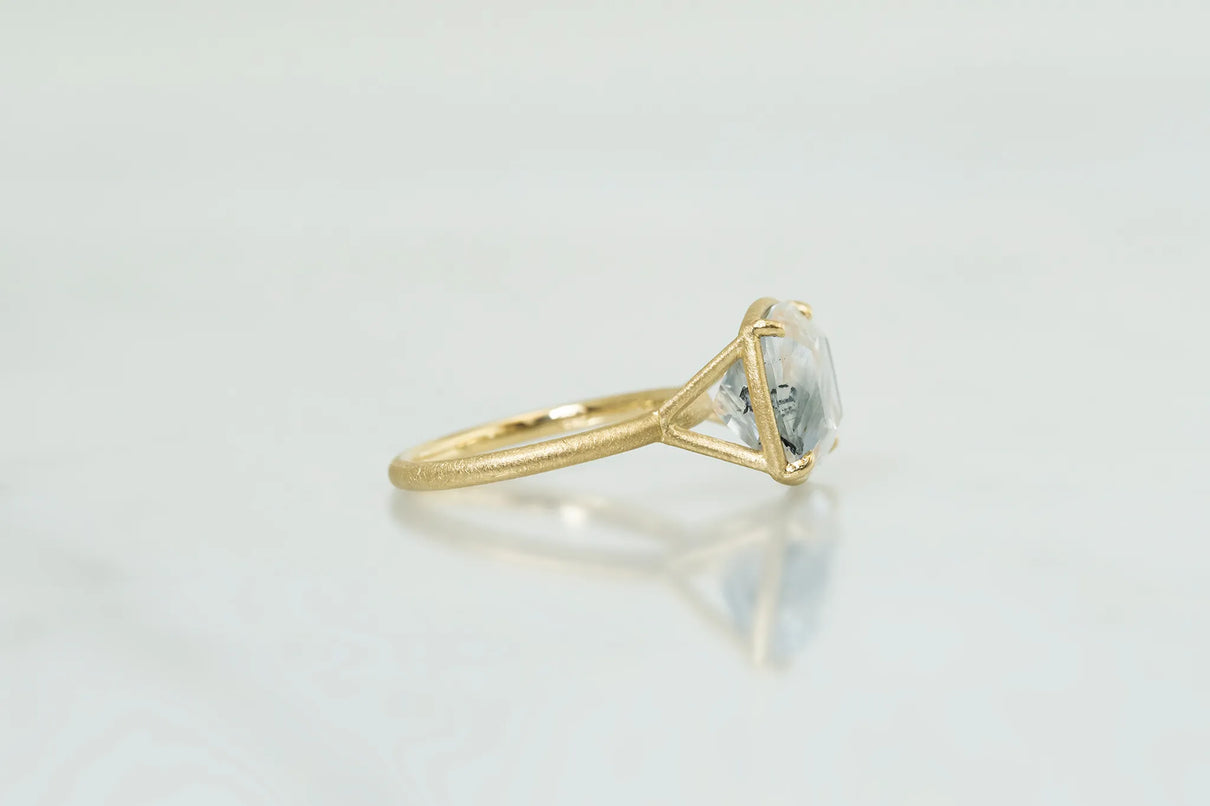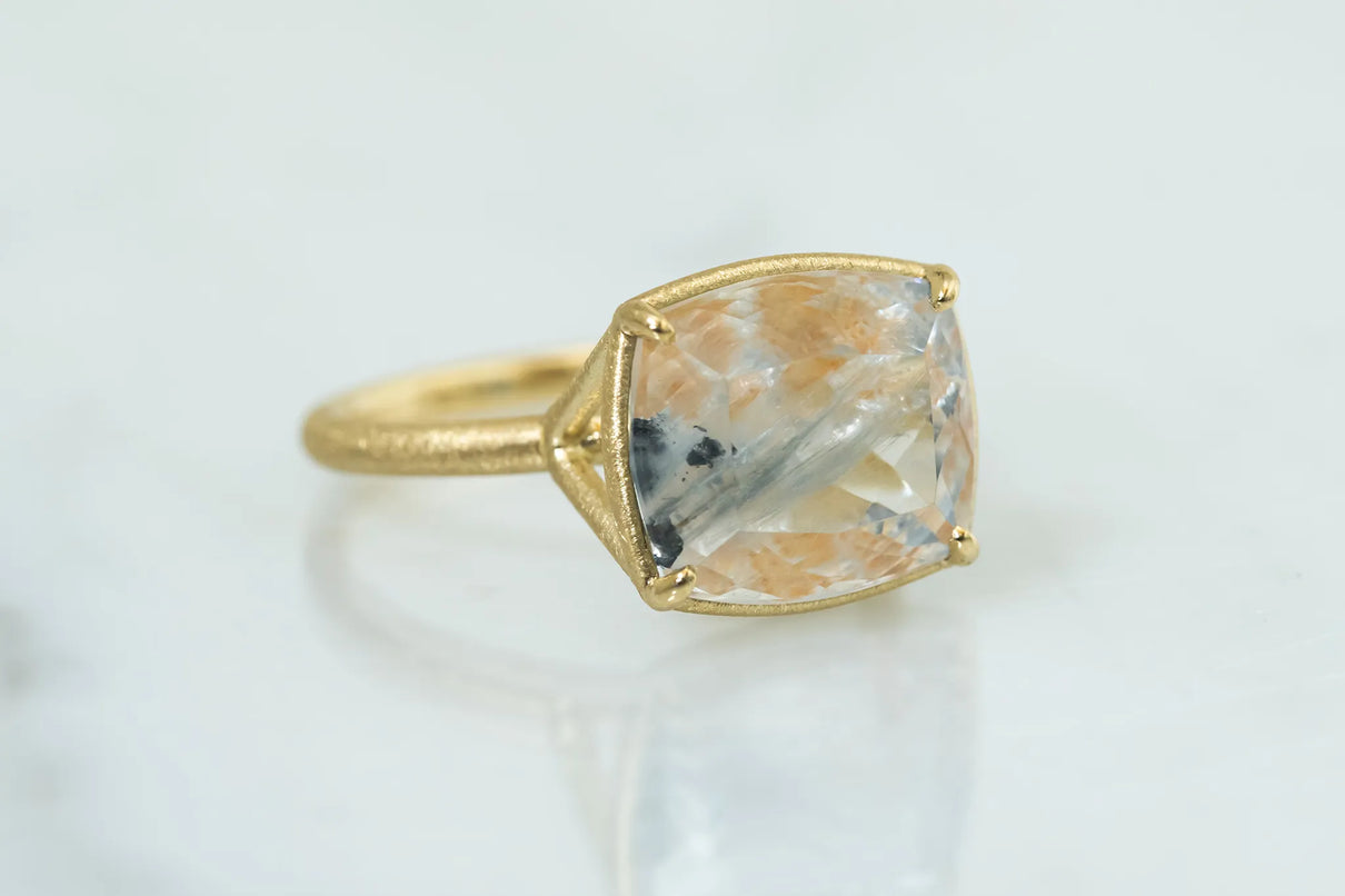 アンフィボール&ライモナイトインクォーツで仕立てた一点もののリング。ブルーグレーの繊維状の内包物であるアンフィボールと、結晶の奥に潜む淡い炎のような薄づきのライモナイト、二つの異なるインクルージョンを内に宿した、大変ユニークなクォーツです。結晶内を密度高く漂うこれらの内包物は、カット面を通して受けた光をやわらかく反射し、眺める角度によって表情を大きく変え楽しませてくれます。まるでルースが浮遊しているかのような構造の石座により、あらゆる角度からも美しい宝石の表情をお楽しみいただけるミニマムで建築的なデザインへ。日常使いはもちろん、特別な贈り物にも最適なリングです。