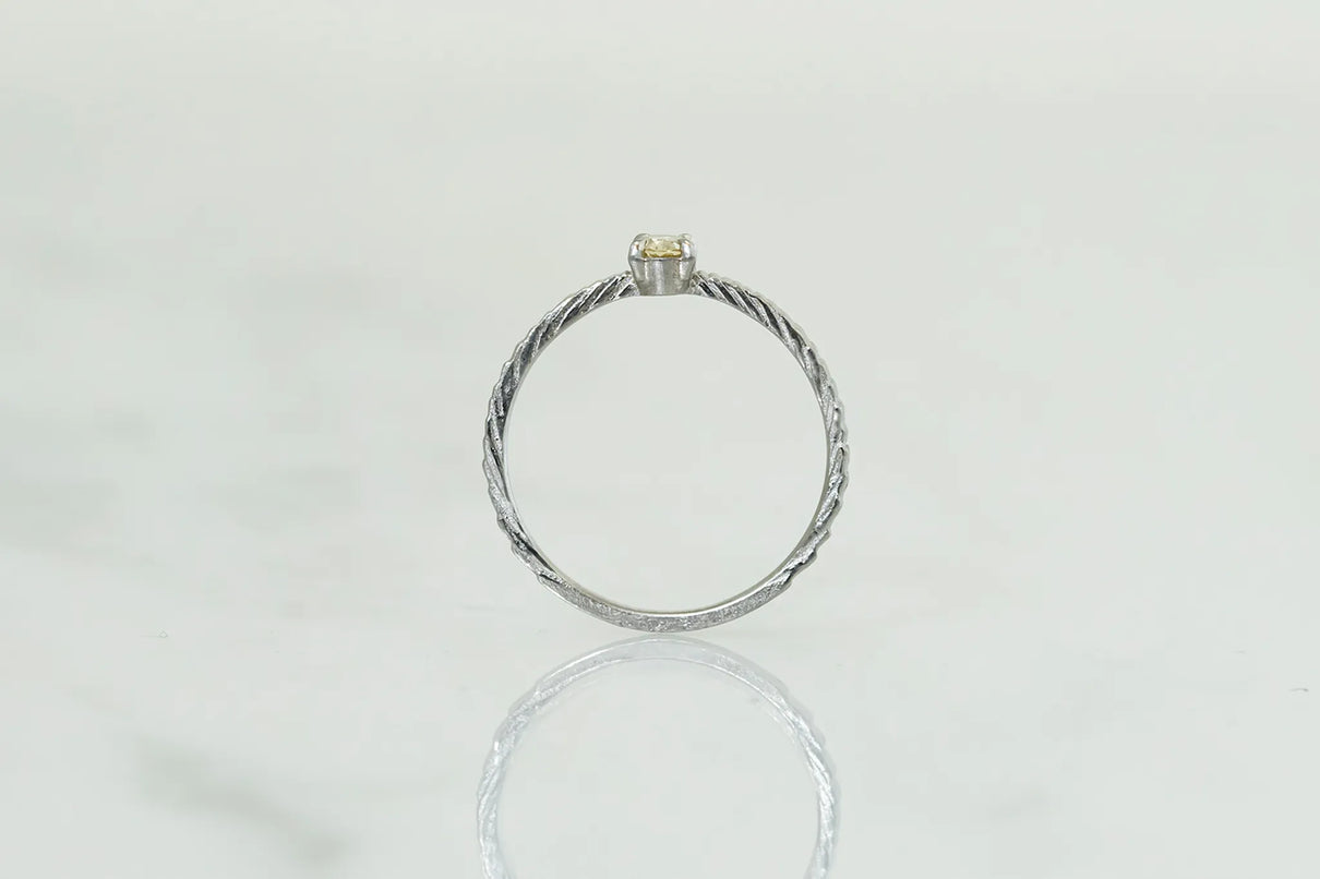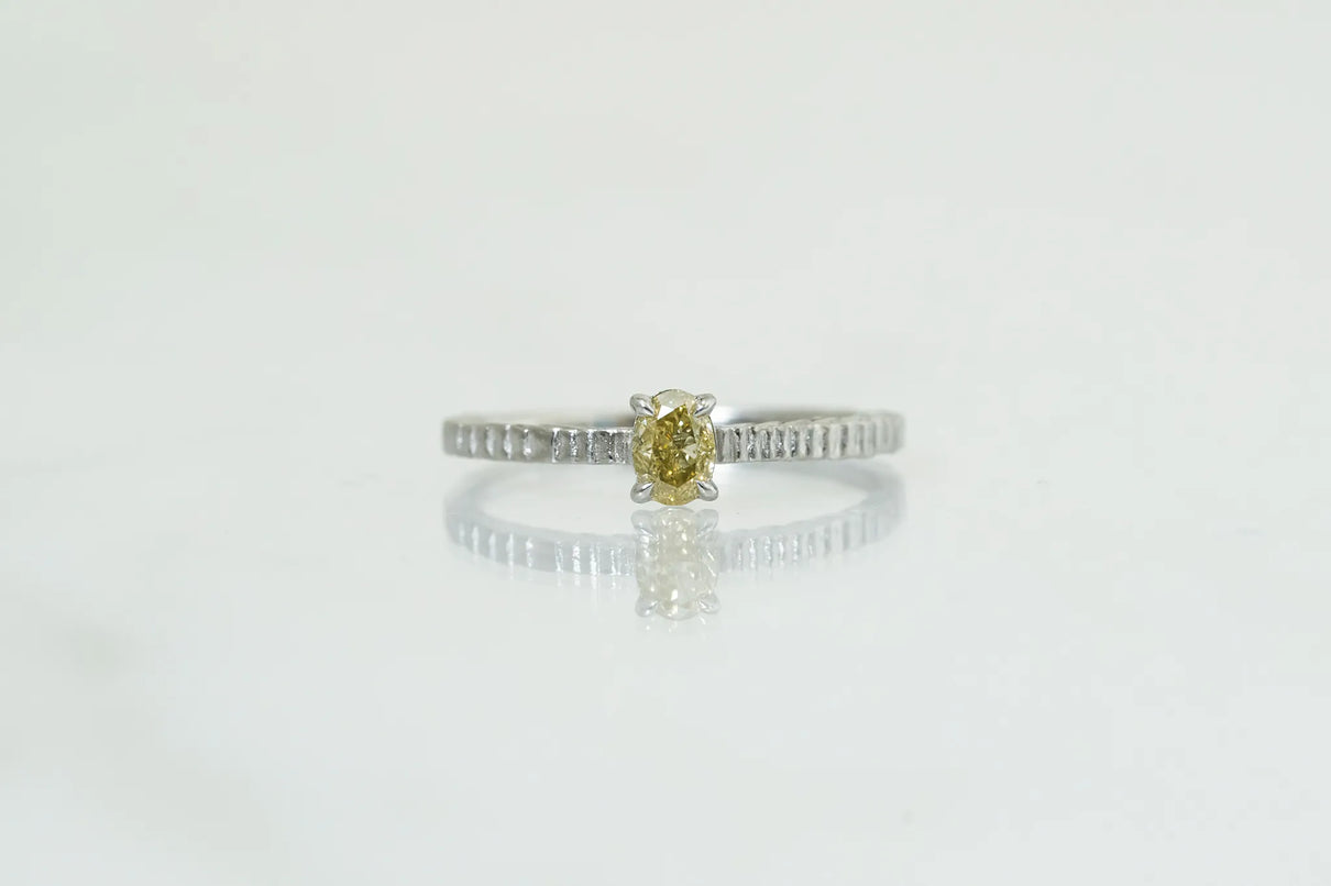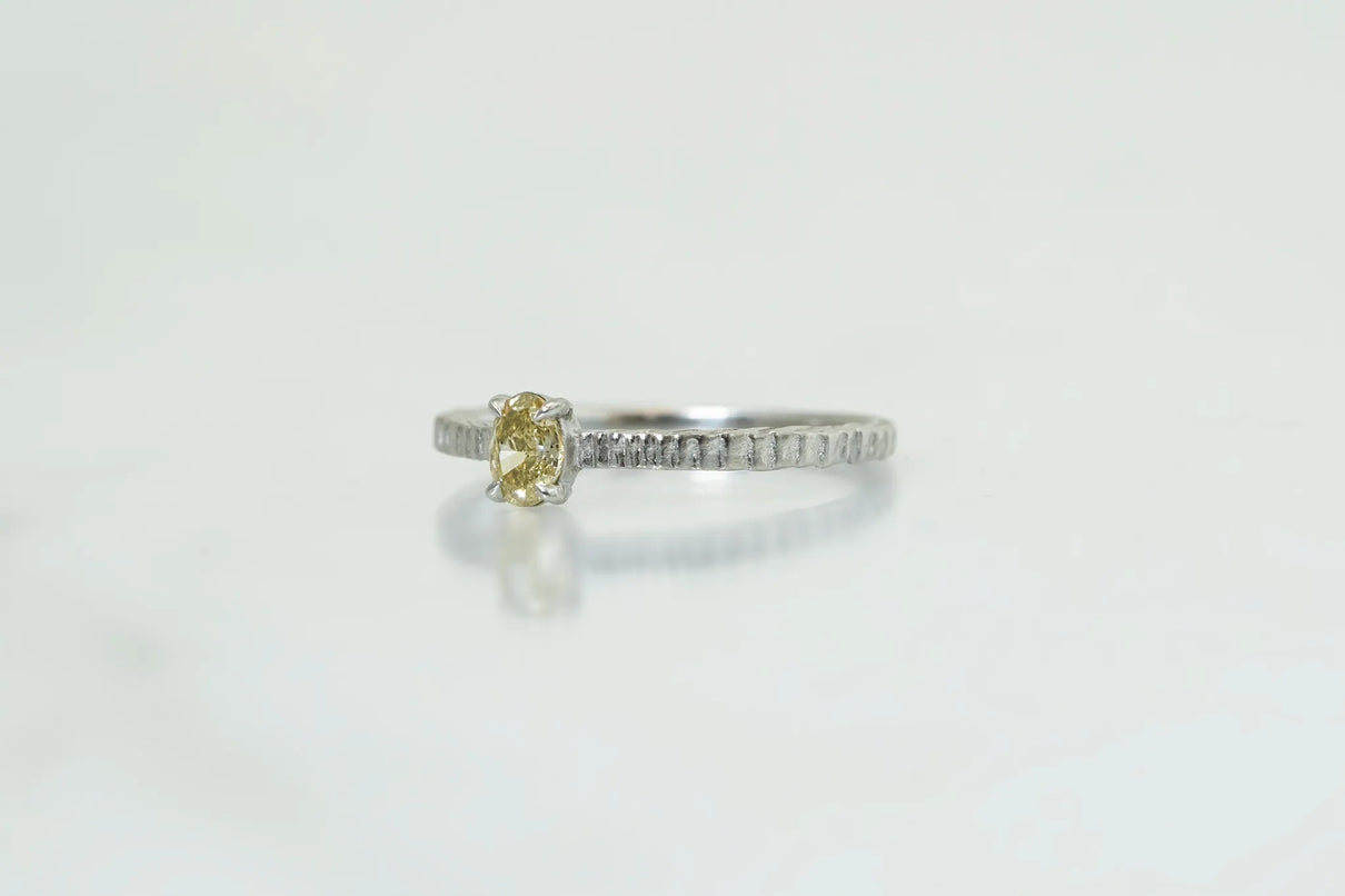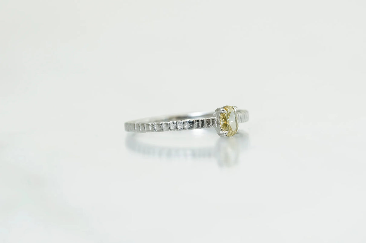 "立ち止まり、目を向ければ 大切なことは 変わらずいつもそこに在る ー" 2023 collection 「Unknown knowns」シリーズのリングベースに、照りの美しいオーバルカットのイエローダイヤモンドを留めた一点もののリング。透明度が高いイエローダイヤモンドはほどよい華やかさを湛え、プラチナの繊細なリングアームとの対比が一層引き立ちます。細身のアームは軽やかな付け心地で、普段使いのリングとして、一本使いはもちろん、重ね着けもおすすめです。