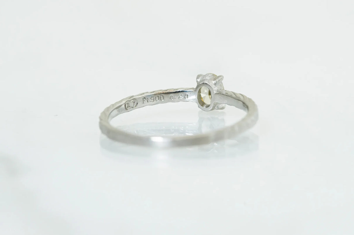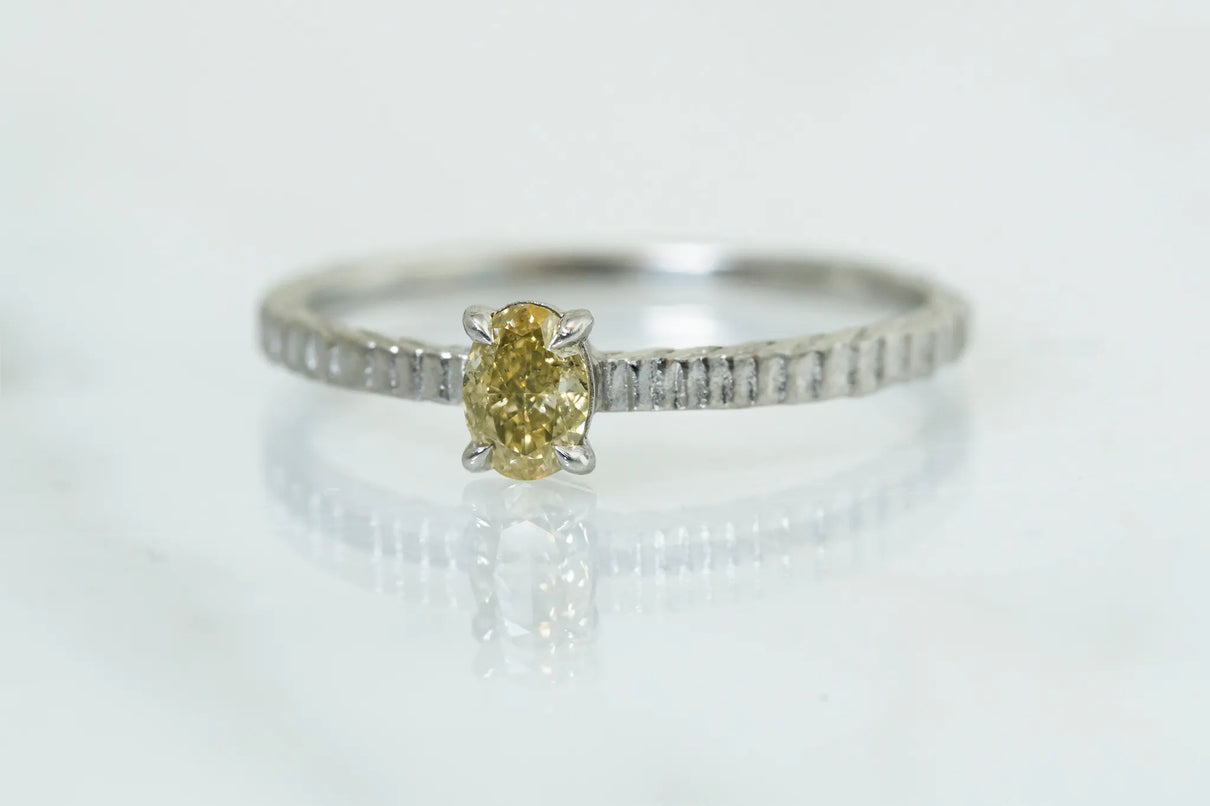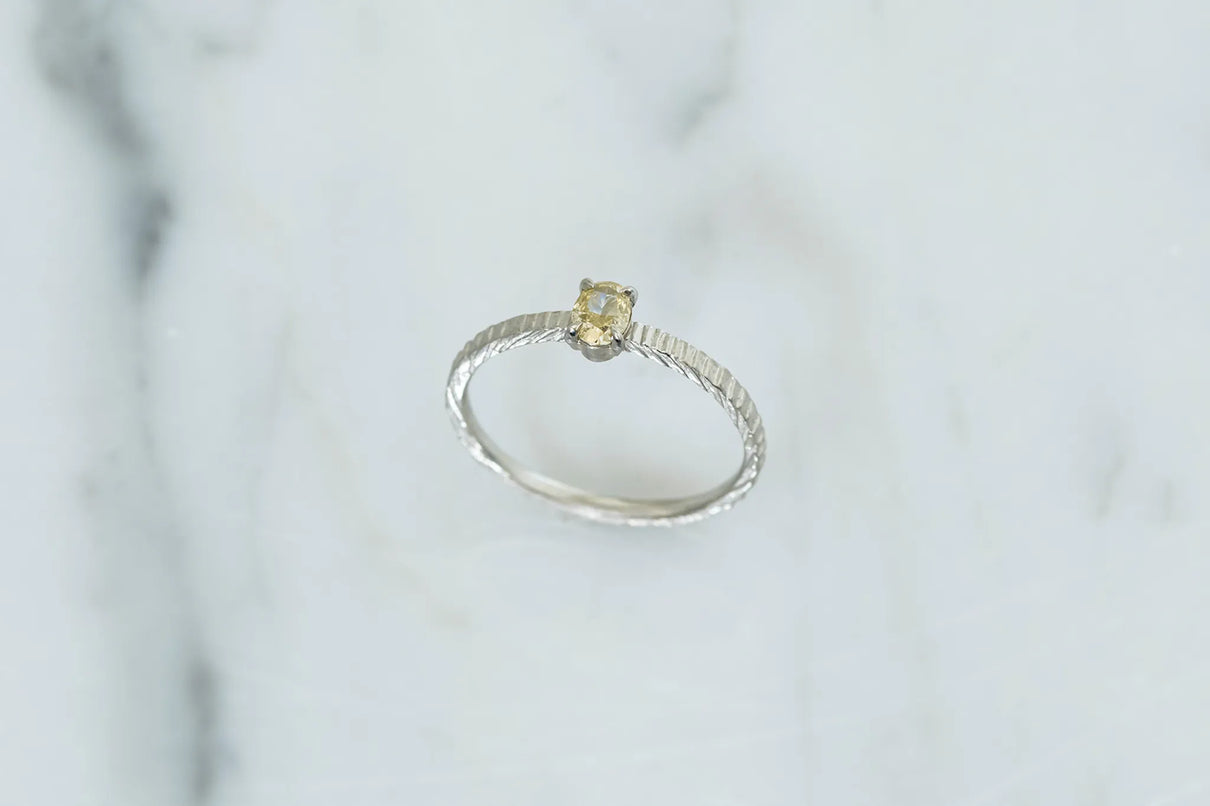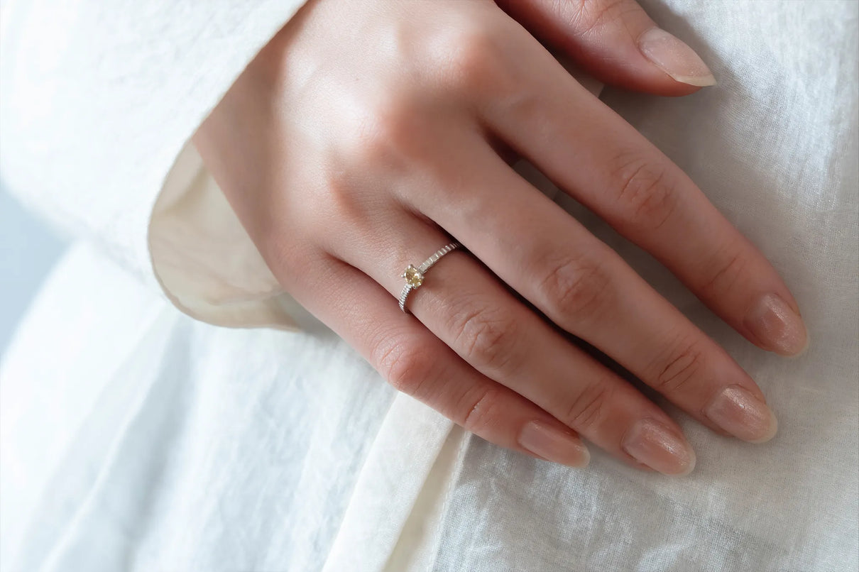 "立ち止まり、目を向ければ 大切なことは 変わらずいつもそこに在る ー" 2023 collection 「Unknown knowns」シリーズのリングベースに、照りの美しいオーバルカットのイエローダイヤモンドを留めた一点もののリング。透明度が高いイエローダイヤモンドはほどよい華やかさを湛え、プラチナの繊細なリングアームとの対比が一層引き立ちます。細身のアームは軽やかな付け心地で、普段使いのリングとして、一本使いはもちろん、重ね着けもおすすめです。