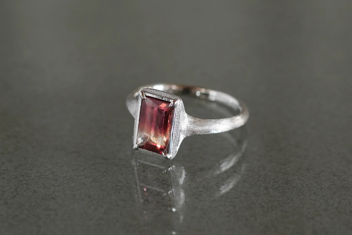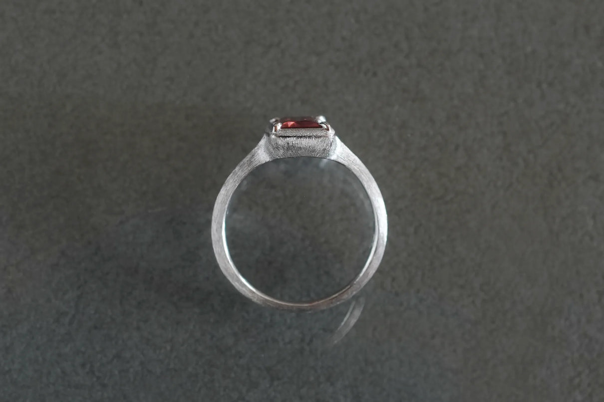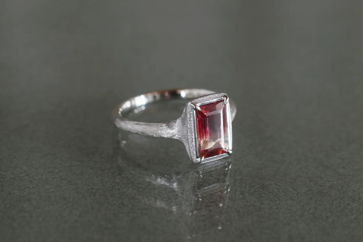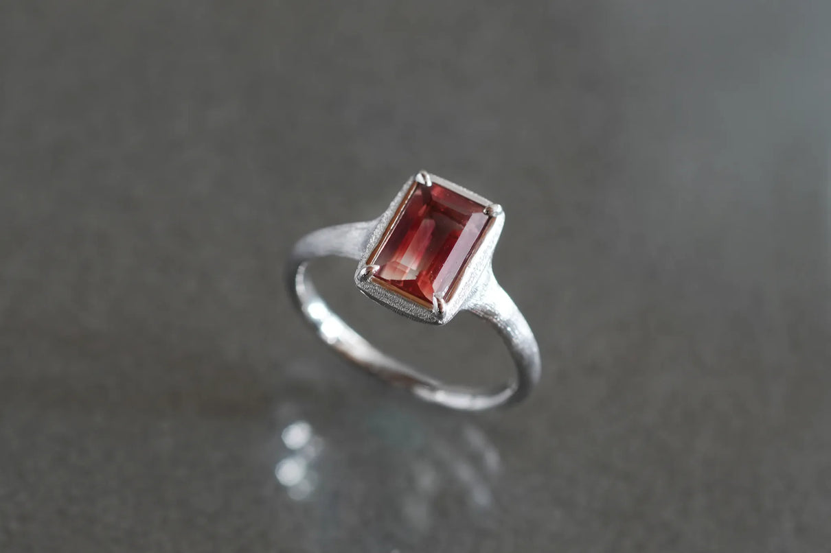 しっとりと潤みを帯びた輝きをもち、一般的なサンストーンとは異なり主にアメリカ・オレゴン州で産出される、非常に採掘量が少ない希少性の高い宝石、オレゴンサンストーン。さらには鮮やかな赤色を放つ品質の高いレッドオレゴンサンストーンは特に産出が少なく、大変希少な宝石と言われています。無色透明から深い赤へと絶妙なバランスで秘めたバイカラーのバゲットカットのこちらのピースは、まるで澄みわたる水の中に赤のインクをそっと落とし閉じ込めたかのよう。凛とした透明感の中に滲む深い赤のグラデーションが幻想的な美しさを際立たせます。照りの美しい一石を包み込む石座とリングアームは、ごく繊細なプラチナの糸を束ねたような無数のテクスチャーが光沢を帯び煌めき、一層の輝きを湛えています。上品な赤とプラチナの対比が大変華やかに映えるリングに仕立て上げました。