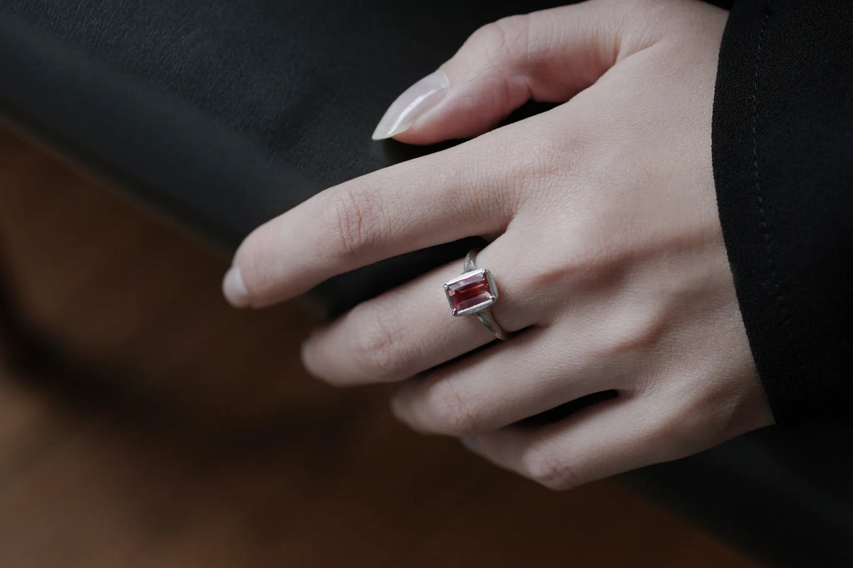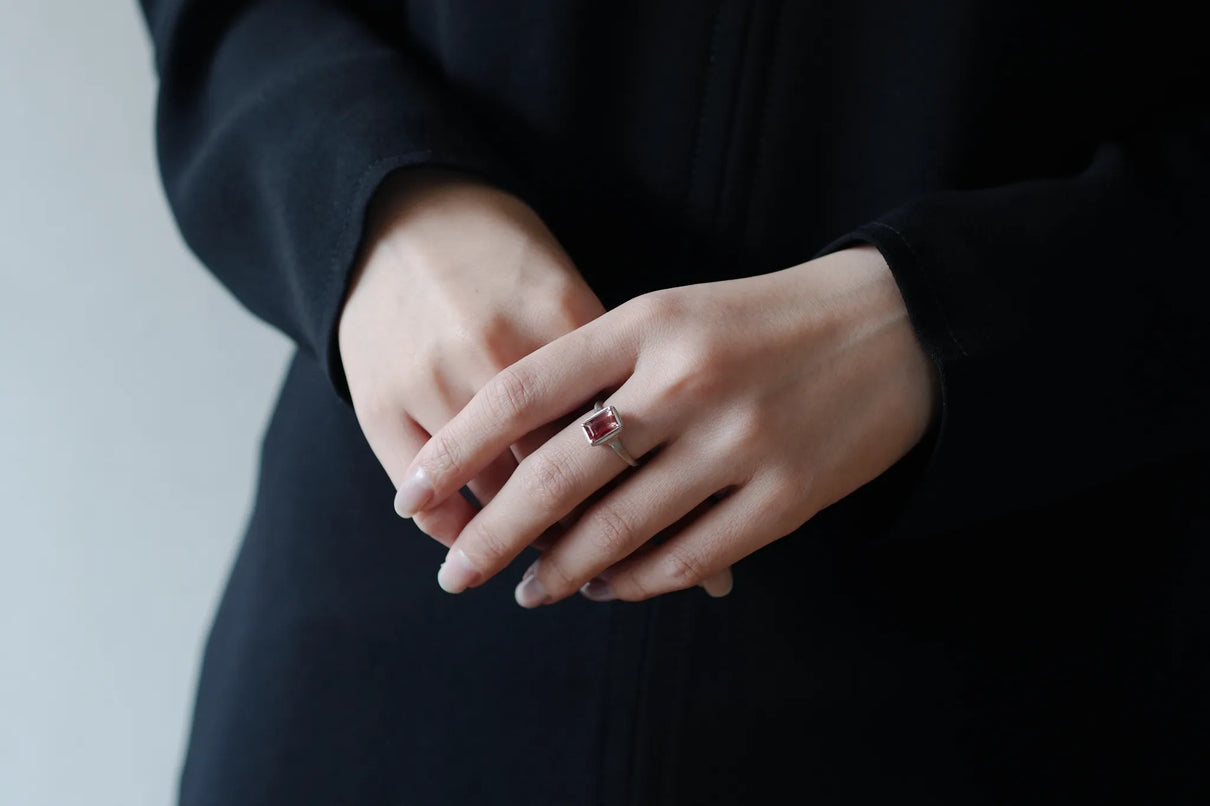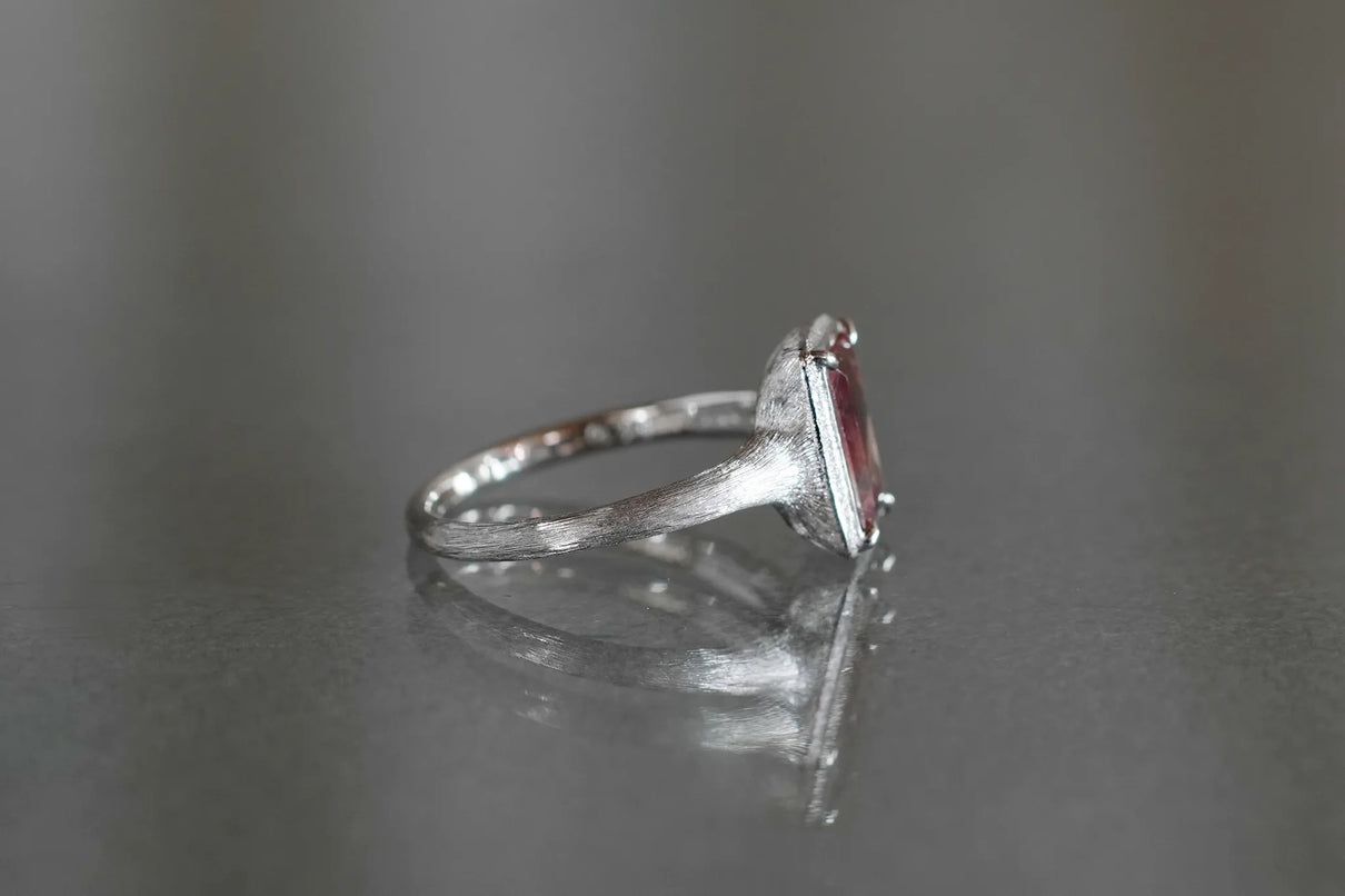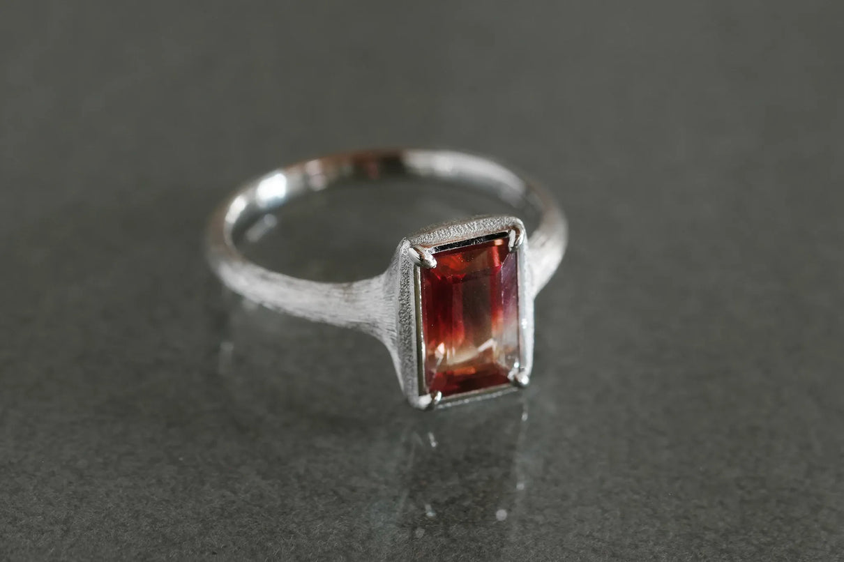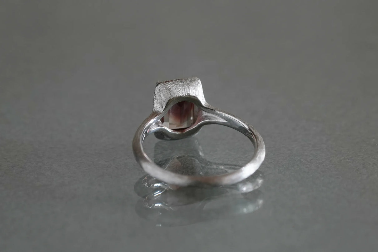 しっとりと潤みを帯びた輝きをもち、一般的なサンストーンとは異なり主にアメリカ・オレゴン州で産出される、非常に採掘量が少ない希少性の高い宝石、オレゴンサンストーン。さらには鮮やかな赤色を放つ品質の高いレッドオレゴンサンストーンは特に産出が少なく、大変希少な宝石と言われています。無色透明から深い赤へと絶妙なバランスで秘めたバイカラーのバゲットカットのこちらのピースは、まるで澄みわたる水の中に赤のインクをそっと落とし閉じ込めたかのよう。凛とした透明感の中に滲む深い赤のグラデーションが幻想的な美しさを際立たせます。照りの美しい一石を包み込む石座とリングアームは、ごく繊細なプラチナの糸を束ねたような無数のテクスチャーが光沢を帯び煌めき、一層の輝きを湛えています。上品な赤とプラチナの対比が大変華やかに映えるリングに仕立て上げました。
