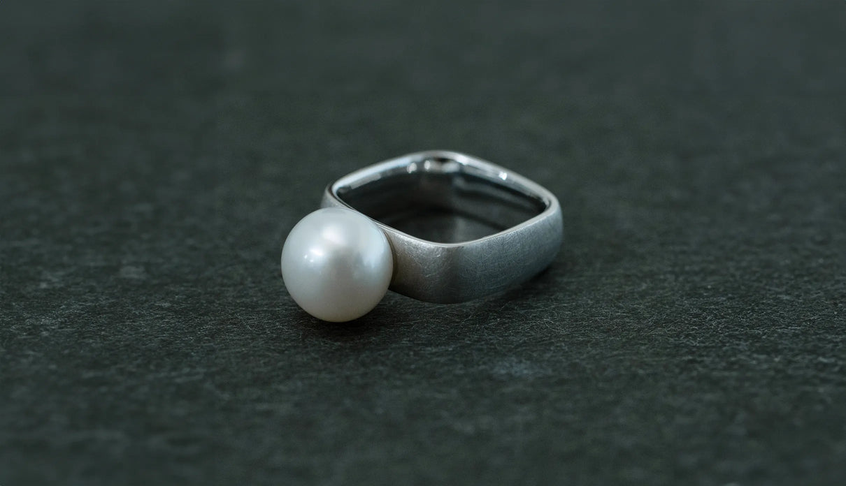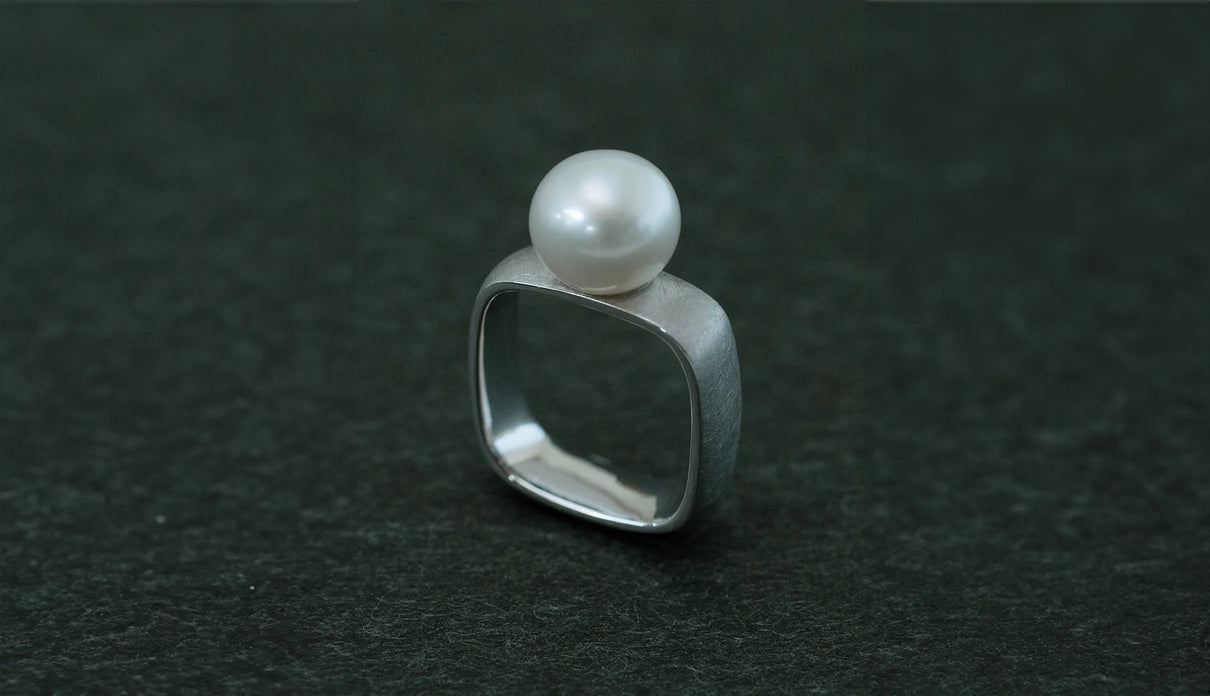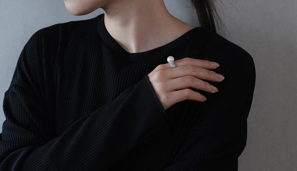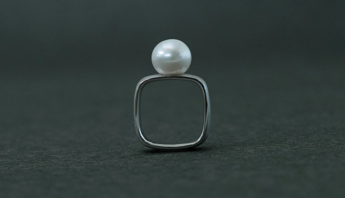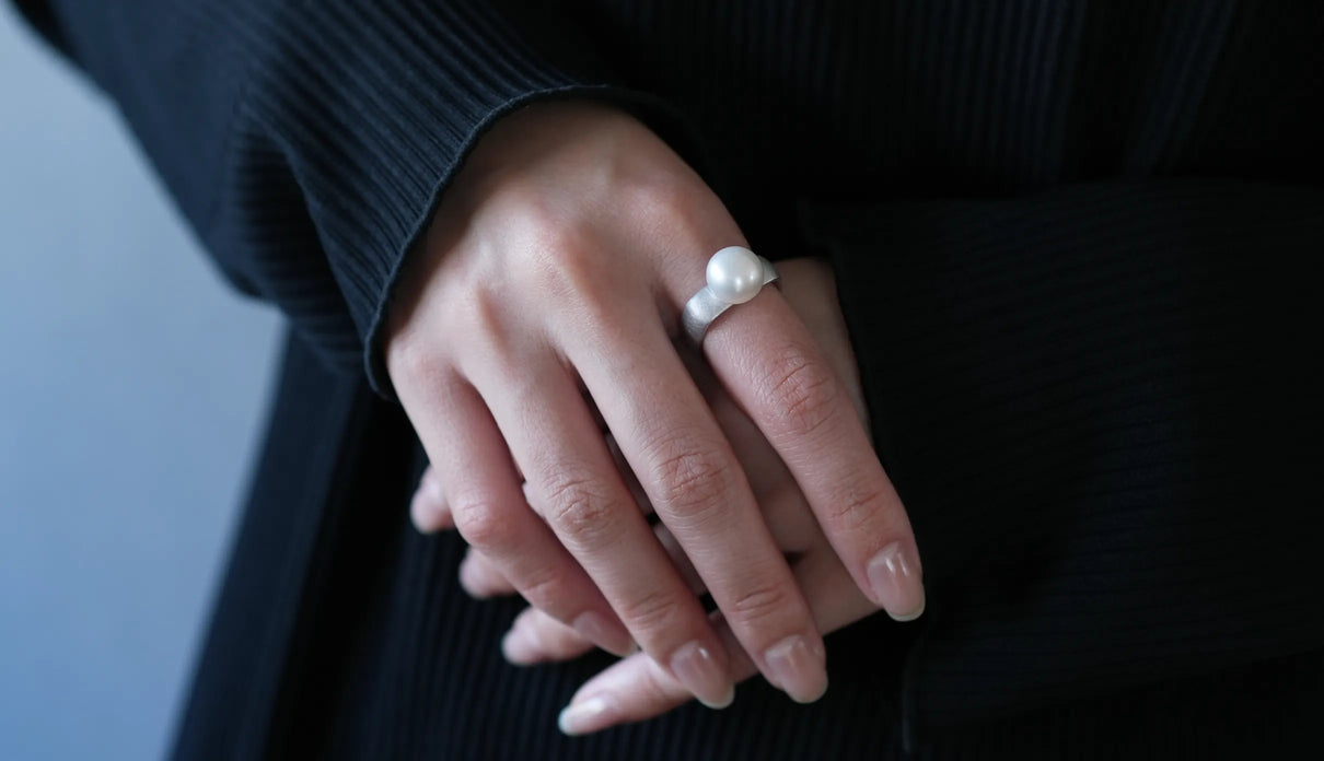 「三味線」の胴体の形から着想を得たSyamiシリーズ。古来より伝わる伝統楽器に潜む美しく柔らかな四角形が、実はまん丸ではない指の断面にフィットする最も自然なフォルムなのではと考えました。丸く滑らかに仕上げた内側はその厚みや角度にまでこだわり、四角い見た目からは想像がつかないほど気持ちの良い着け心地です。上質な艶を放つホワイトカラーの淡水パールがマットテクスチャーのシルバーリングに映え、確かな存在感を放つ一点もののアイテムです。