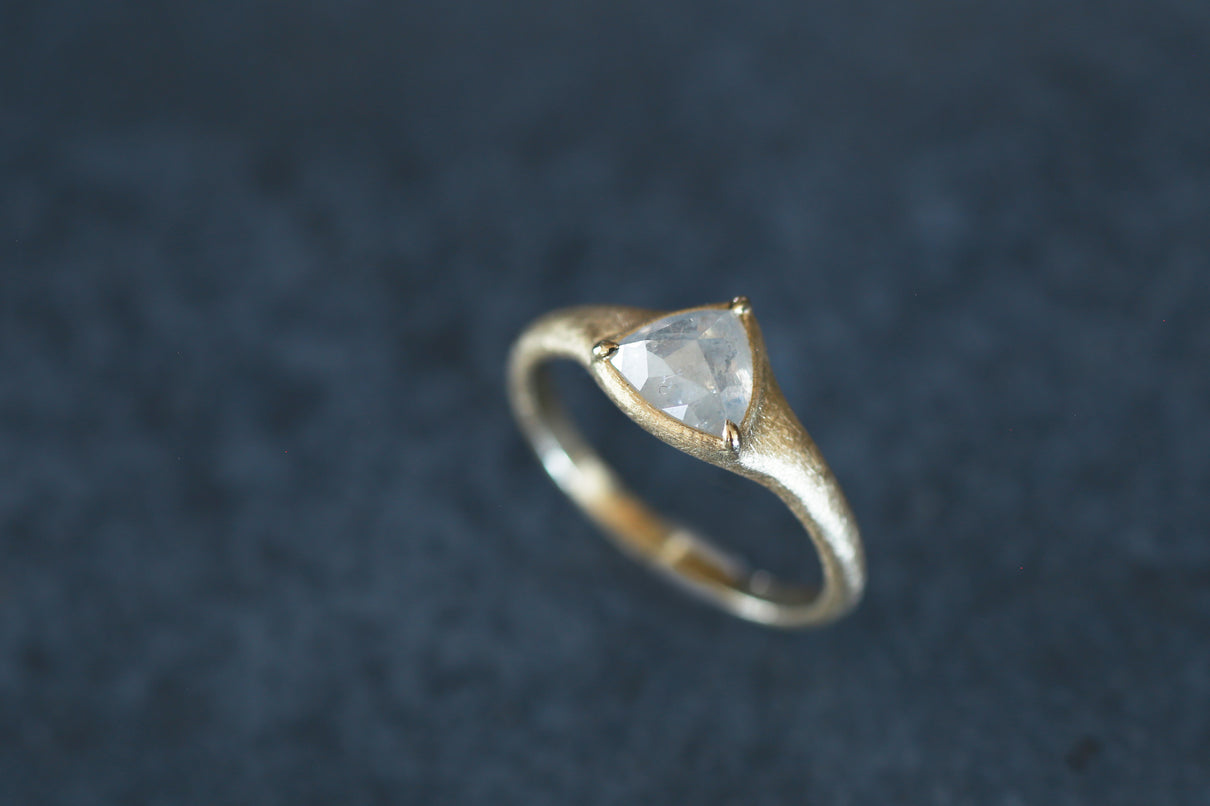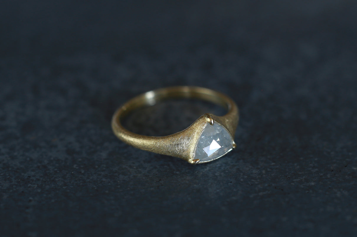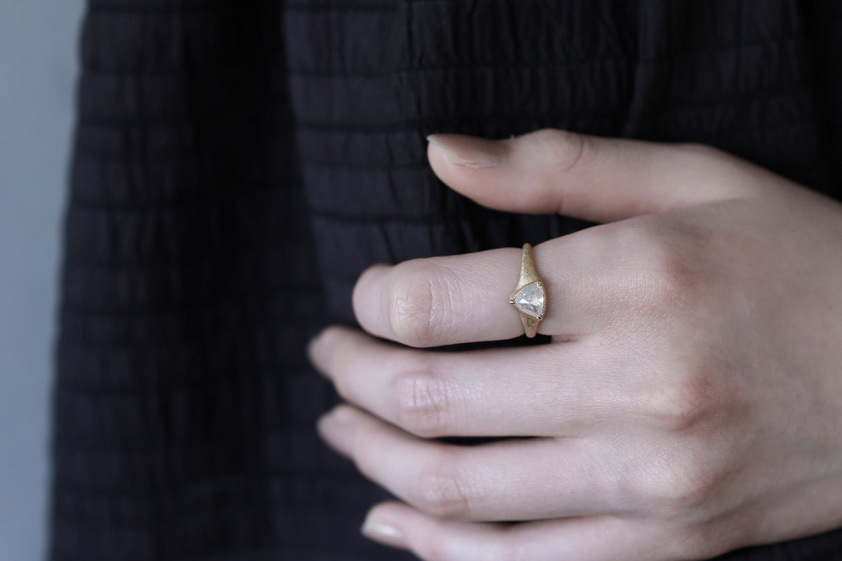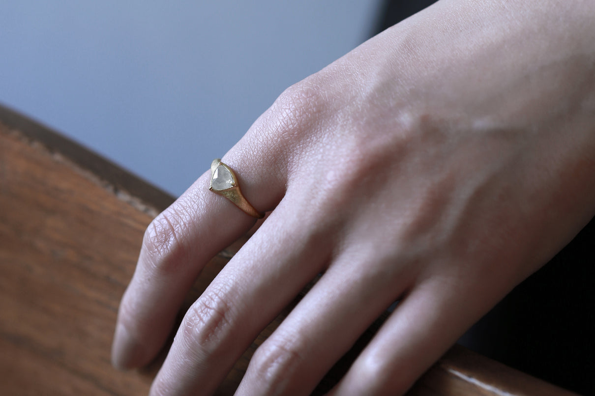 氷山のようなホワイトカラーが魅力的な、アイスカラーダイヤモンドで仕立てた1点もののリング。無色透明以外にも多種多様なカラーが存在するダイヤモンドの中でも、美しい乳白色は希少価値の高いものとされています。今回厳選したのはやや丸みのあるトライアングルのカットの中に、まるで霜が降りたかのように繊細な内包物がつくり出す、優しいオフホワイトカラーの景色が美しいピースです。K18ゴールドリング部分には手仕事の跡が感じられる柔らかなマットテクスチャーを施し、アイスカラーダイヤモンドの美しさを引き出しながら、優しい印象を備えた佇まいに仕上げました。ダイヤモンドならではの強く華やかな煌めきを讃えた、装いの主役となるような確かな存在感のある特別なリングです。