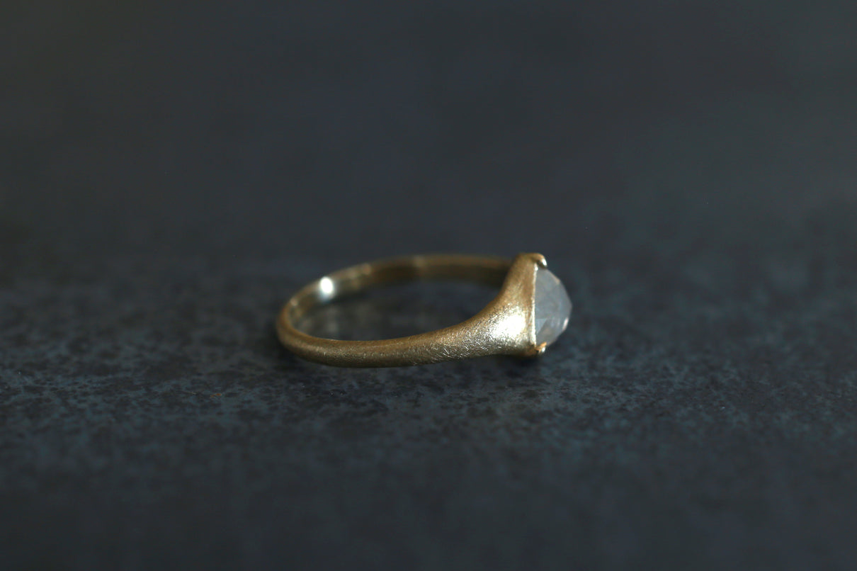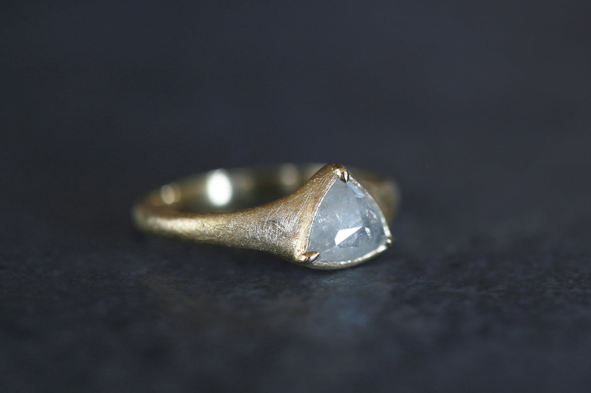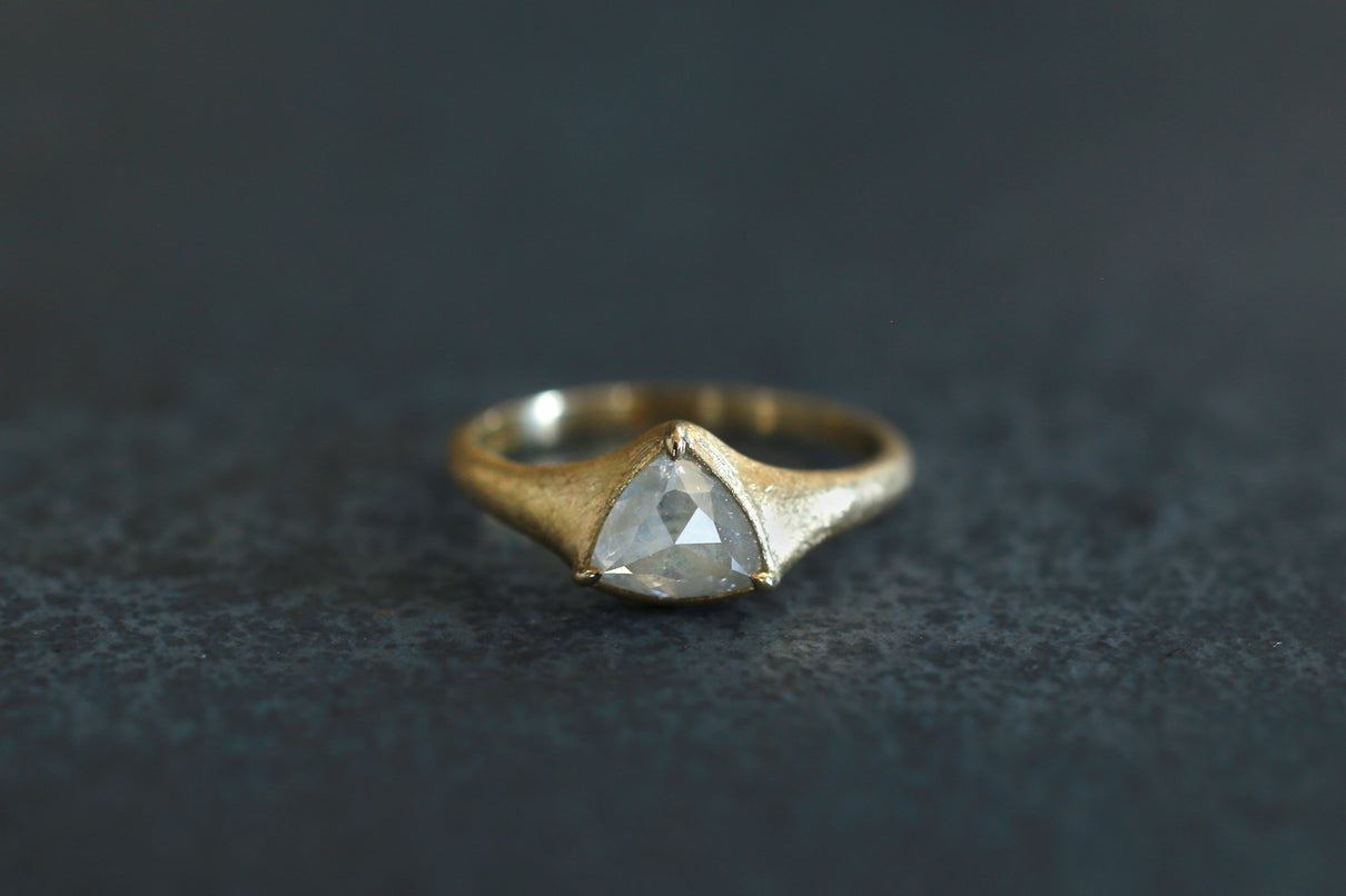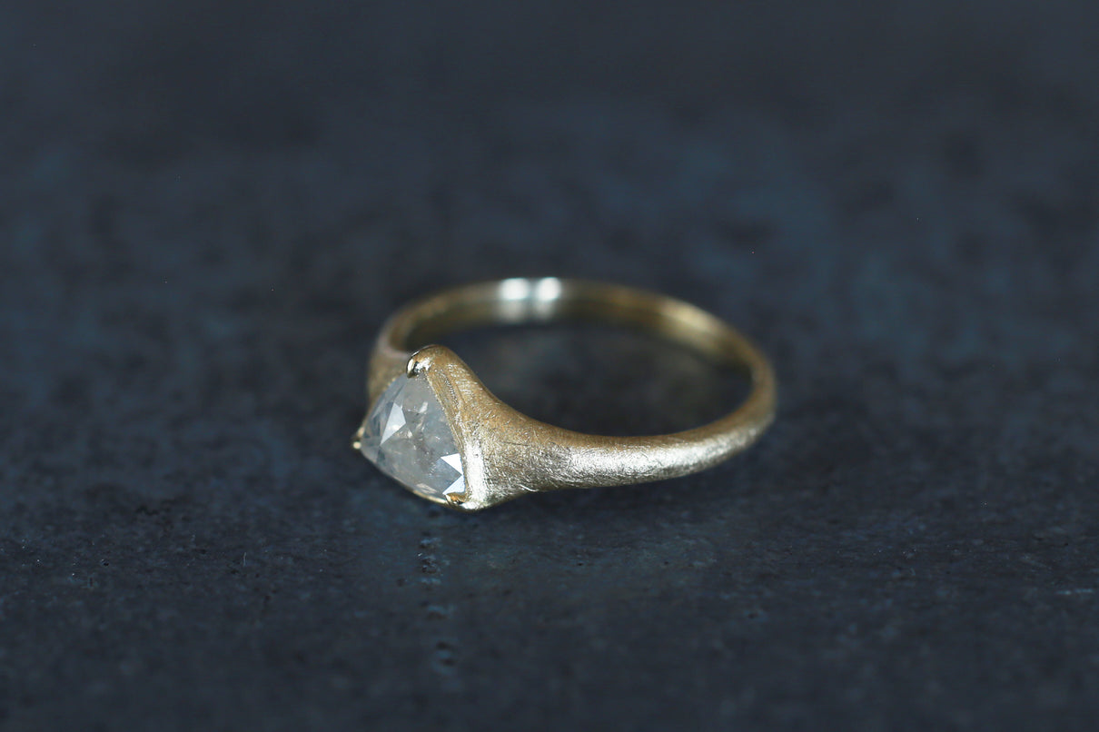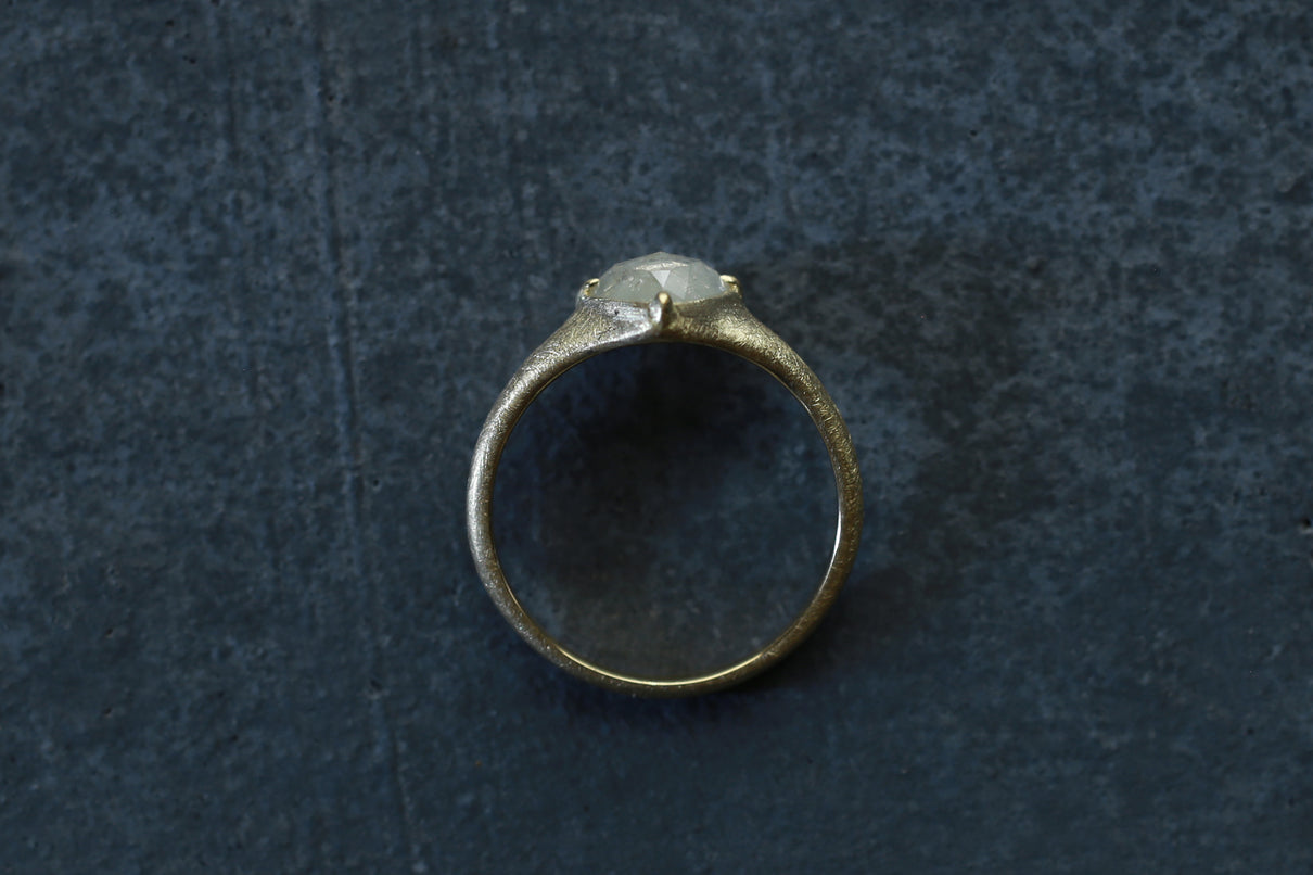 氷山のようなホワイトカラーが魅力的な、アイスカラーダイヤモンドで仕立てた1点もののリング。無色透明以外にも多種多様なカラーが存在するダイヤモンドの中でも、美しい乳白色は希少価値の高いものとされています。今回厳選したのはやや丸みのあるトライアングルのカットの中に、まるで霜が降りたかのように繊細な内包物がつくり出す、優しいオフホワイトカラーの景色が美しいピースです。K18ゴールドリング部分には手仕事の跡が感じられる柔らかなマットテクスチャーを施し、アイスカラーダイヤモンドの美しさを引き出しながら、優しい印象を備えた佇まいに仕上げました。ダイヤモンドならではの強く華やかな煌めきを讃えた、装いの主役となるような確かな存在感のある特別なリングです。