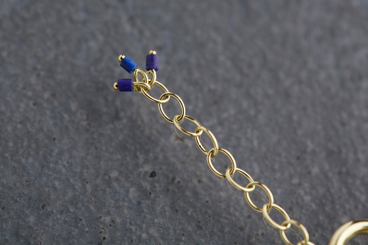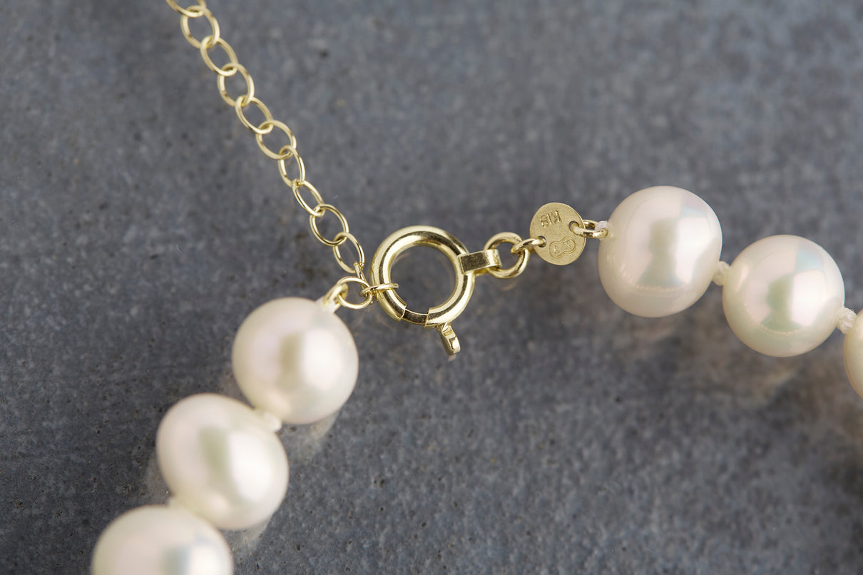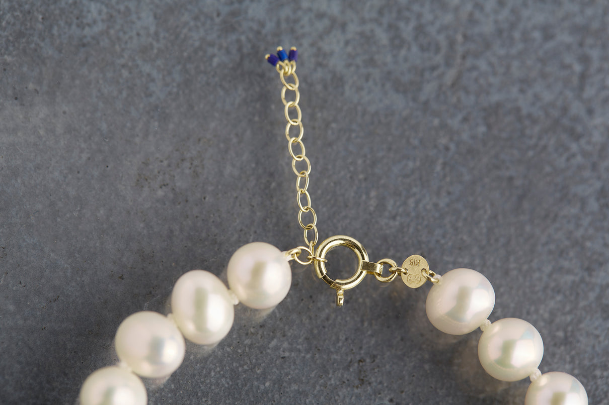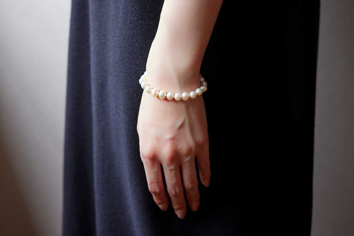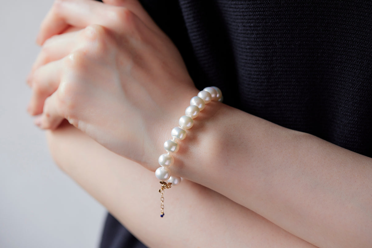上質な照りと穏やかな艶めきを讃えた、ホワイトカラーの美しい淡水パールで仕立てたブレスレット。パールとパールの間に1つずつ結び目を入れる手法で丁寧に組み上げたオールノット仕上げで、とてもしなやかな付け心地です。手元が明るく華やかな印象になり、フォーマルシーンには勿論、デイリーにも楽しめるアイテム。アジャスターチェーンの先端に揺れる3粒の微小なラピスラズリが、シンプルな中にさりげなく光るアクセントになっています。