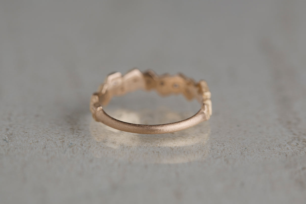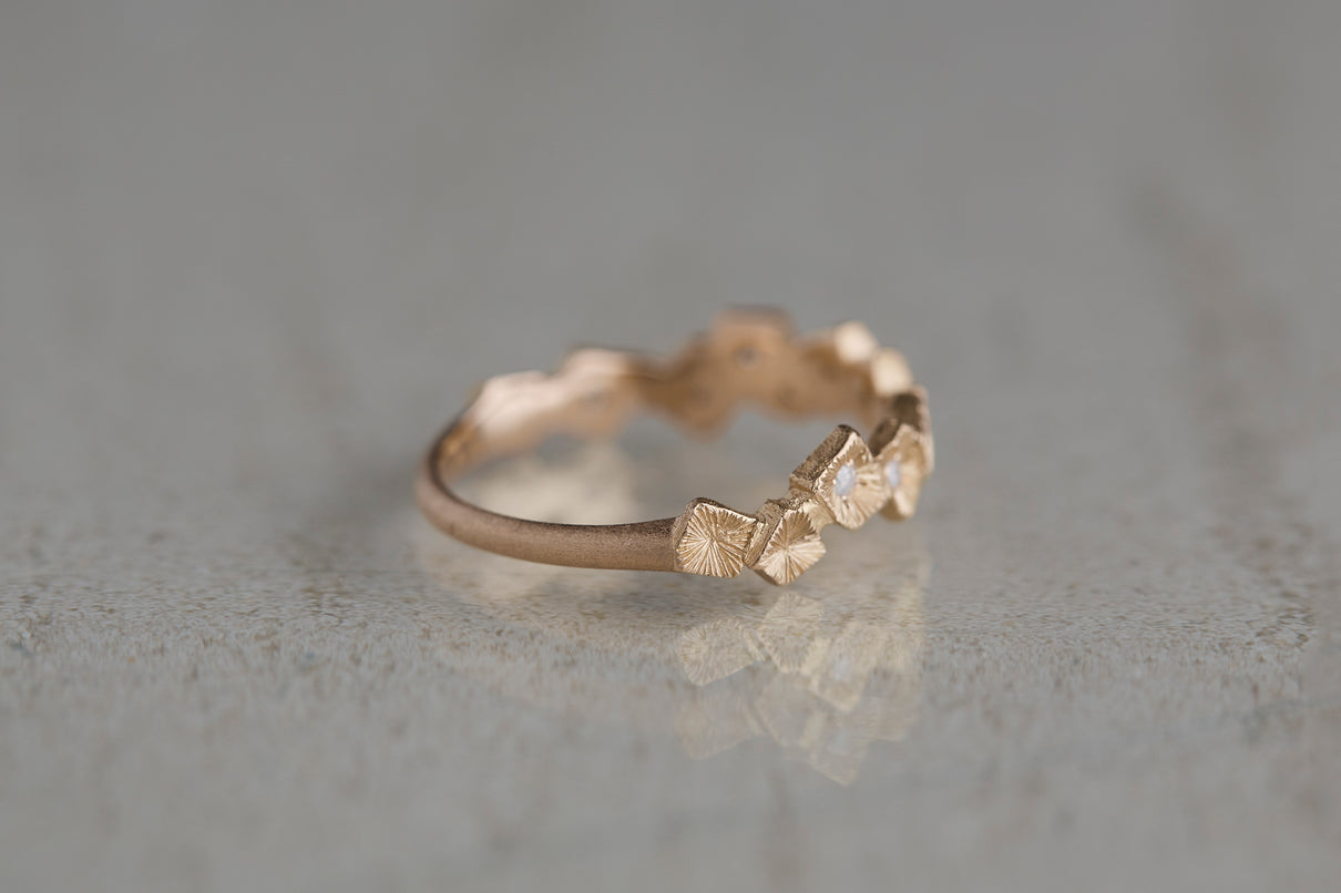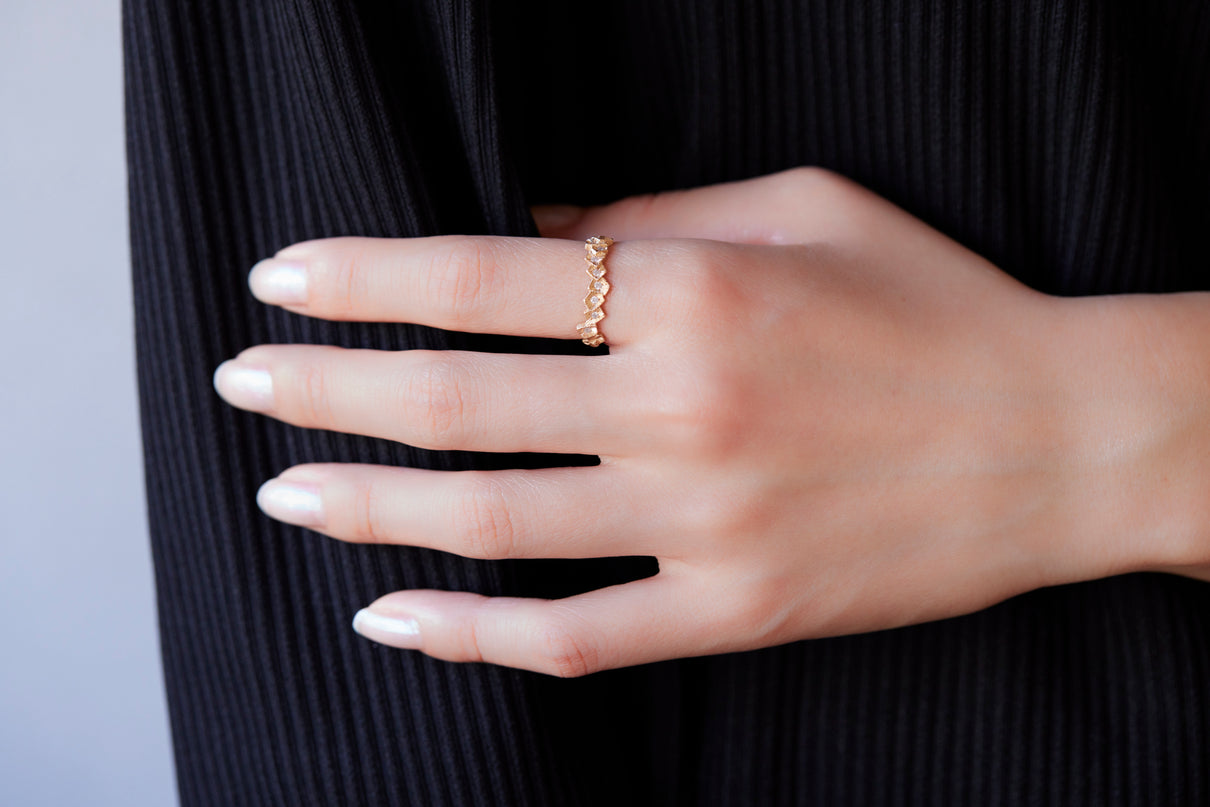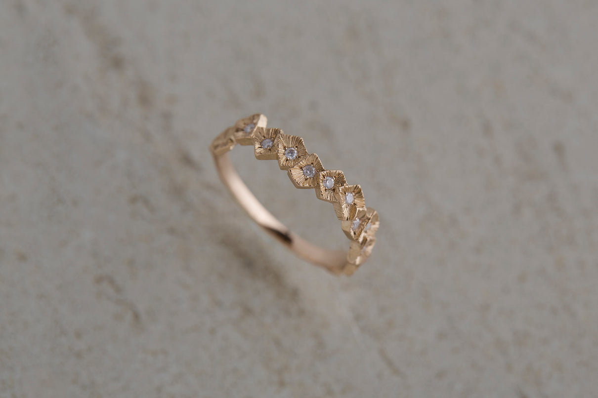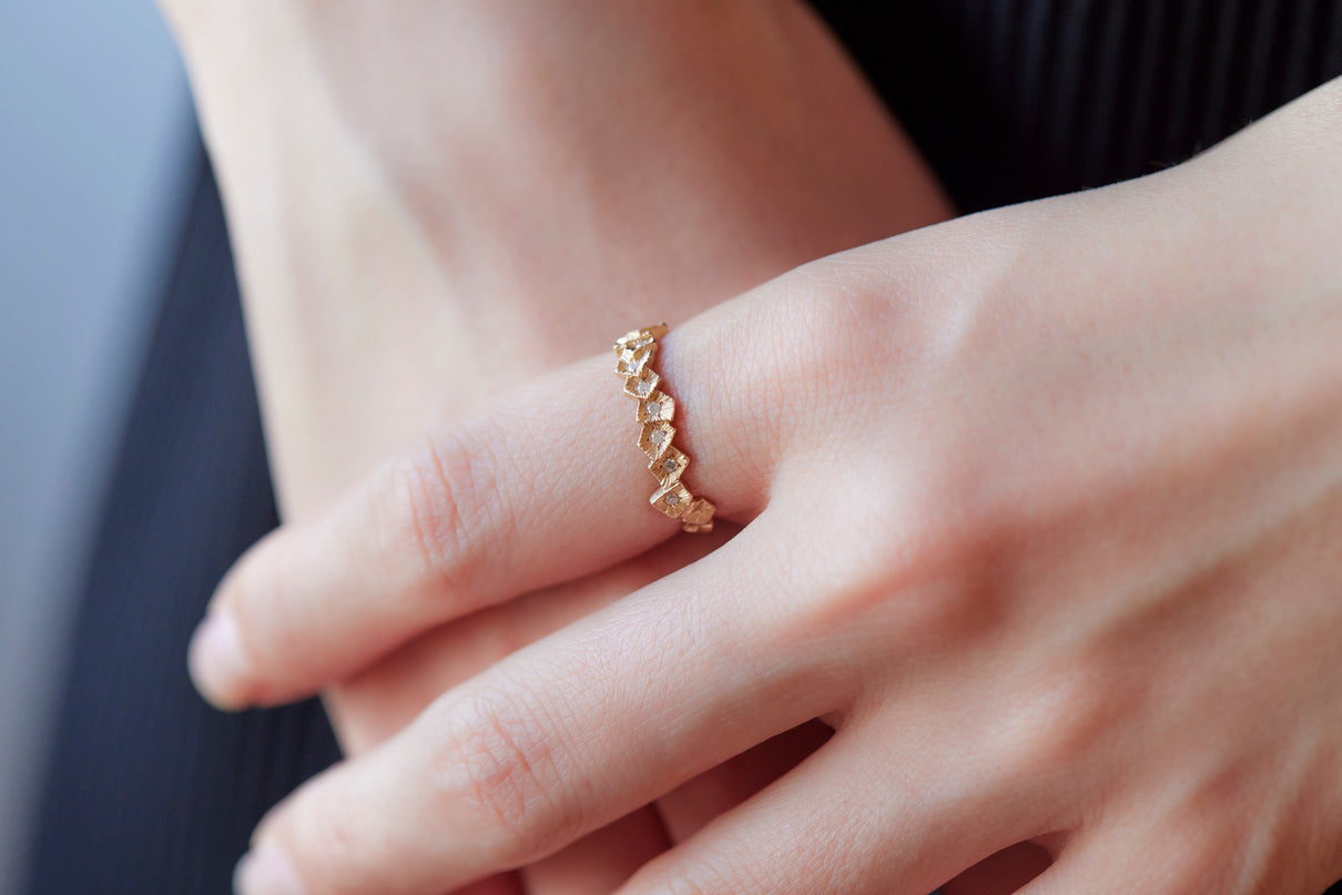 澄んで輝く結晶が、少しずつつくられてゆく様子をイメージしたAkirakaシリーズのリングに、希少なアイスカラーのメレダイヤモンドを留めたリミテッドアイテム。繊細に手彫りされたピンクゴールドの結晶の中央で、アイスカラーのダイヤモンドが氷のように静かに輝き、肌に優しく馴染みながら手元を上品に演出してくれます。細やかで複雑な表情と有機的な動きを楽しむことのできるリングです。