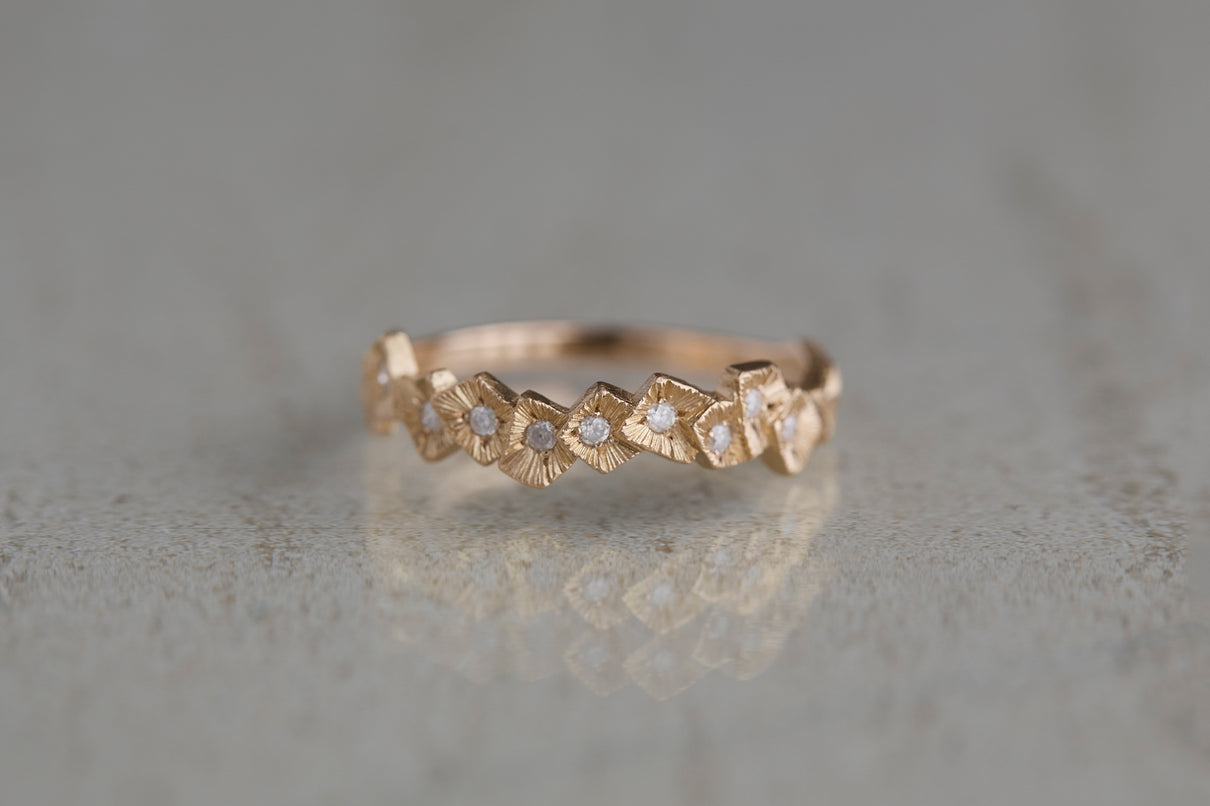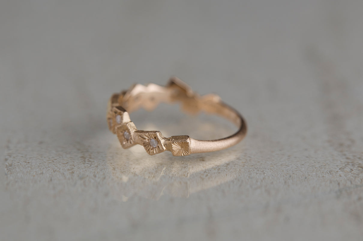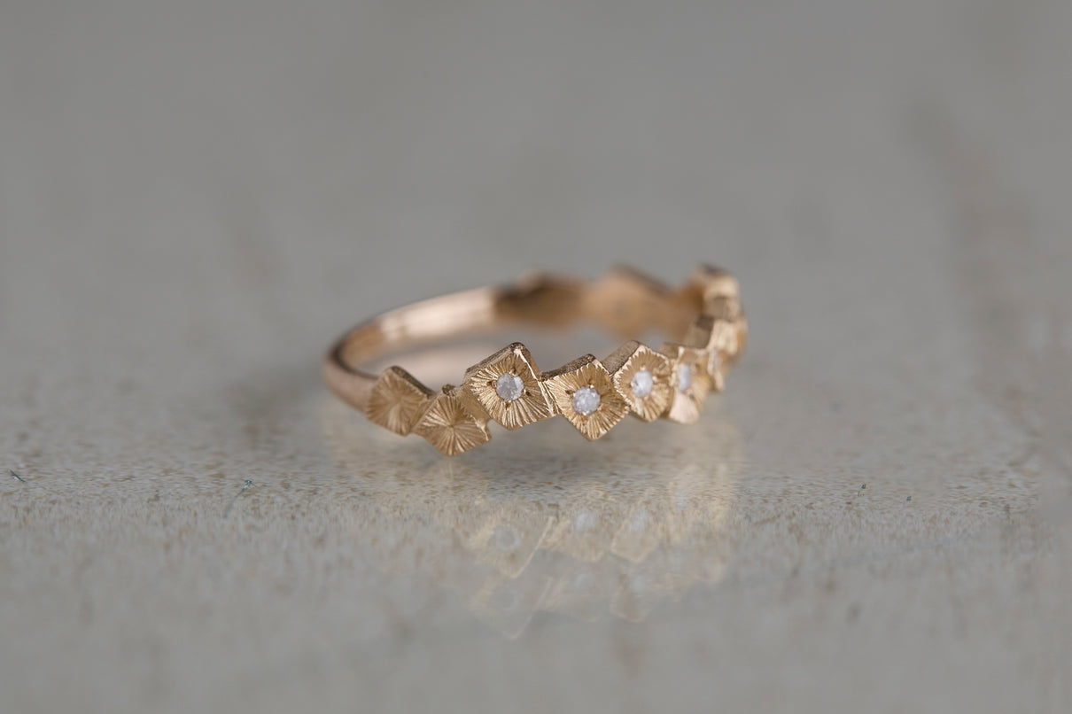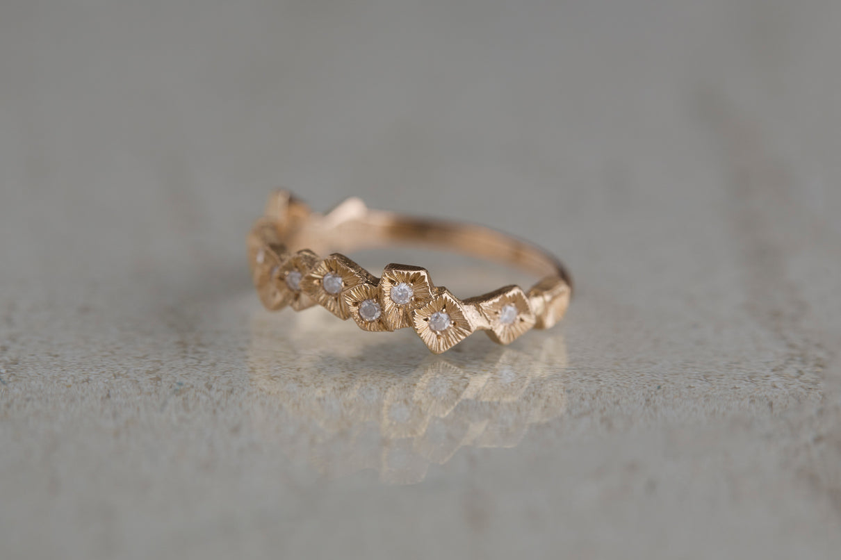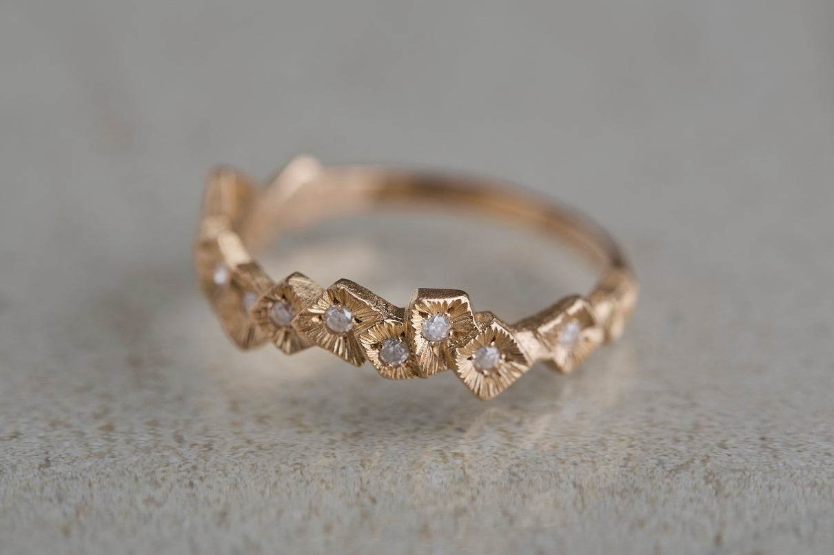 澄んで輝く結晶が、少しずつつくられてゆく様子をイメージしたAkirakaシリーズのリングに、希少なアイスカラーのメレダイヤモンドを留めたリミテッドアイテム。繊細に手彫りされたピンクゴールドの結晶の中央で、アイスカラーのダイヤモンドが氷のように静かに輝き、肌に優しく馴染みながら手元を上品に演出してくれます。細やかで複雑な表情と有機的な動きを楽しむことのできるリングです。