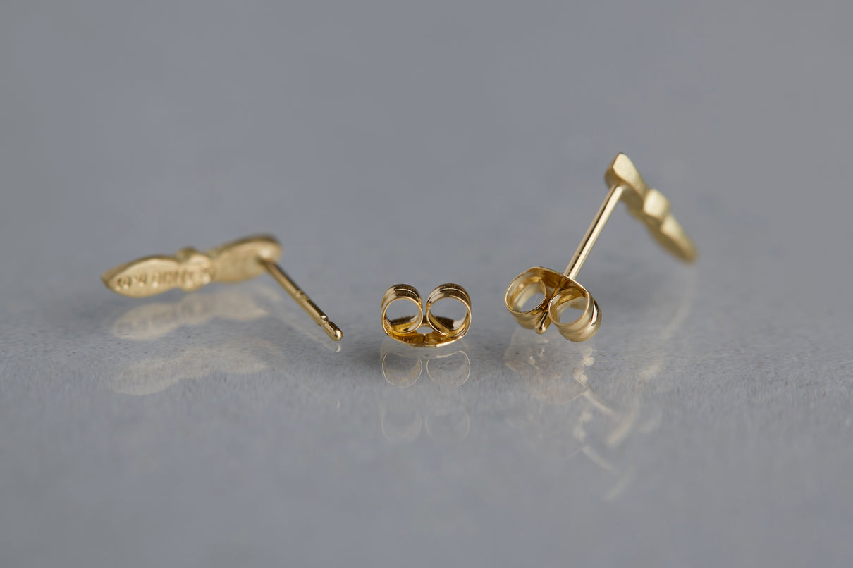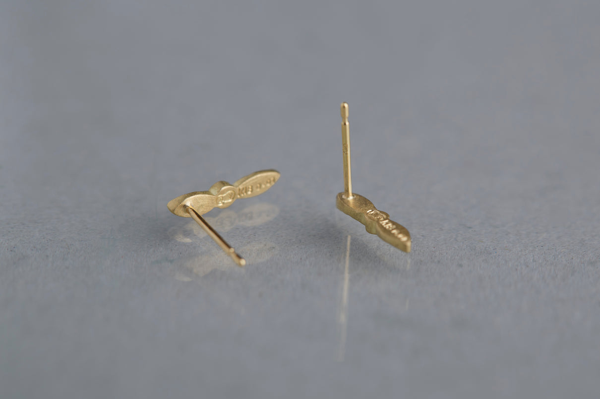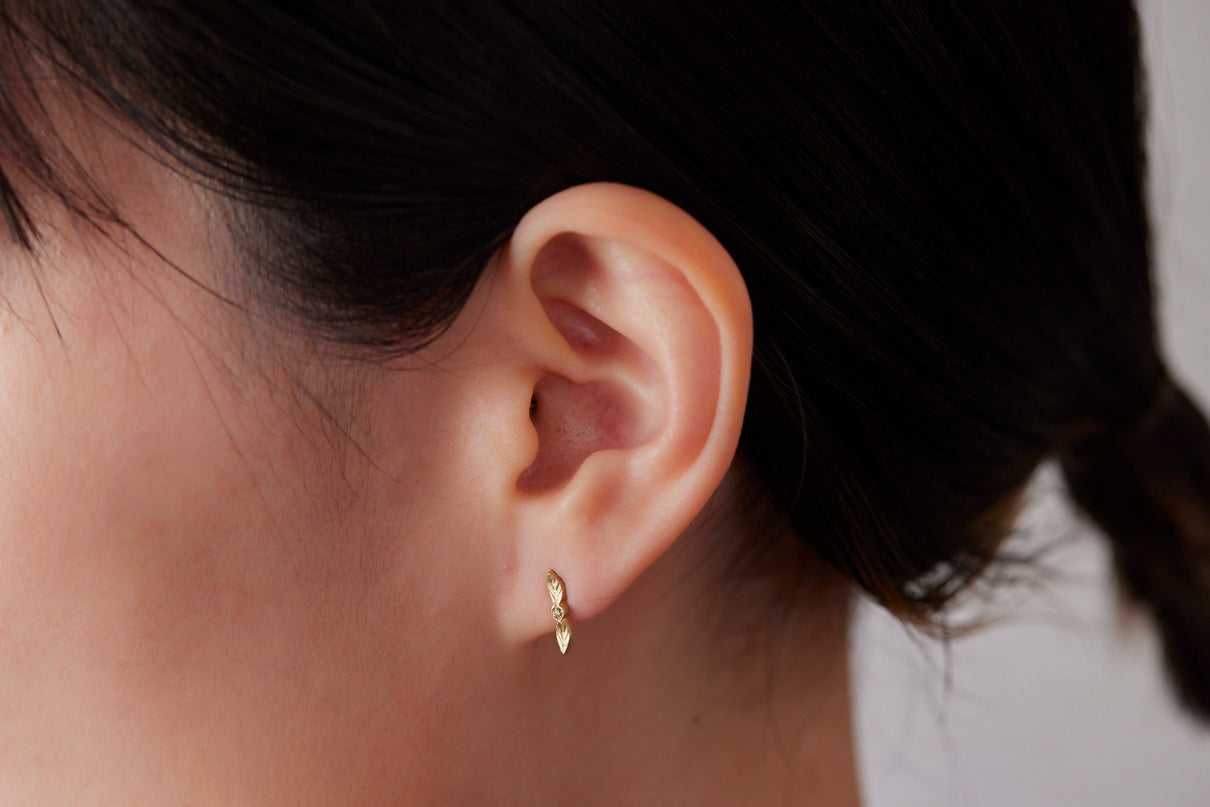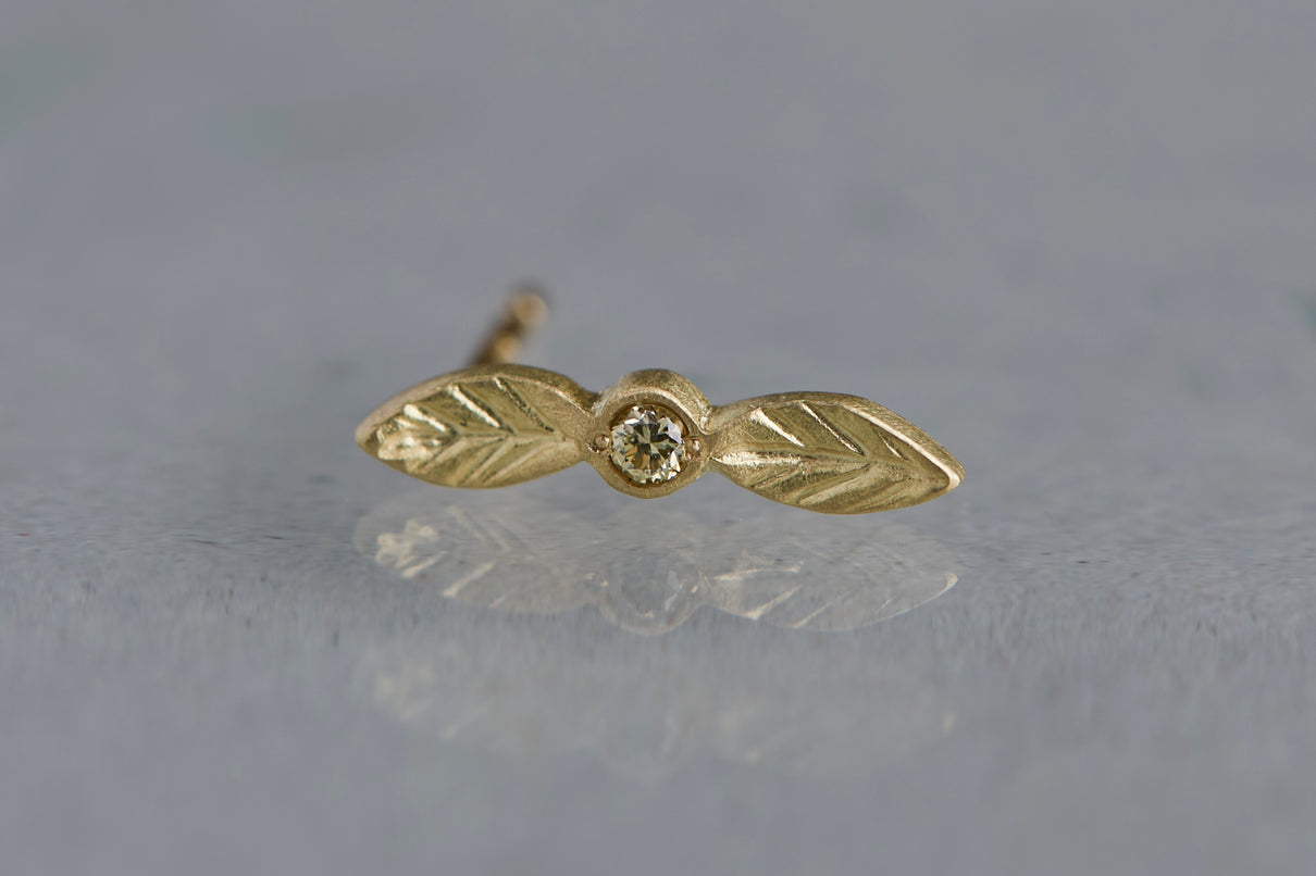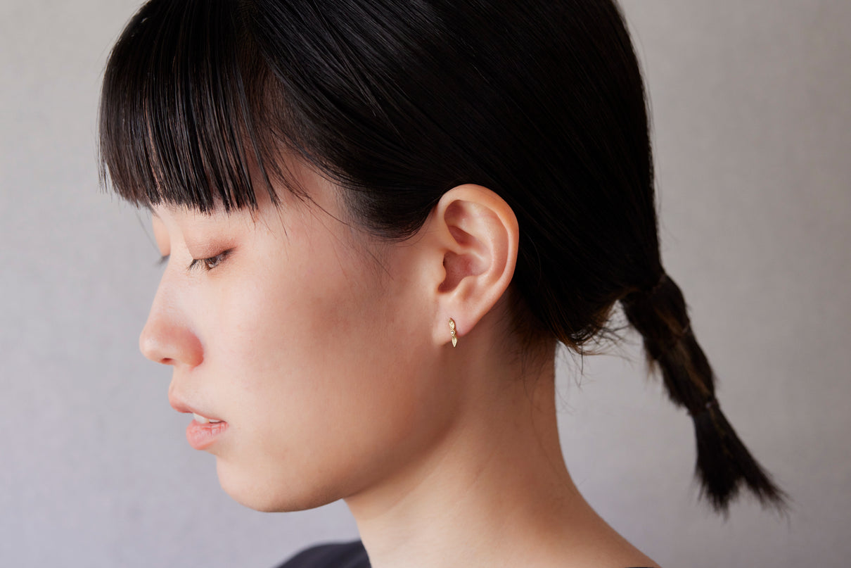 開花の季節を待つ小さな蕾をモチーフにした " Bloom " コレクションから誕生したスタッドピアス。瑞々しい蕾に見立てたダイヤモンドに寄り添う繊細な2枚の葉に宿る手彫りの表情は、小さい中にも生命の息吹を感じさせます。降り注ぐ太陽の光をその身に取り込んだかのようなオリーブカラーのダイヤモンドの輝きと、1枚1枚わずかに異なる表情を持つイエローゴールドの葉の艶めきが響き合い、耳元にささやかな華やぎをもたらします。小ぶりなモチーフで、耳からさりげなく溢れるよう儚げに留まります。