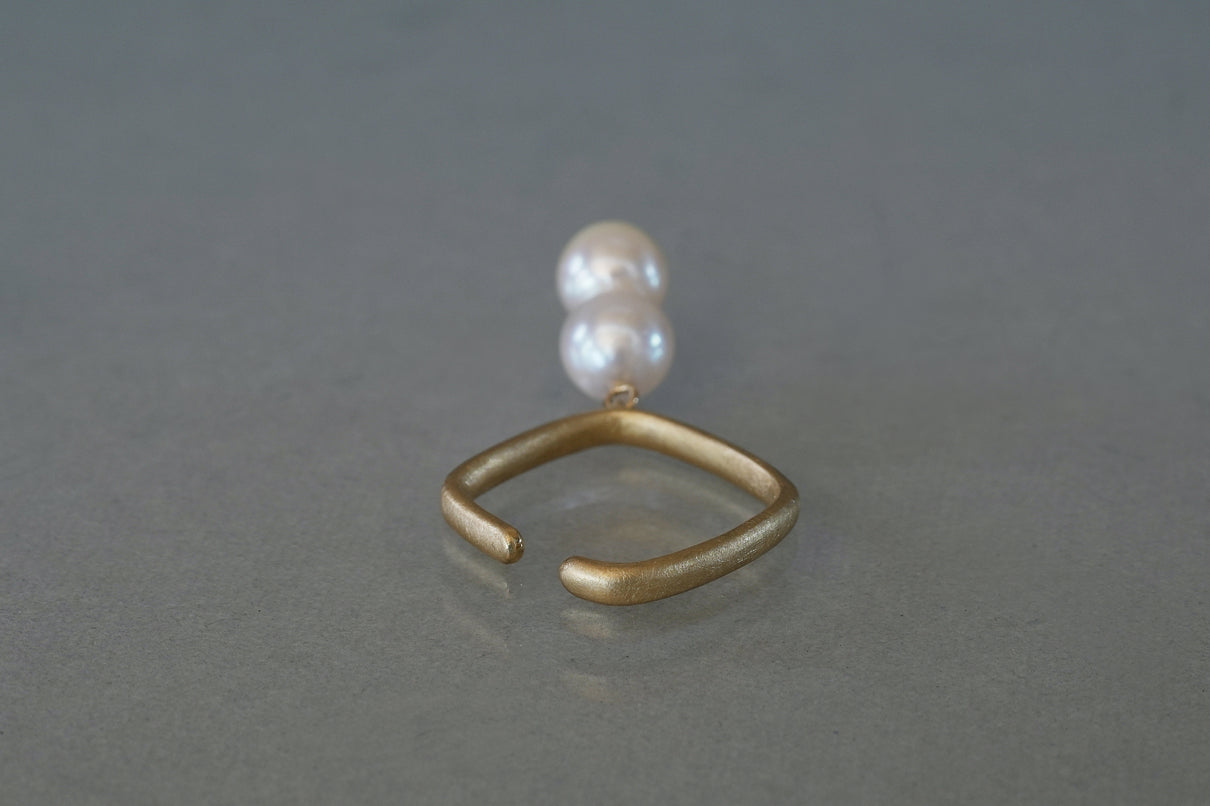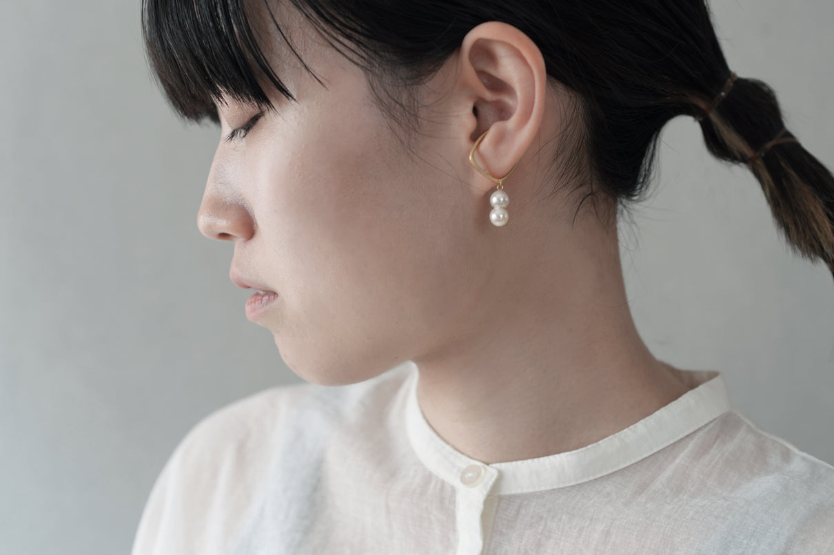 三味線の形から着想を得て作られたSyamiシリーズ。マットテクスチャーを施した柔らかなスクエア型のSyamiイヤーカフに、アコヤ貝がパールを生み出す過程で思いがけずに誕生した " 雪だるま "のような貴重な双子パールをあしらいました。周りの景色を映し出すほど強い照りで奥深く輝くアコヤパールは、動くたびにゆらゆらと心地よく揺れて耳元を華やかに演出します。1つでも十分に装いのアクセントになる、シンプルながらも個性が光るアイテムです。