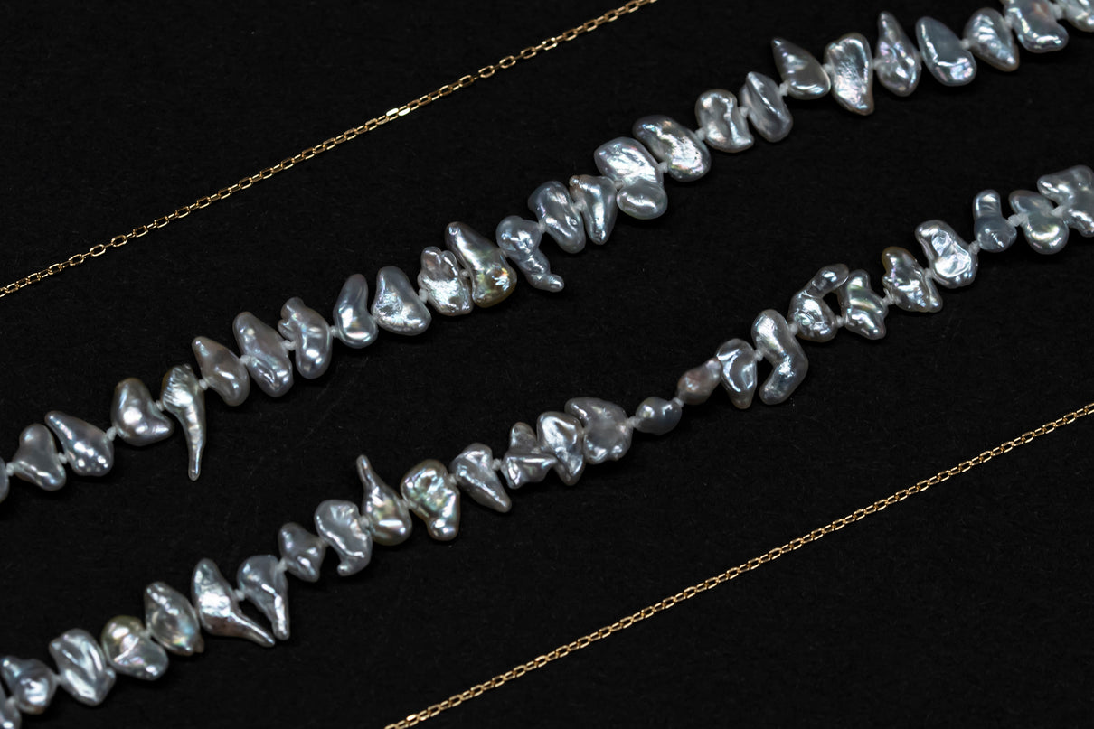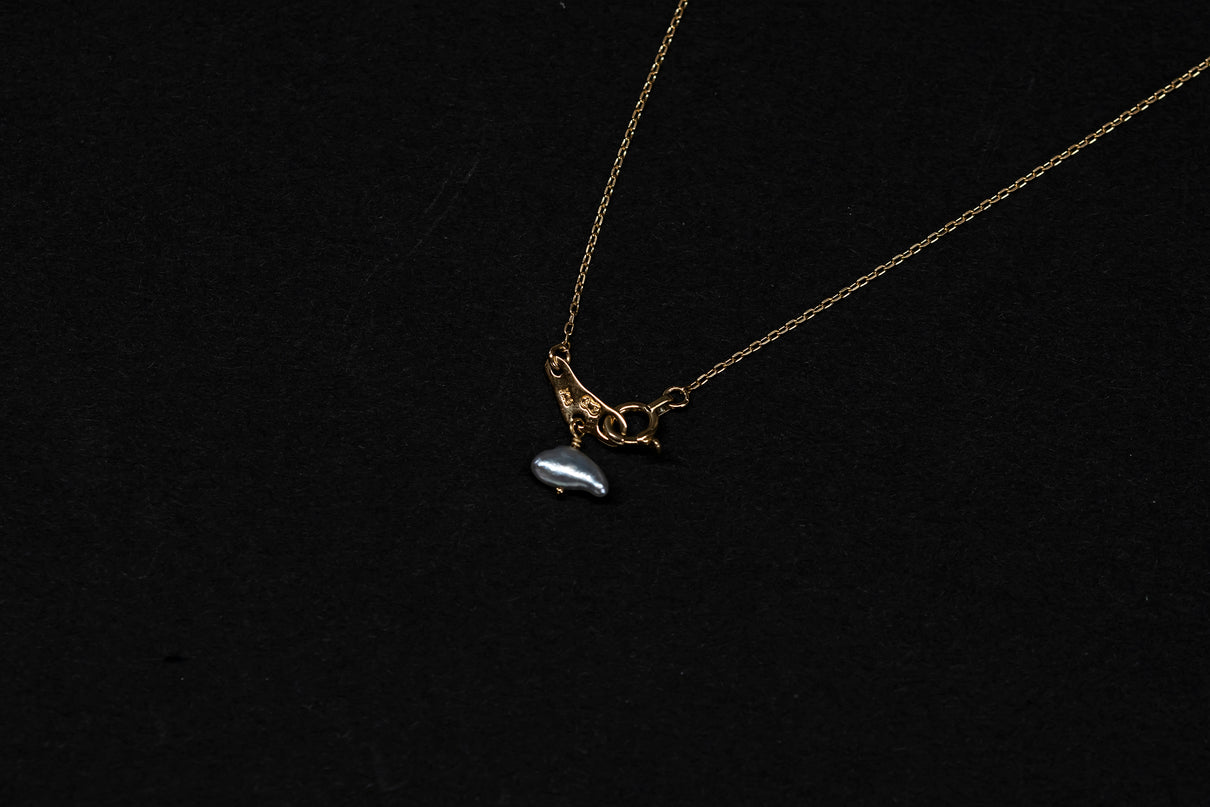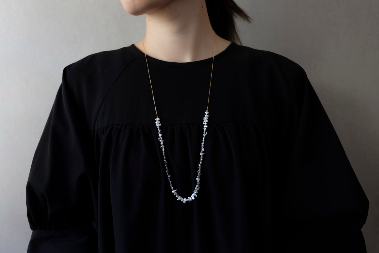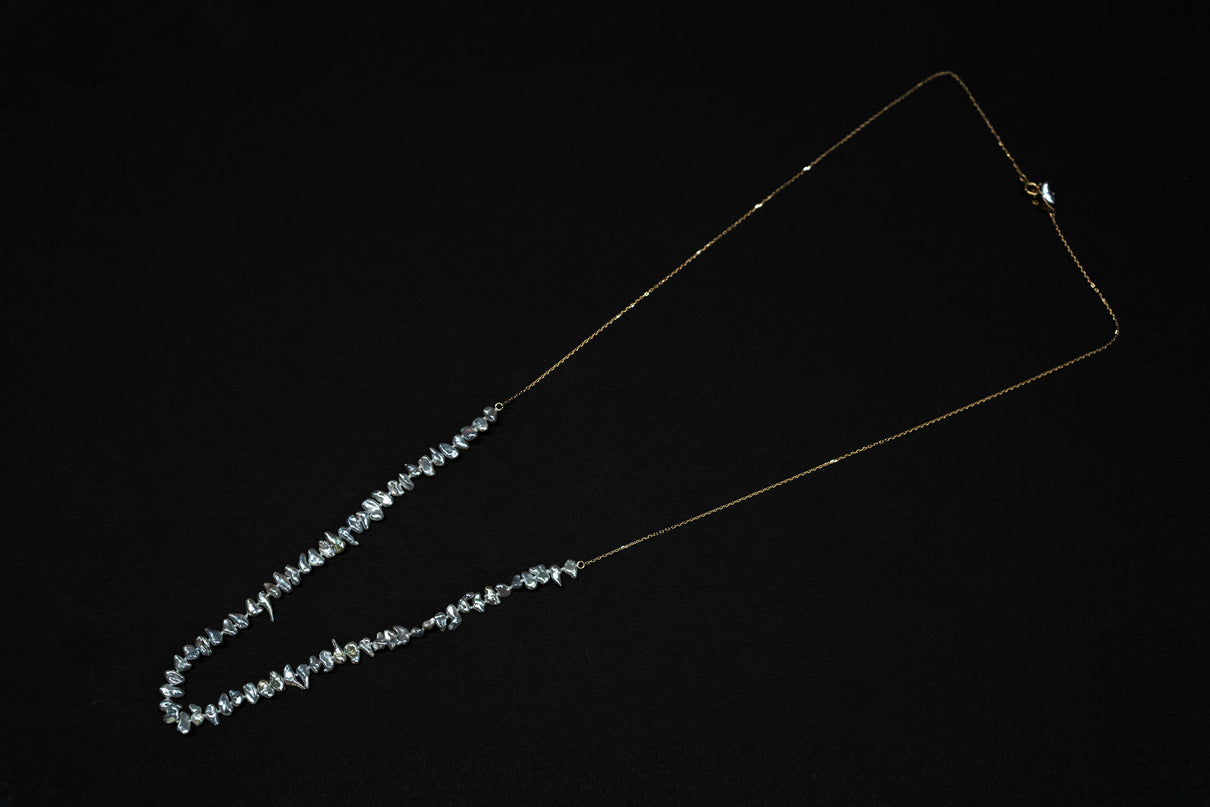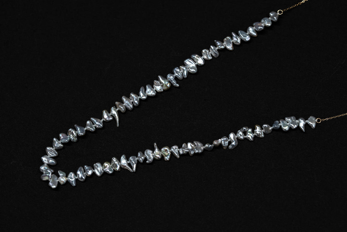 照りの美しいアコヤケシパールと艶めくゴールドのチェーンで軽やかに仕立てたロングネックレス。アコヤパールならではの強い照りを放つホワイトカラーのケシパールは、ひとつひとつがツノのような有機的な形をしており、繊細なフォルムの中にもユニークで個性が光ります。プレート部分にぶら下がり揺れる、ひと粒のケシパールも後ろ姿のアクセントに。ちょうど胸元にパールがくる長さで、シンプルな装いのコーディネートの主役にもおすすめのネックレスです。