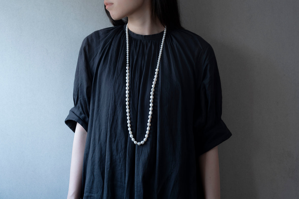柔らかなニュアンスを纏ったホワイトカラーの天然パールで仕立てたロングネックレス。粒が揃った控えめなサイズ感のパールと、有機的な表情が柔らかなリズムを生み出すパールが連なり胸元を印象的に飾ります。照りの美しいパールの間には、細かな筋彫りを施したK18ゴールドのスクエアパーツがアクセントとして輝き、お好みに合わせて色やパーツ位置のバランスを変えて身に付けることで、様々な装いでお愉しみ頂けるアイテムです。