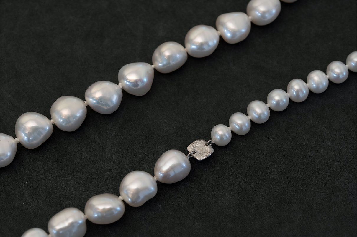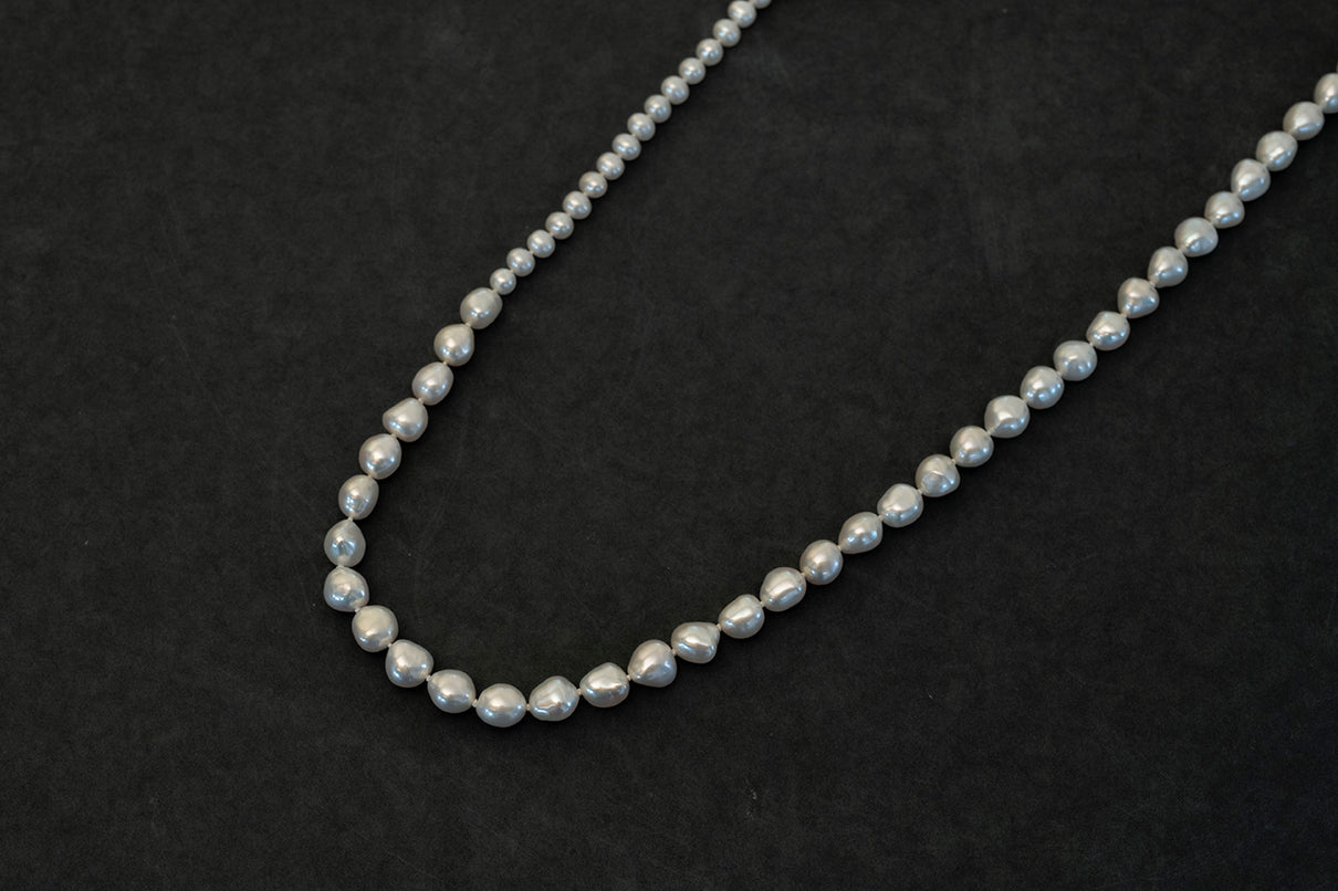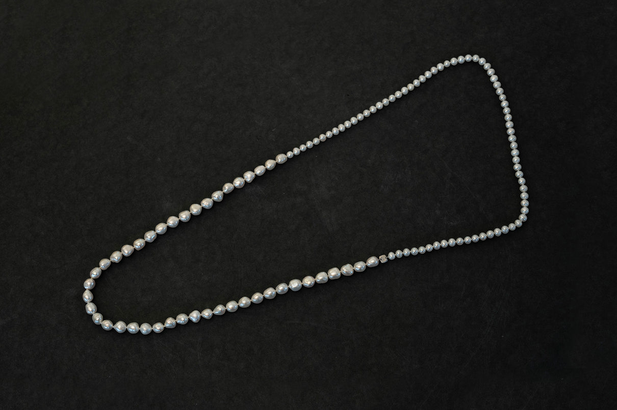 ※こちらはオールノットと呼ばれる、珠と珠の間に結び目を入れながらパール同士を繋いでゆく丁寧な糸通しの方法によって、ネックレスの動きが大変しなやかな仕上がりとなっています。