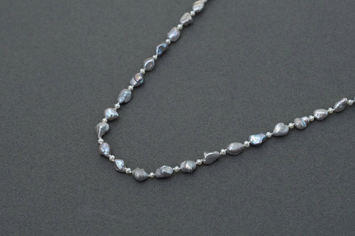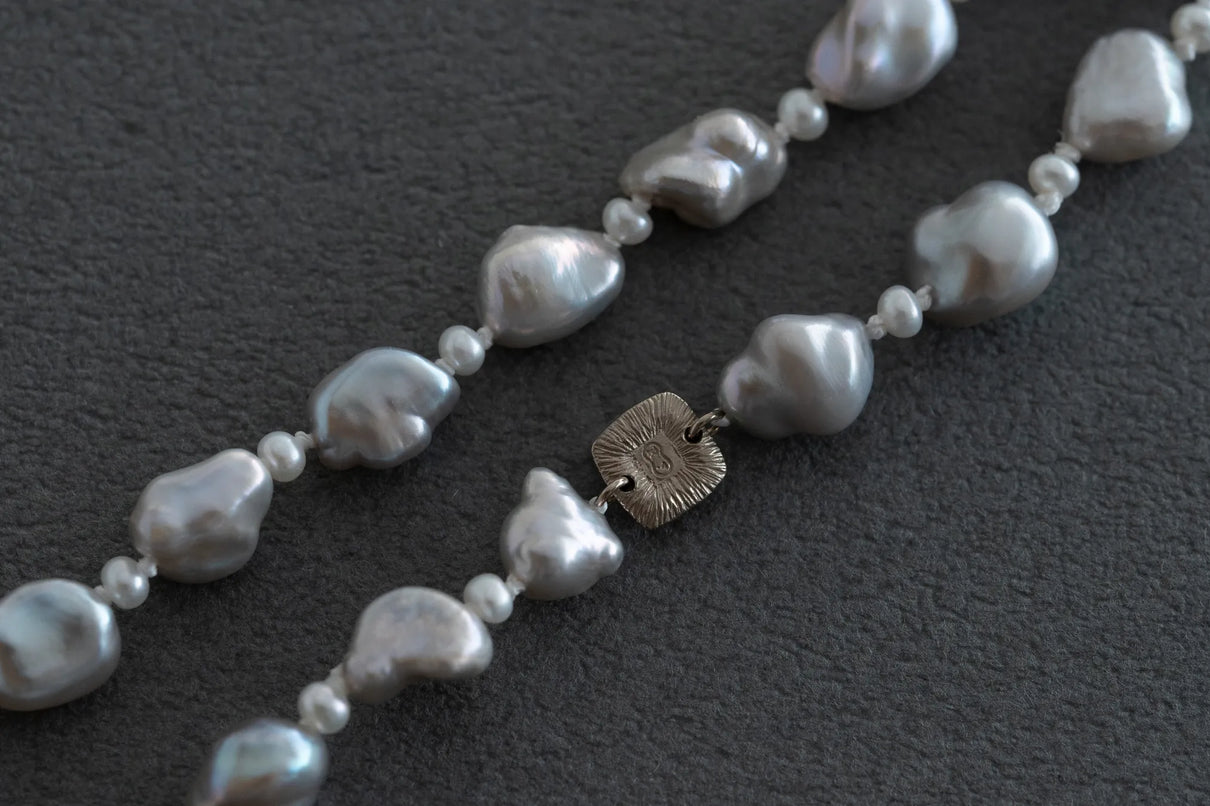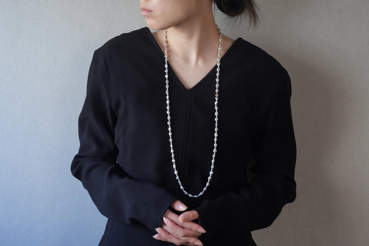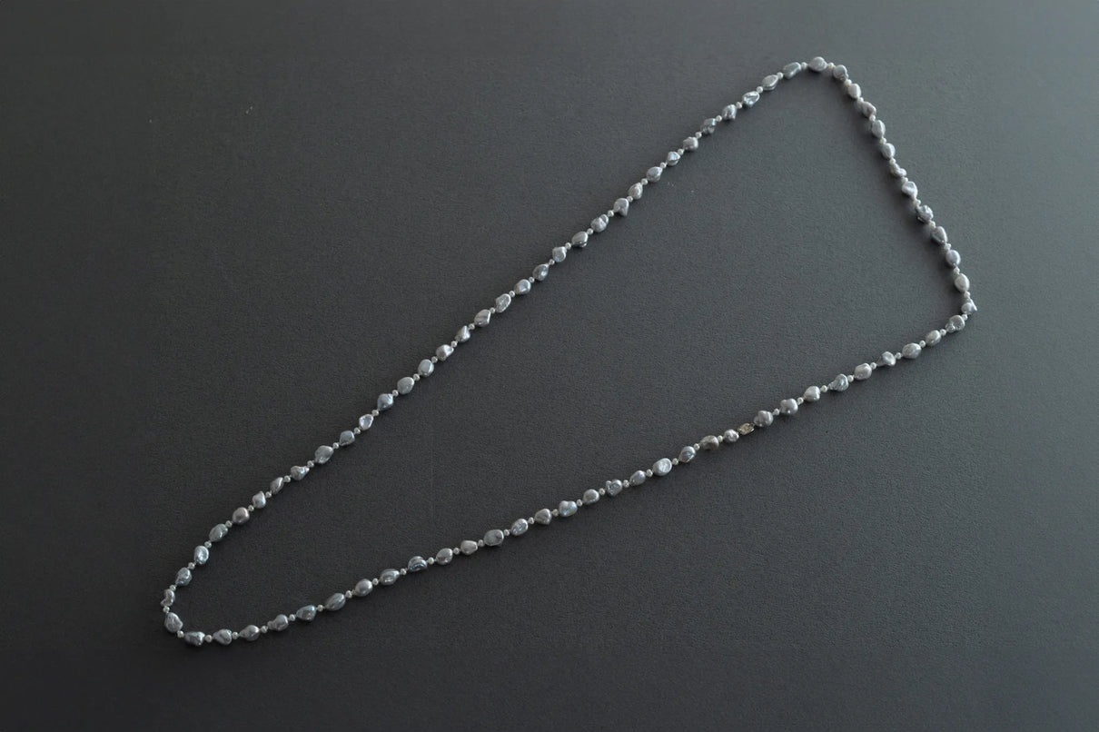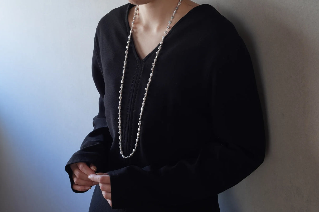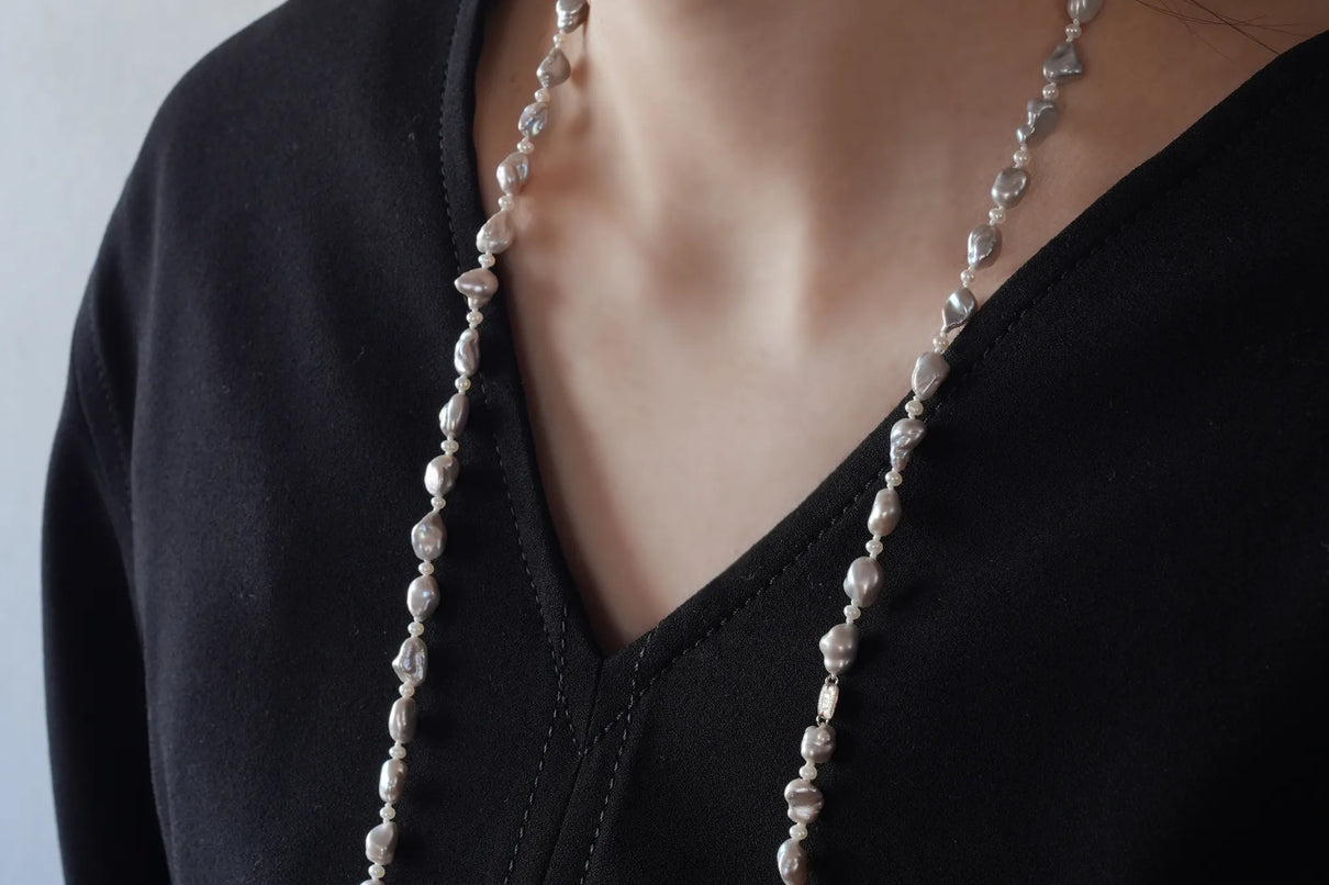 個性豊かな淡水パールで仕立てた約90cmのロングネックレス。一粒ひと粒表情が異なる照りの美しいグレーカラーのケシパールとホワイトカラーのベビーパールを交互にあしらうことで生まれる心地よいリズムが、ネックレス全体に軽やかな流れをもたらし、ひとつとして同じ形の存在しない自然が育む天然パールならではの自由な姿をお愉しみいただけます。照りの美しいパールの間に留めた、細かな筋彫りを施したK18ホワイトゴールドのスクエアパーツがアクセントとなっており、お好みに合わせてパーツの位置のバランスを変えて身に着けることができます。