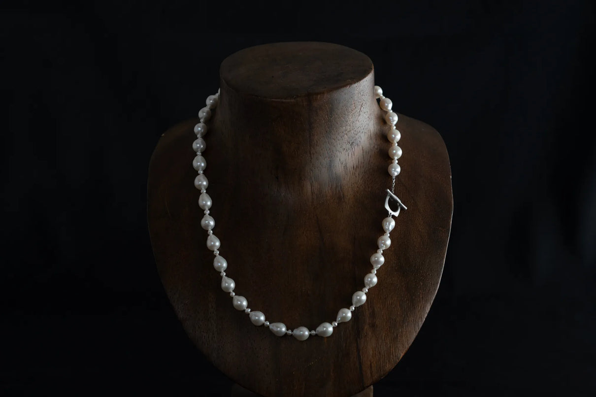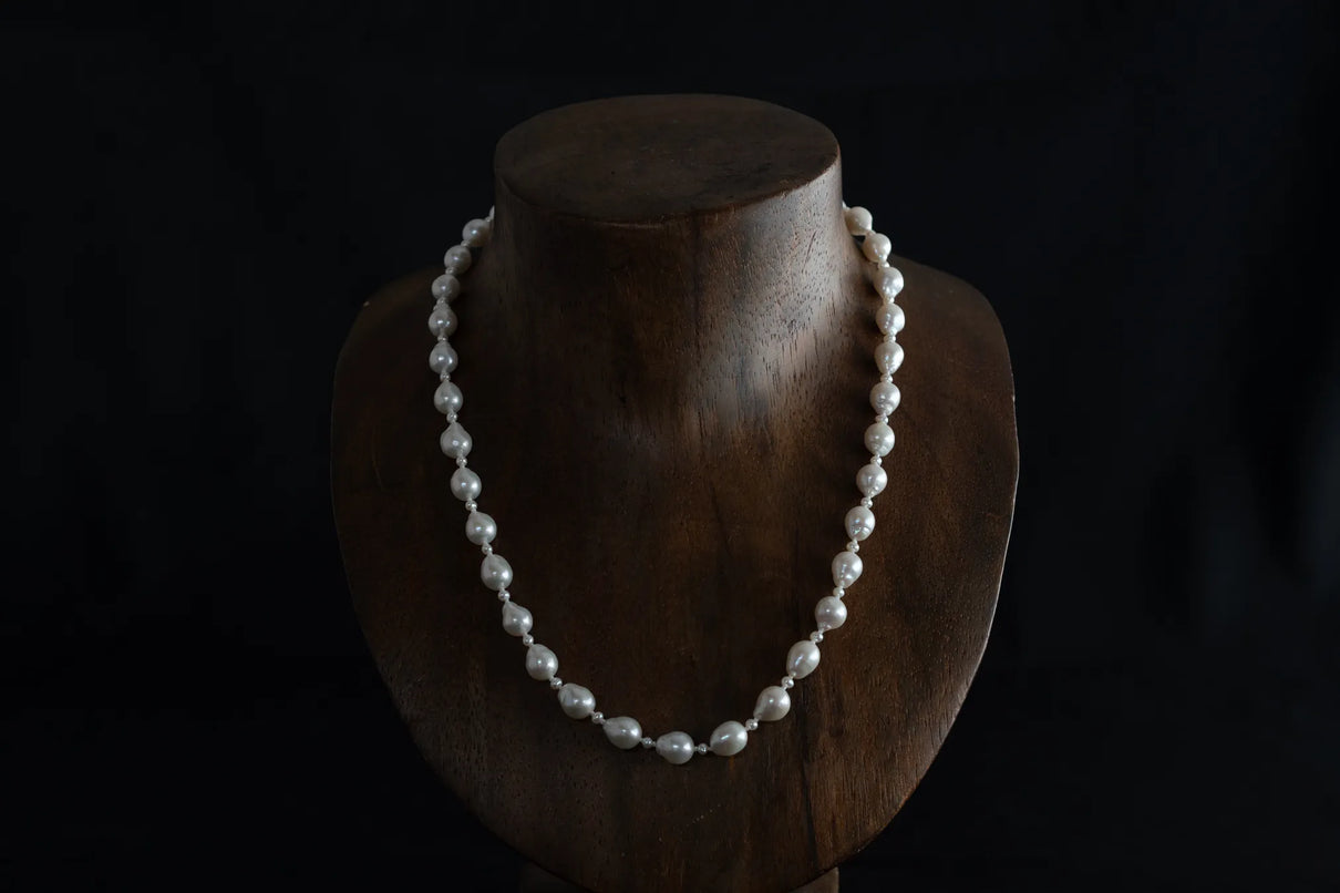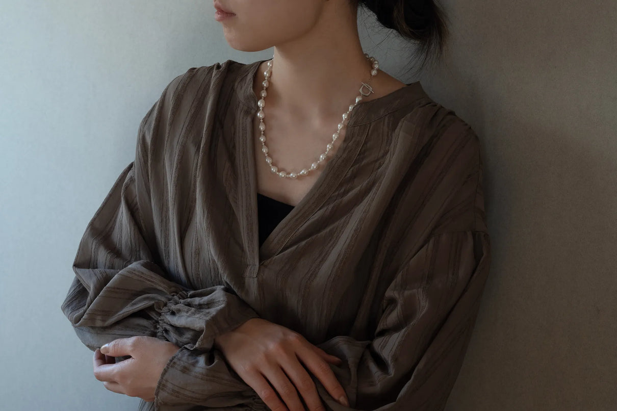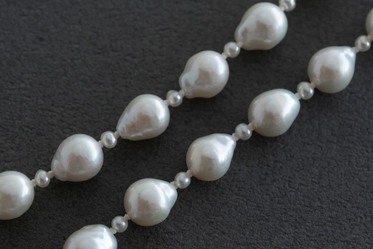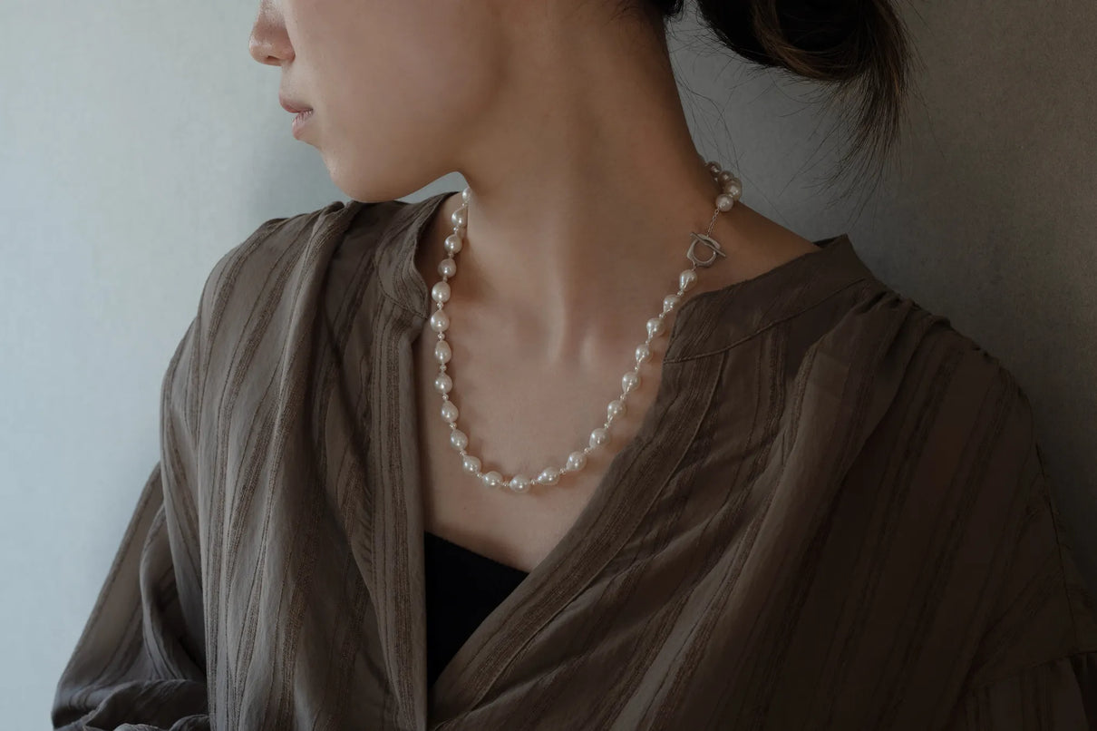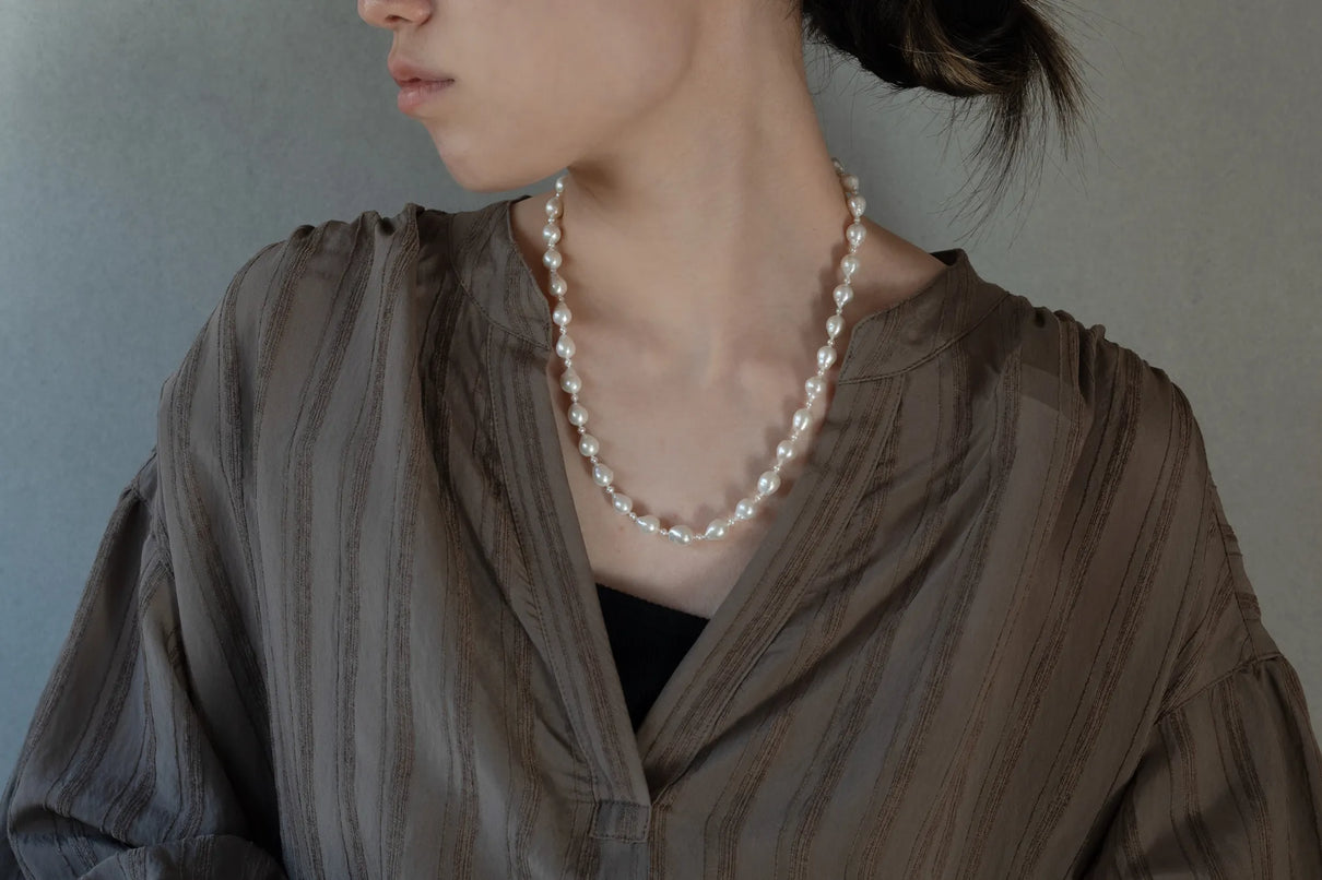 大小異なる大きさの淡水パールを交互に配したネックレス。自然が生み出す自由な姿を愉しめるドロップ型のパールと一つひとつわずかに異なる輪郭の小粒パールがリズミカルに連なり、有機的で豊かな表情を見せます。やわらかな曲線を描くように胸元にゆったりと寄り添い、照りの美しい上質なパールが品良く装いを引き立てるアイテム。オリジナルのシルバーマンテルがさりげなくアクセントとなり、お好みに合わせてパーツの位置のバランスを変えて身に着けることができます。合わせやすいセミロングタイプは装いを選ばず、フォーマルシーンにも日常使いにも装いに合わせやすい、コーディネートに重宝するアイテムです。