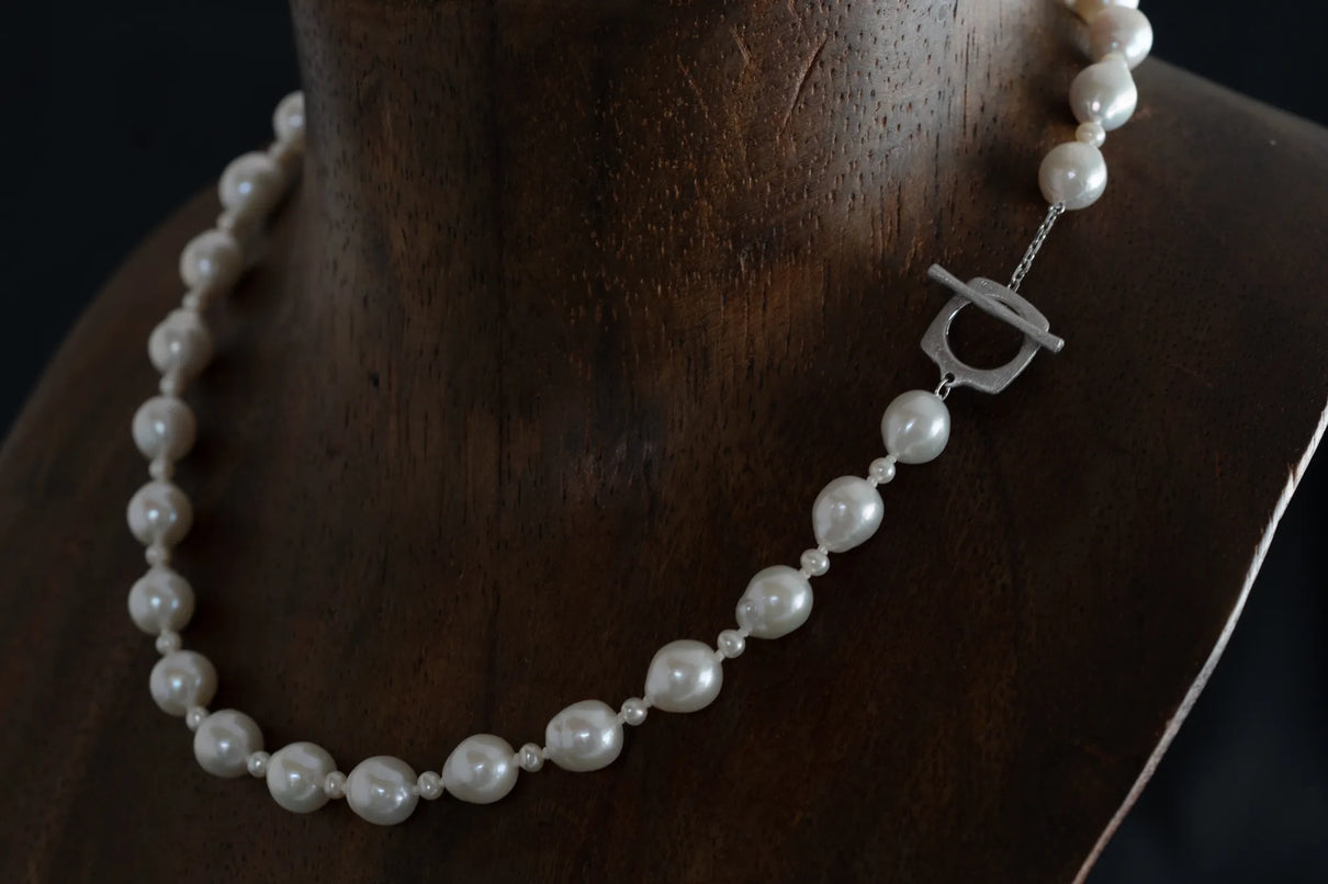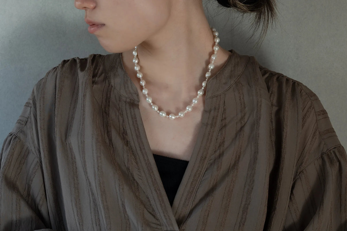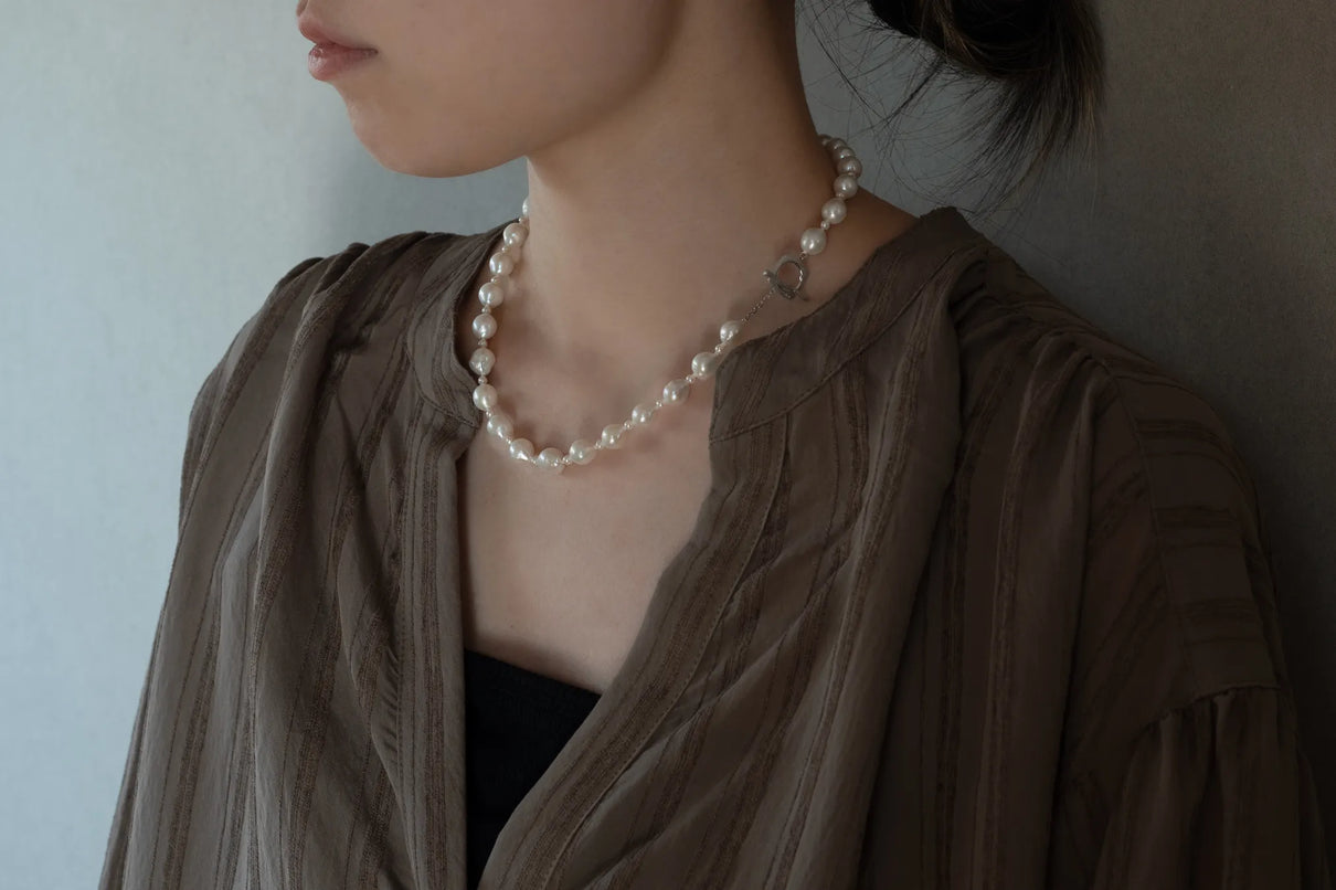 大小異なる大きさの淡水パールを交互に配したネックレス。ひとつひとつ僅かに異なるフォルムのパールがリズミカルに連なり、有機的で豊かな表情を見せます。やわらかな曲線を描くように胸元にゆったりと寄り添い、照りの美しい上質なパールが品良く装いを引き立てるアイテム。オリジナルのシルバーマンテルがさりげなくアクセントとなり、お好みに合わせてパーツの位置のバランスを変えて身に着けることができます。フォーマルシーンにも日常使いにも装いに合わせやすい、コーディネートに重宝するアイテムです。