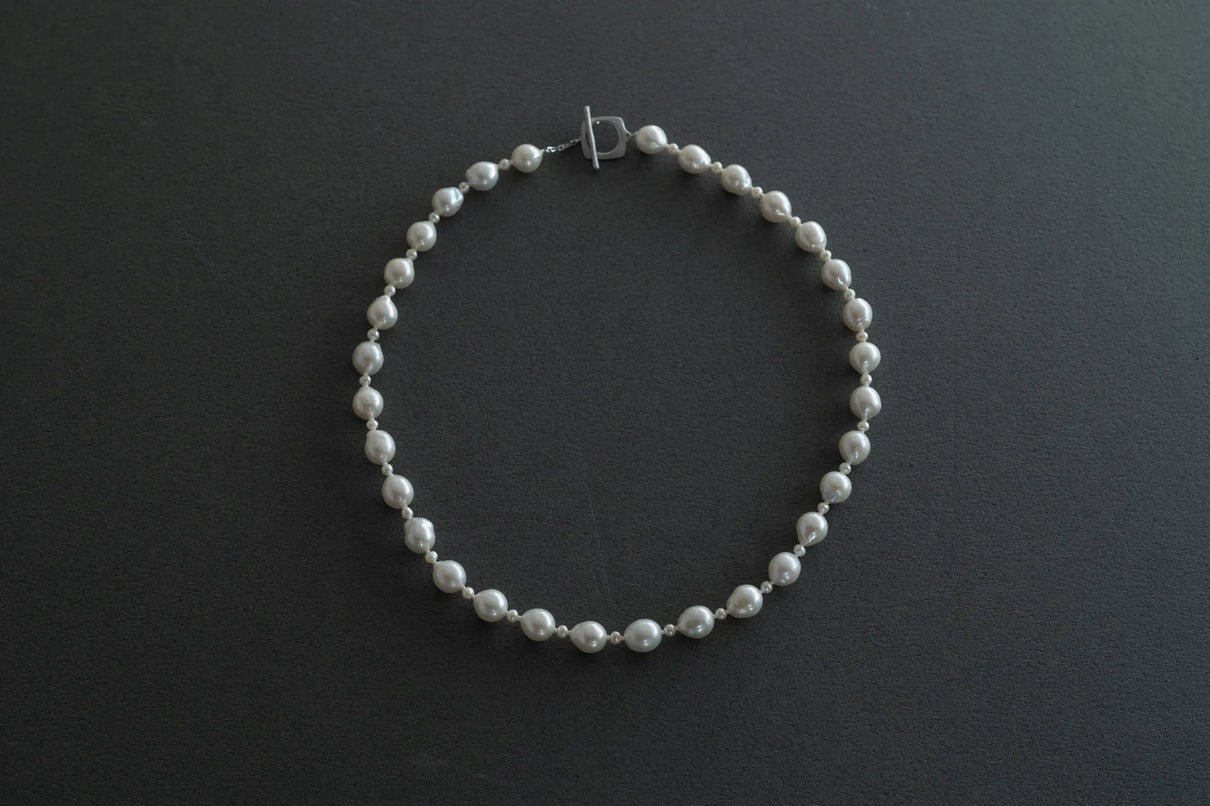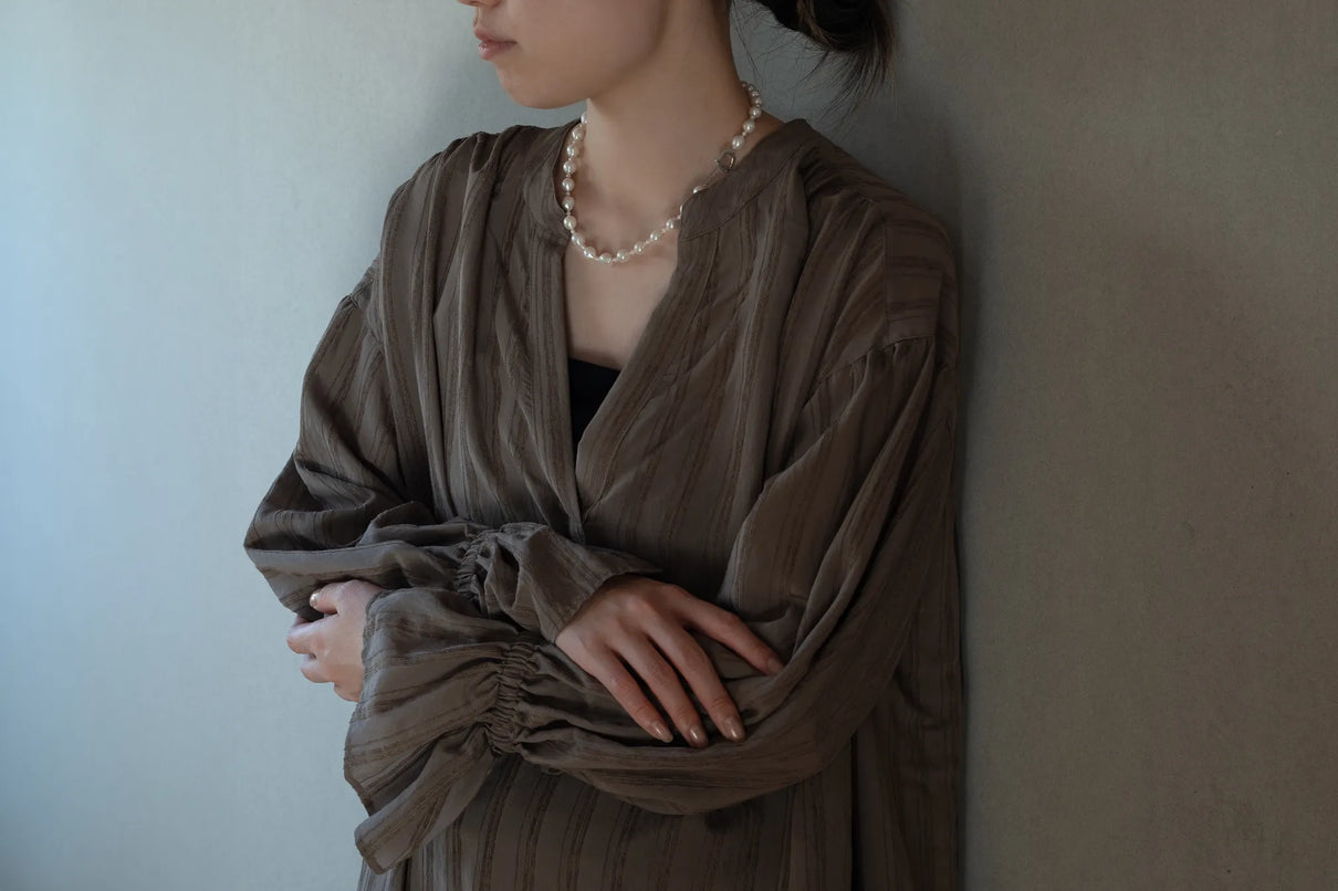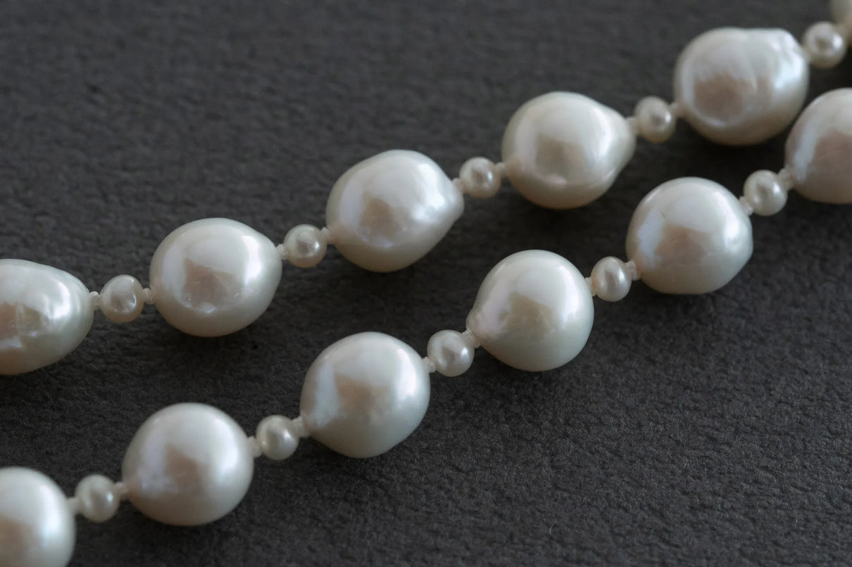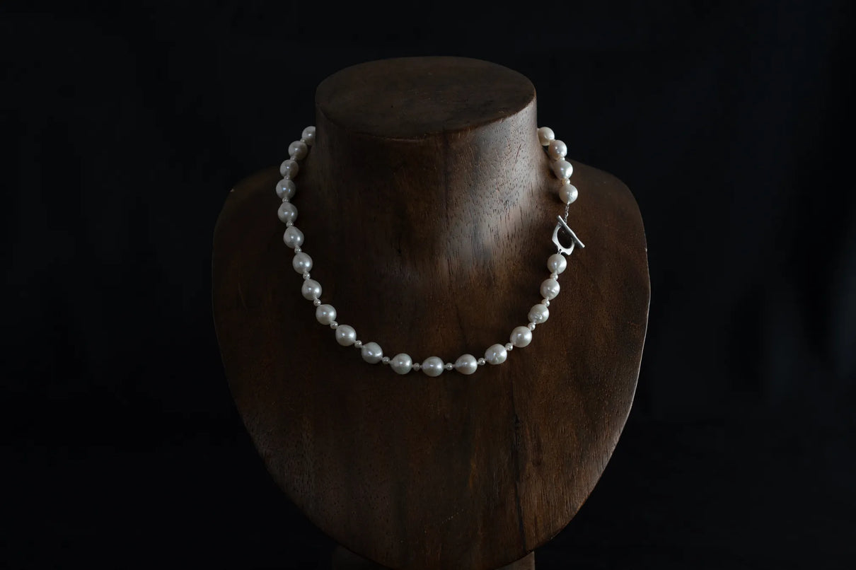 大小異なる大きさの淡水パールを交互に配したネックレス。ひとつひとつ僅かに異なるフォルムのパールがリズミカルに連なり、有機的で豊かな表情を見せます。やわらかな曲線を描くように胸元にゆったりと寄り添い、照りの美しい上質なパールが品良く装いを引き立てるアイテム。オリジナルのシルバーマンテルがさりげなくアクセントとなり、お好みに合わせてパーツの位置のバランスを変えて身に着けることができます。フォーマルシーンにも日常使いにも装いに合わせやすい、コーディネートに重宝するアイテムです。