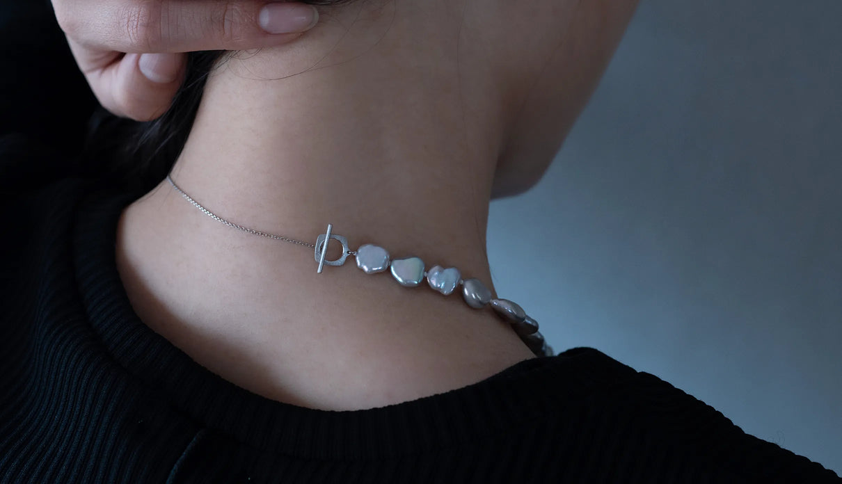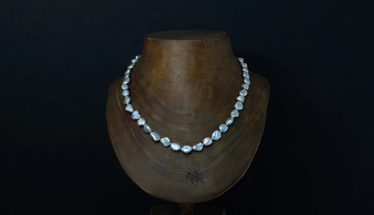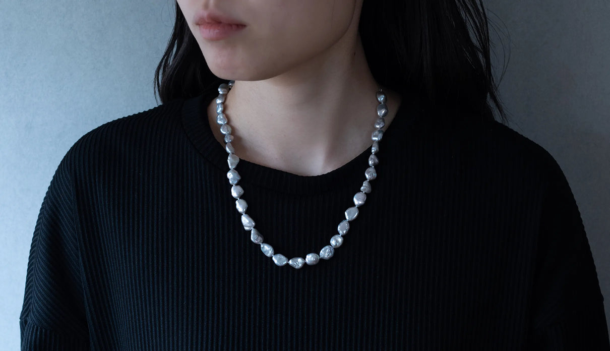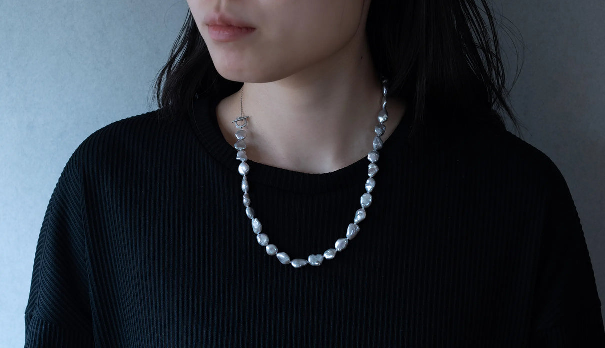 個性豊かな淡水パールで仕立てたネックレス。一粒ひと粒表情が異なる照りの美しいパールは、自然が育む天然パールならではの有機的なコイン型のフォルム。確かな存在感を放つパールが首元で華やぎ、顔まわりの印象を品良く明るくしてくれます。プラチナで仕立てたオリジナルのマンテルパーツが全体のアクセントとなり、お好みに合わせてパーツのバランス位置を変えながら、様々なシーンで日々お楽しみいただけるアイテム。ボリュームと存在感のあるパールですが、見た目以上に軽い着け心地を感じていただけます。
