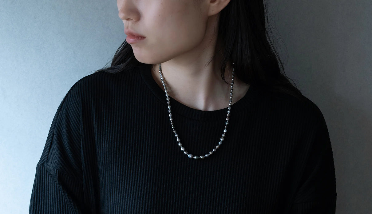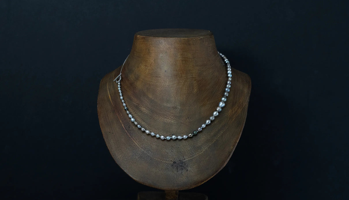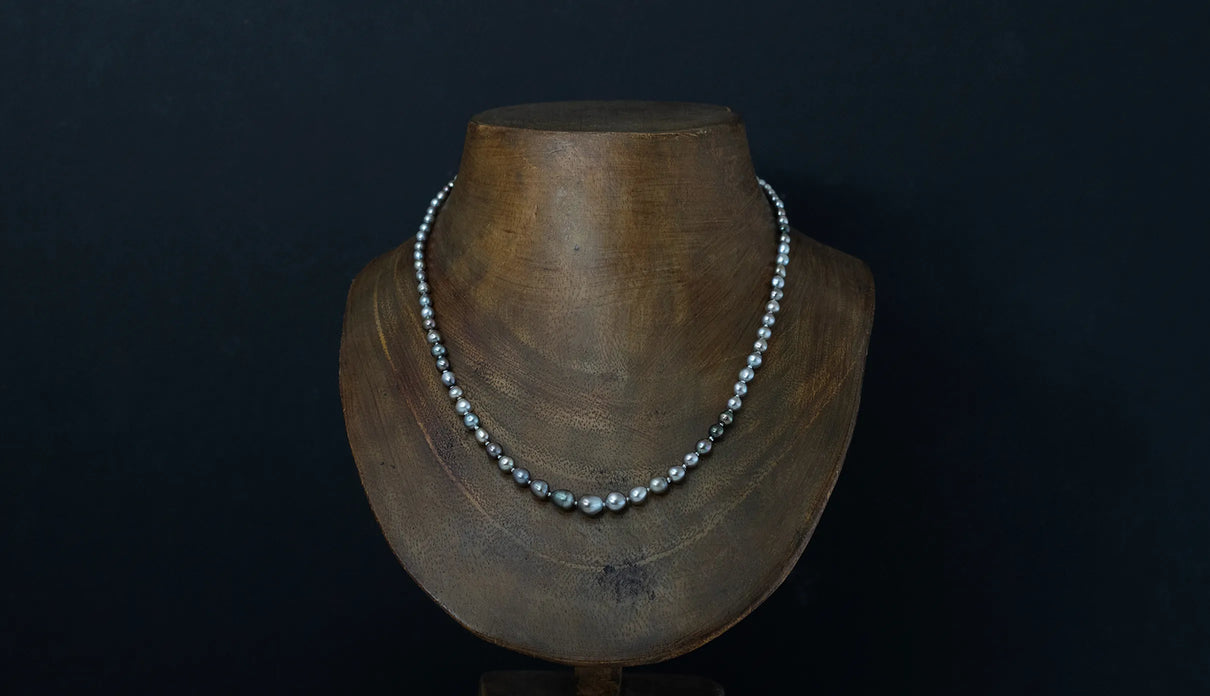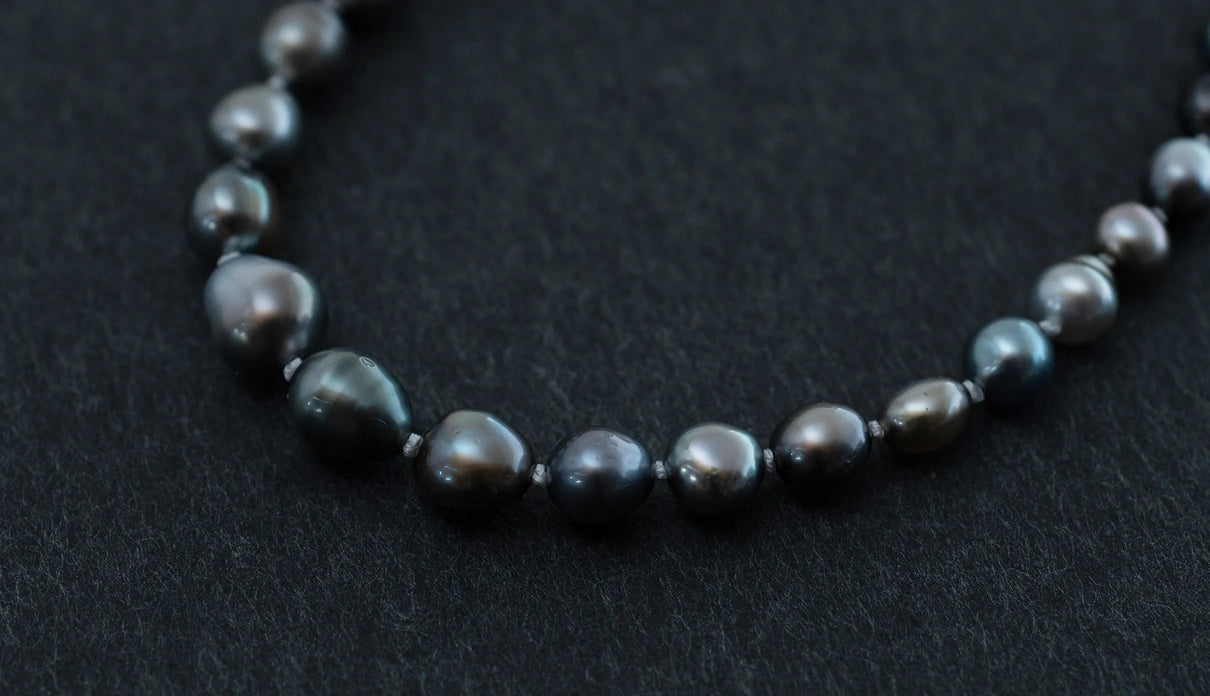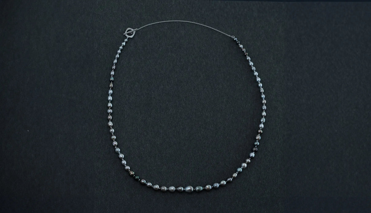 何色とも言い難い複雑で奥深い色彩と、洗練された美しさを放つタヒチパール。グラデーションのようにパールの粒感を絶妙に変えながら配したネックレスです。奥深く美しい照りが魅力的で、孔雀の羽のように、グレーの中に緑や青などの複雑な色味が虹色に艶めきます。フォーマルシーンだけでなく、日常の装いも華やかに演出してくれるデザインです。